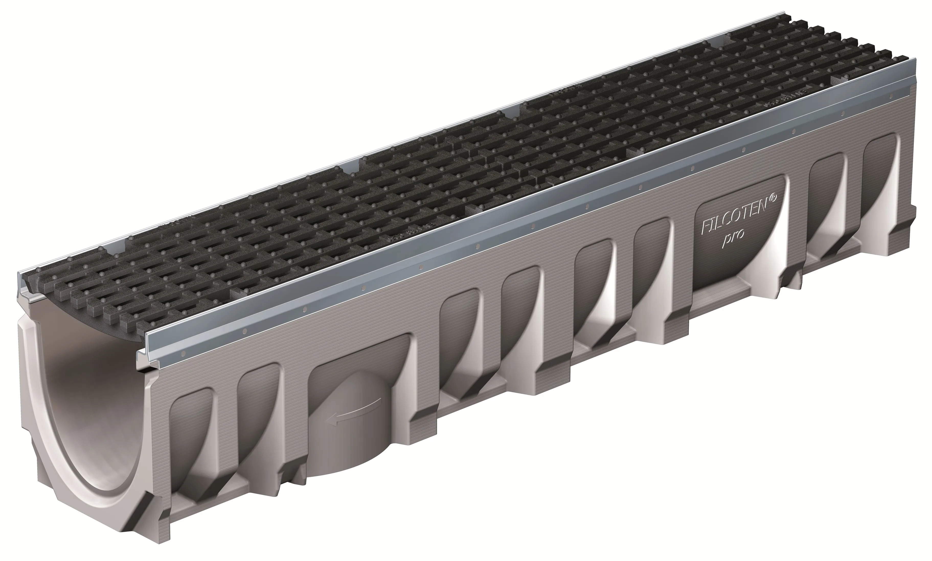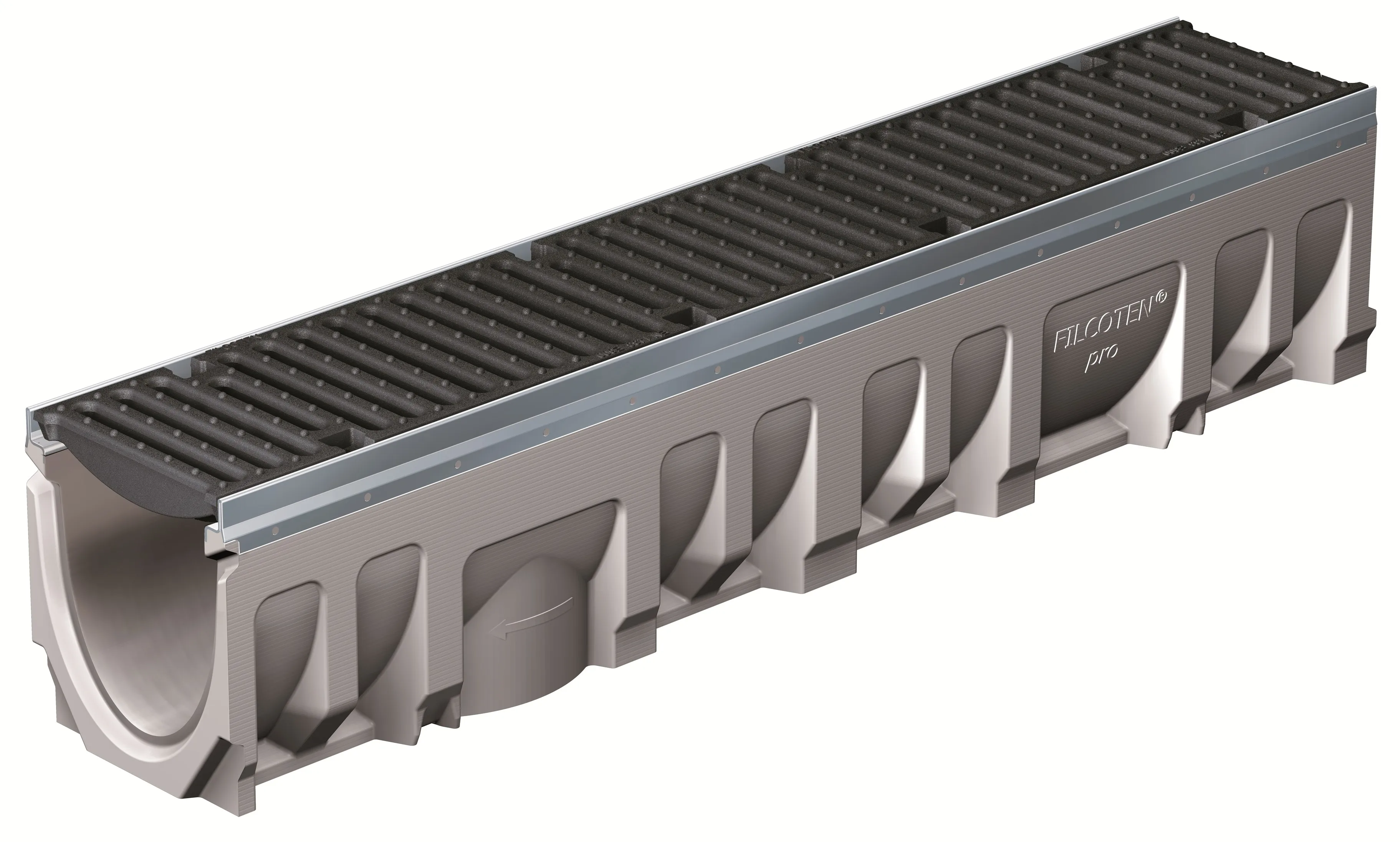 ряд дренажных каналовFilcoten Pro изготовлен из высокоэффективного фибро-армированного композитного бетона С защитным профилем из оцинкованной стали или ковкого чугунас толщиной кромки, подверженной движению, не менее 4 мм.