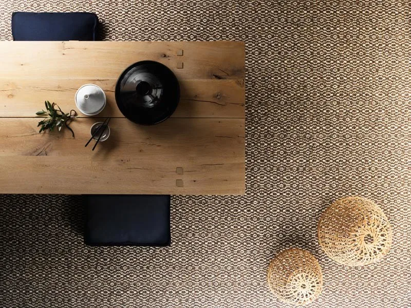 ковер из 65% шерсти и 35% льна, выполненный на заказ с геометрическим рисунком.цвета: перец 201, копье 301, Анисид 501, соль 801, имбирь 802. также возможно в ковровой версии.