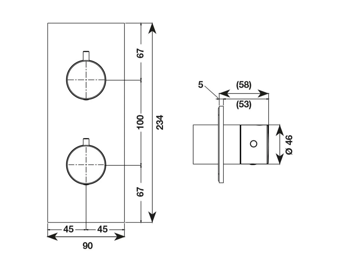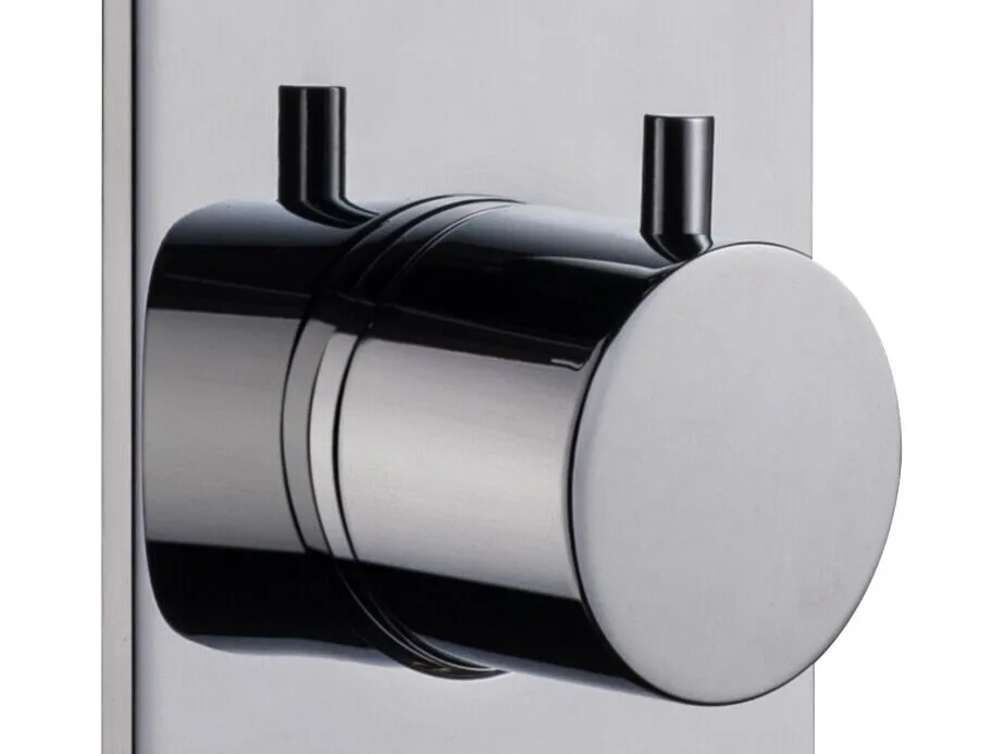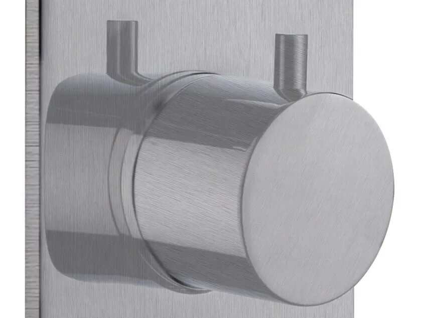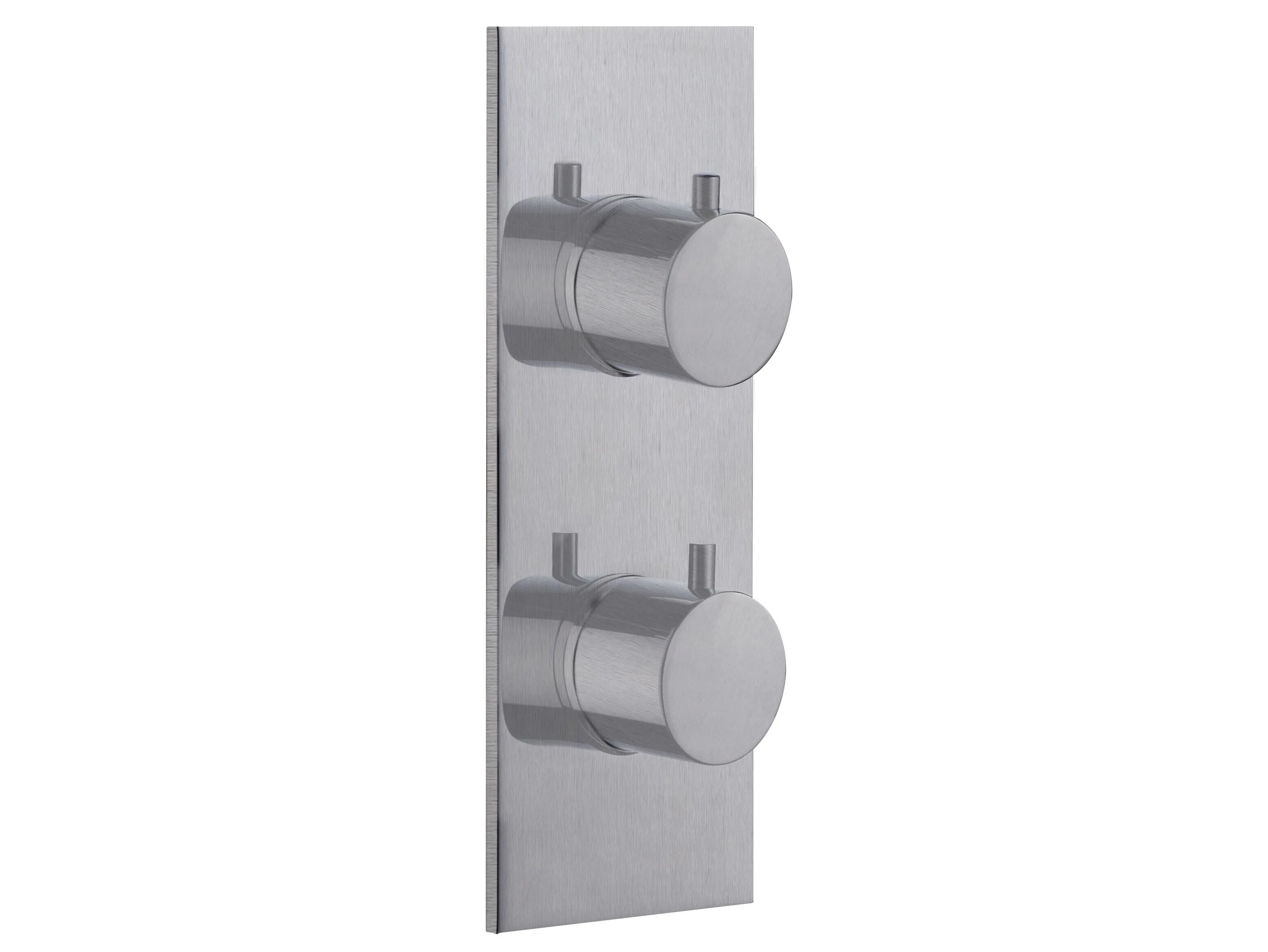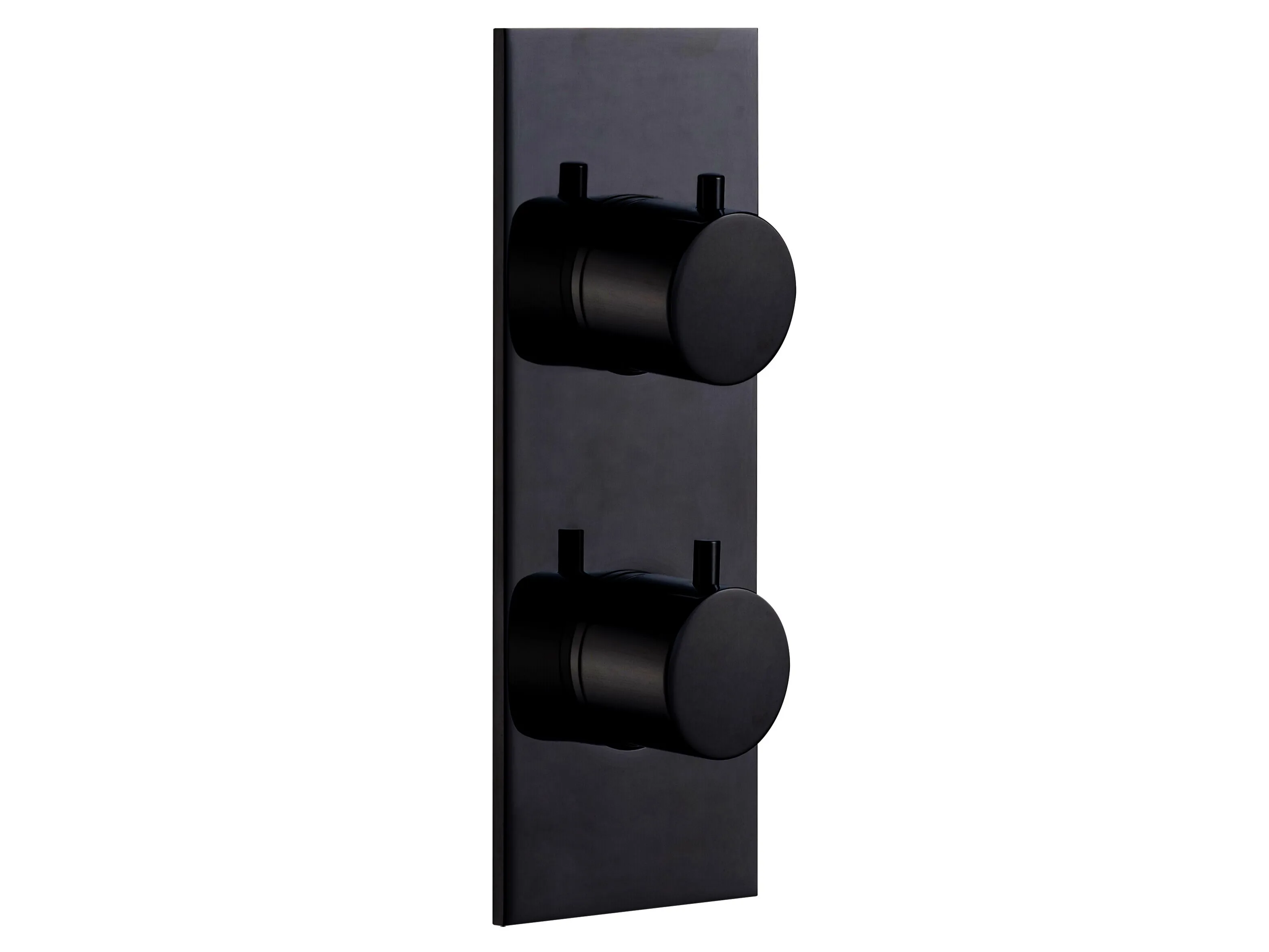 2-полосная вертикальная термостатическая внешняя часть с прямоугольной внешней пластиной минималистского дизайна. Латунные круглые рычаги с переключателем с поворотным рычагом.