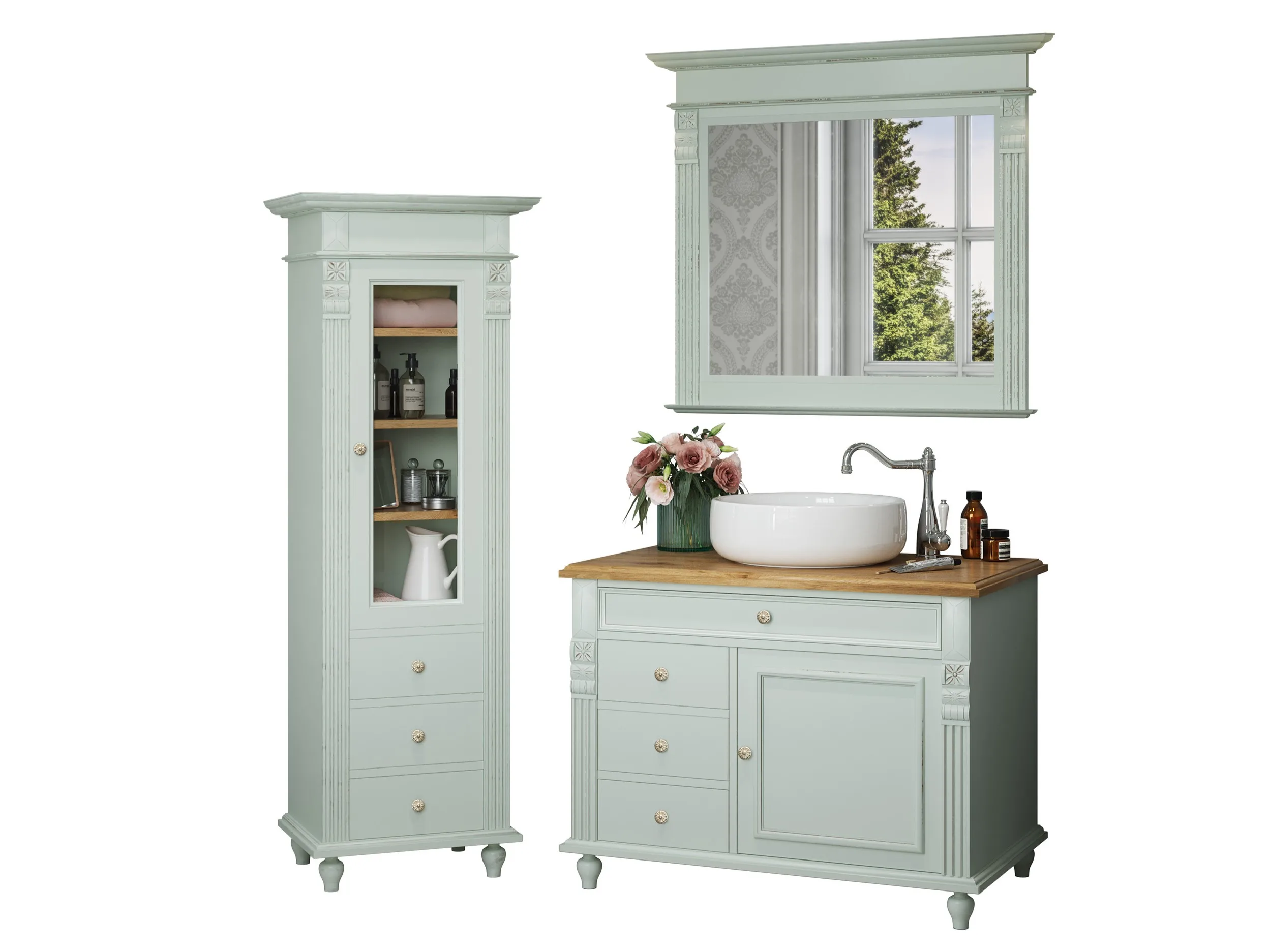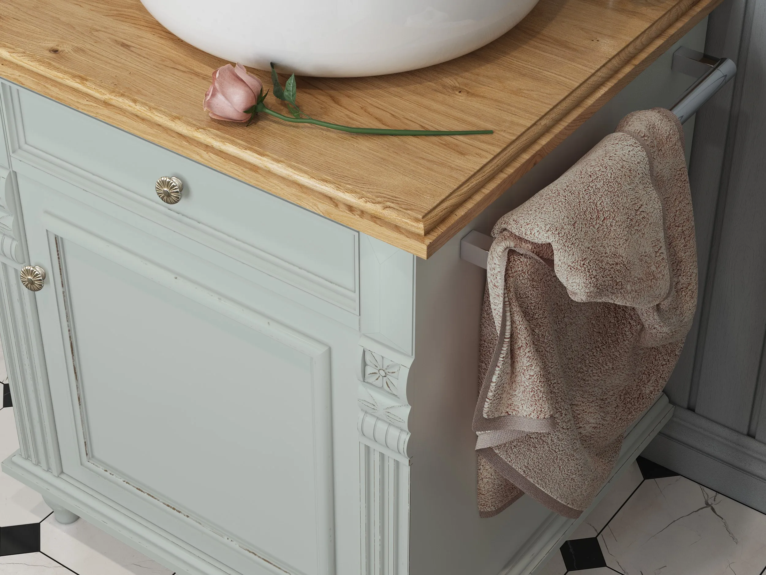 5150: состав ванной комнаты, включая базовый шкаф с 1 дверцей, 1 ящиком. Столешница из массива дуба, умывальник, туалетный столик, настенные бра и полотенцесушитель. Колонна с 3 ящиками и 1 створкой. Отделка 65B белый лак без старины.