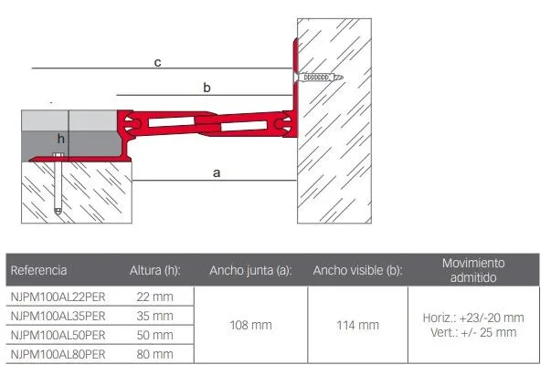 Novojunta Pro ® Metal 100-это профильная система, полностью изготовленная из алюминия, для установки в компенсационные швы до 100 мм. Благодаря своей конструкции, с шаровыми шарнирами, она позволяет осуществлять разнонаправленные движения. с противоскользящим полосатым лицом, это подходящая модель для транзитных зон, благодаря своей высокой грузоподъемности и износостойкости. Профиль предварительно смонтирован с помощью стяжек, которые удерживают фиксированное положение установки. доступен в натуральном цв...