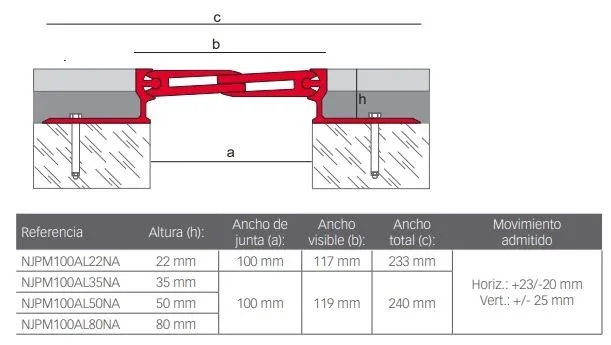 Novojunta Pro ® Metal 100-это профильная система, полностью изготовленная из алюминия, для установки в компенсационные швы до 100 мм. Благодаря своей конструкции, с шаровыми шарнирами, она позволяет осуществлять разнонаправленные движения.