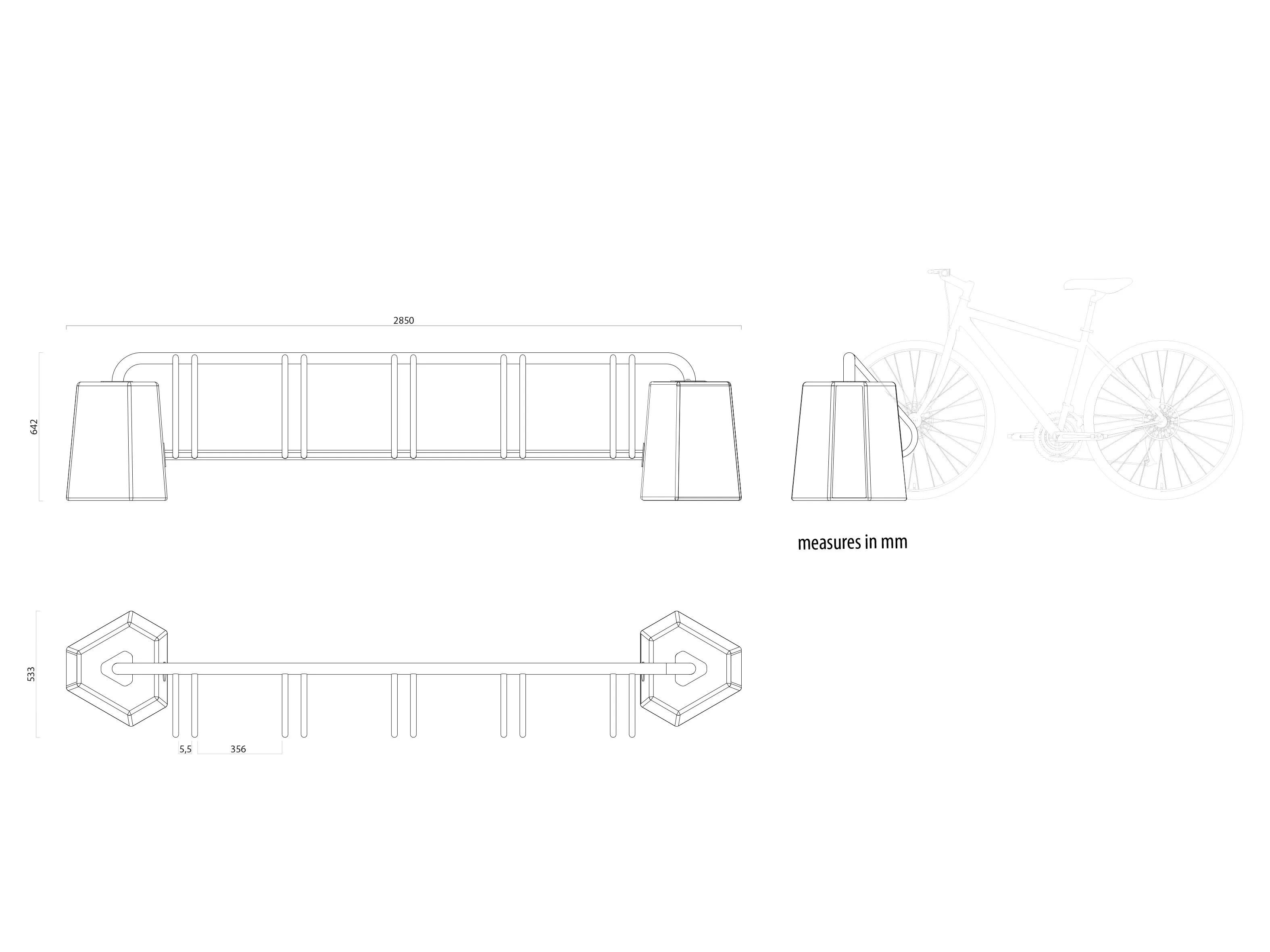 Castle представляет собой велосипедную стойку из металла и бетона. материал: - трубы из оцинкованной стали профиль: 40x20 мм; - парковочные элементы с трубами Ø25 мм; - CLS. особенности: - односторонний с пятью местами; - двусторонний с десятью местами.