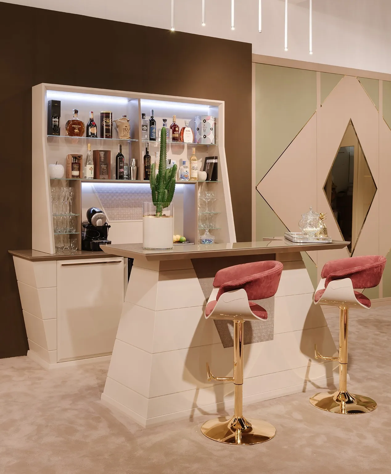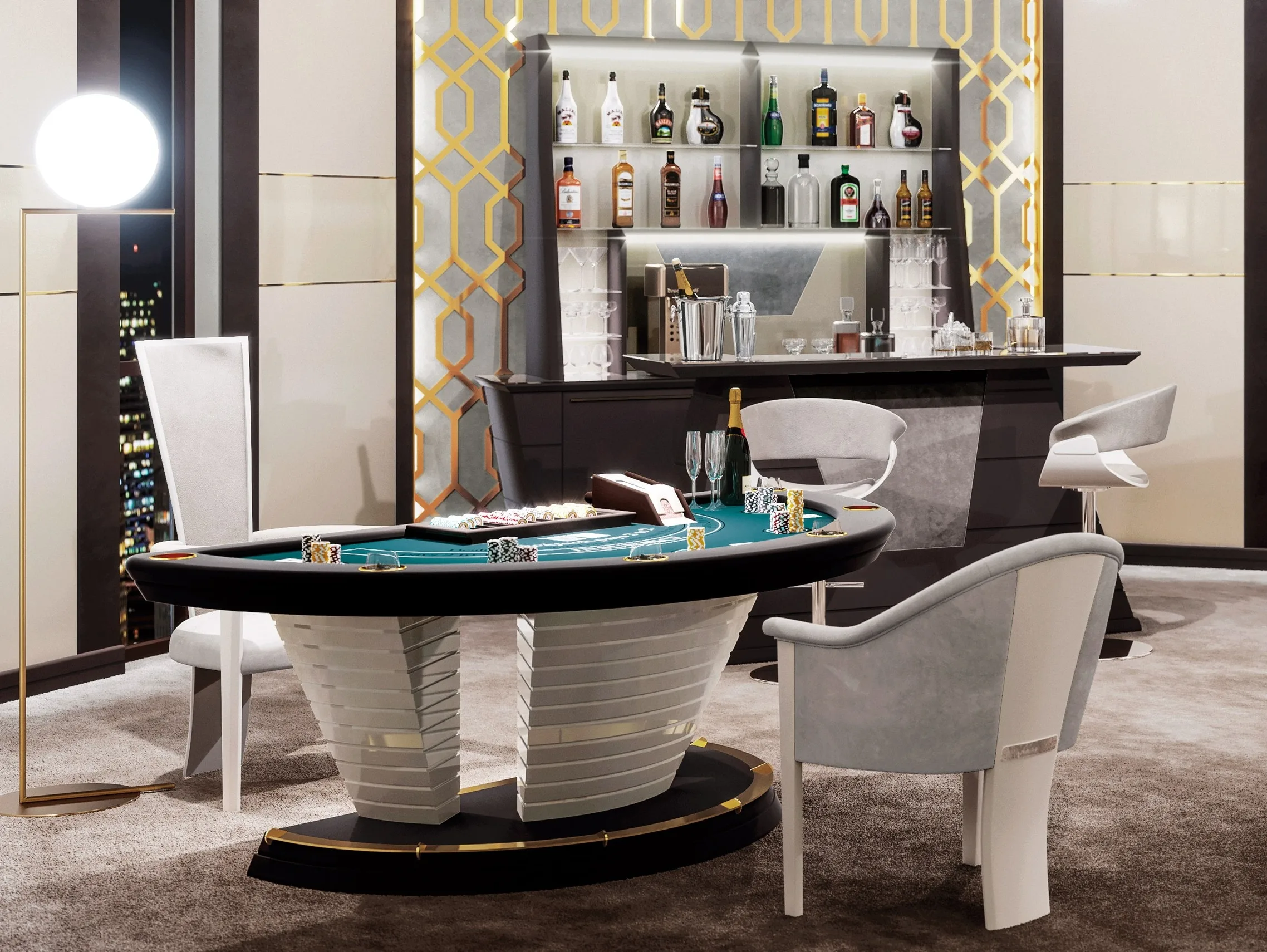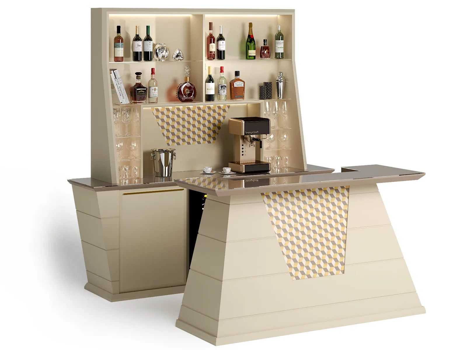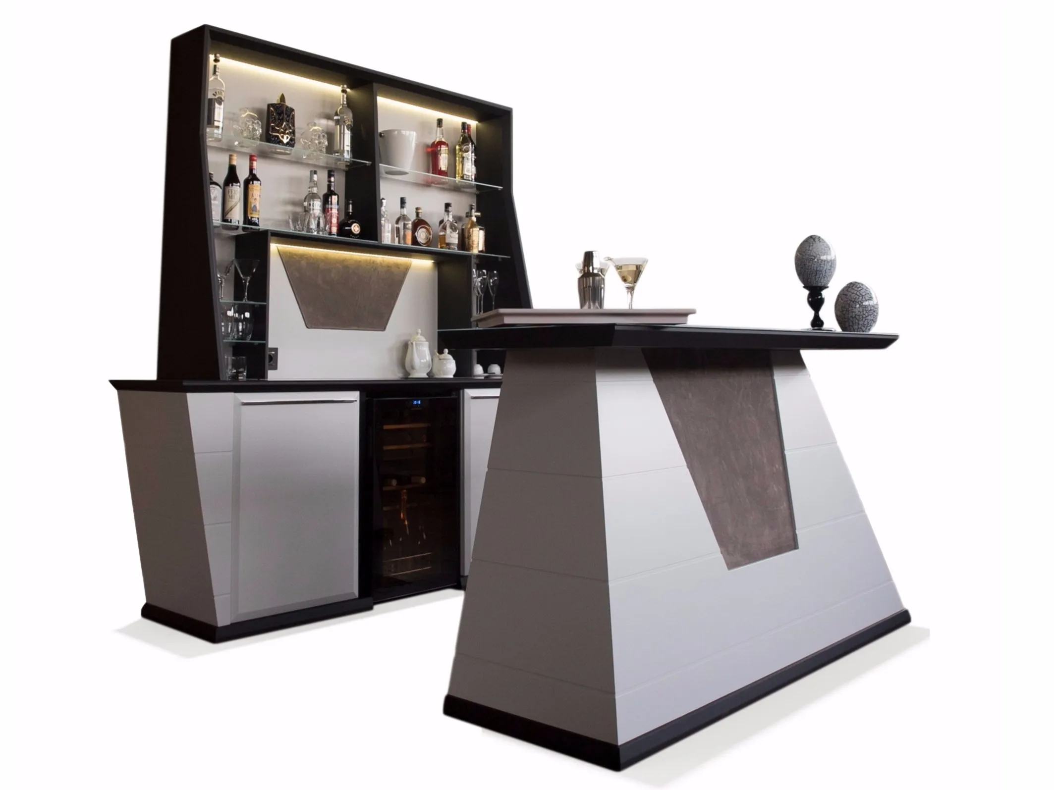 функциональность и эстетика прекрасно сочетаются в мобильном баре бесконечного класса и исключительной изысканности. Шкаф состоит из двух элементов: настенной конструкции и стойки. Первый оснащен полками из закаленного стекла и отсеками с мягкими закрывающимися дверцами. Рабочая ниша освещена светодиодными лампами, оснащена двумя электрическими розетками и украшена драгоценными материалами. Существует также возможность установки профессионального винного погреба с двойной температурой чтобы сохранить свои вина в лучшем виде и другие аксессуары, которые нужны клиенту. Стойка обогащена декоративной вставкой по вашему выбору; внутреннее пространство и столешница покрыты закаленным стеклом, которое придает ощущение легкости всей конструкции.