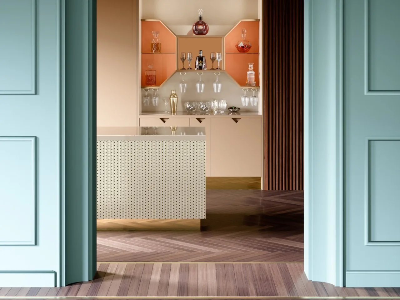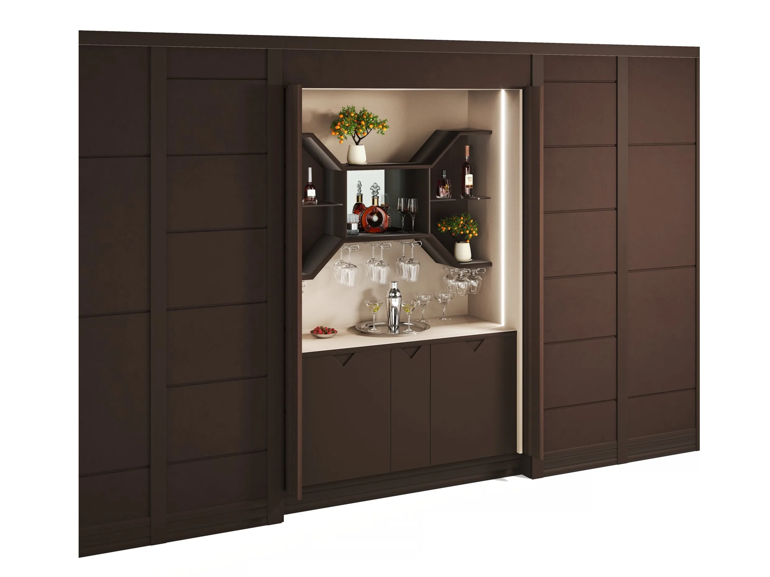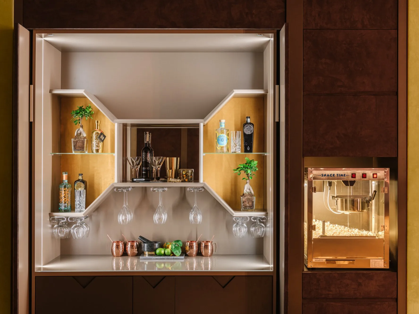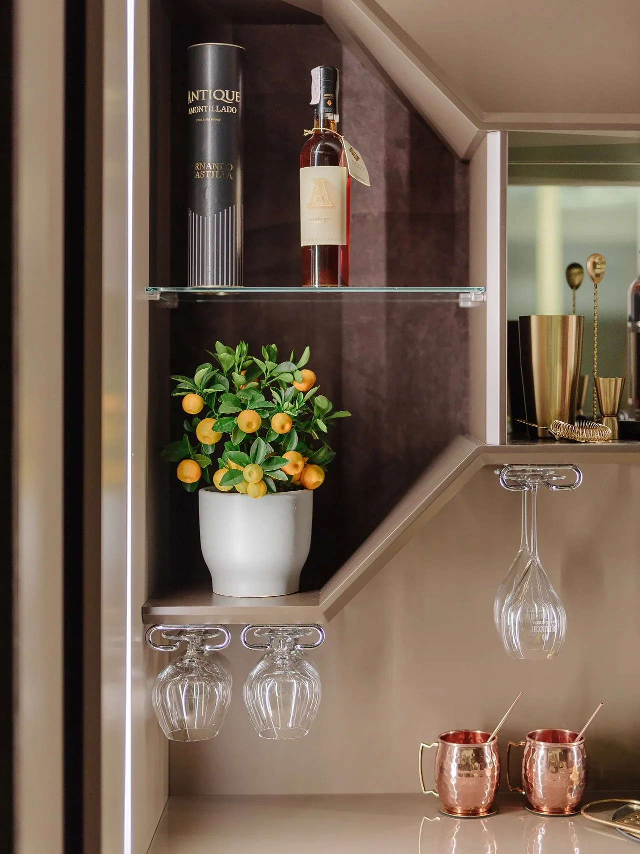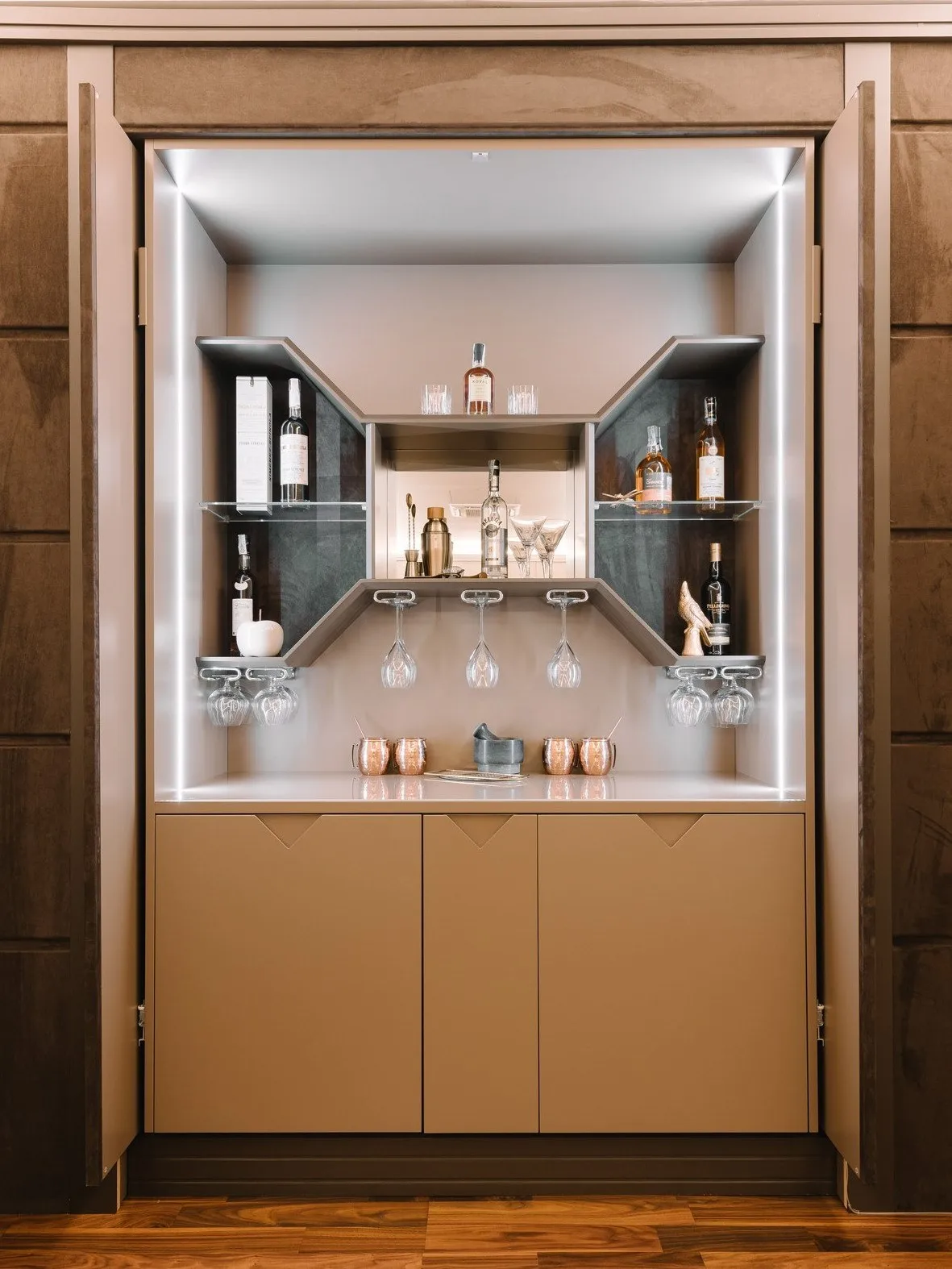 встраиваемые светильники и центральное зеркало освещают и дополняют барный шкаф, создавая эксклюзивную и изысканную атмосферу.