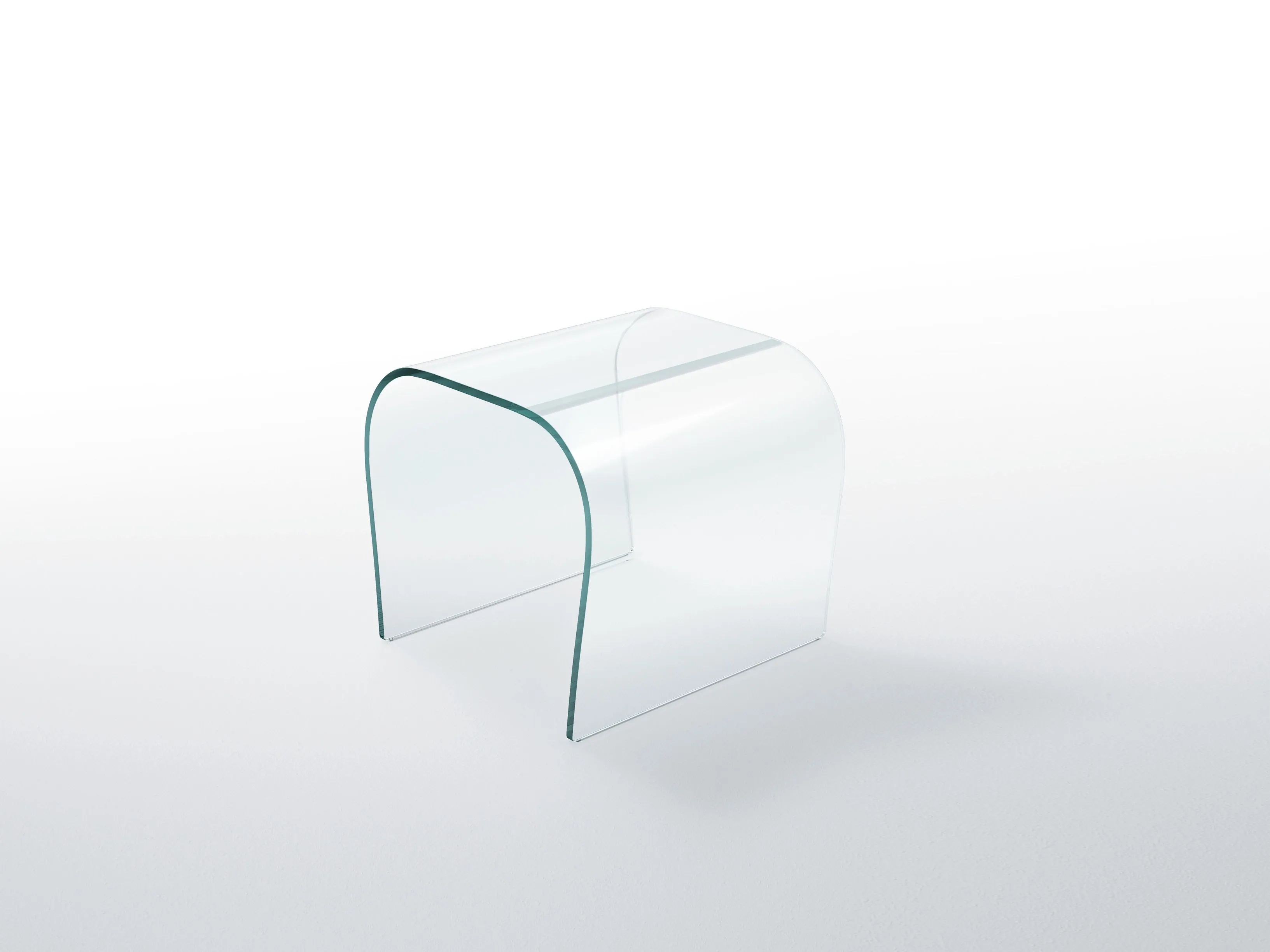 скамья и табурет с естественной простотой, выполненные из прозрачного хрусталя extralight 12 мм, очерченные и изогнутые.