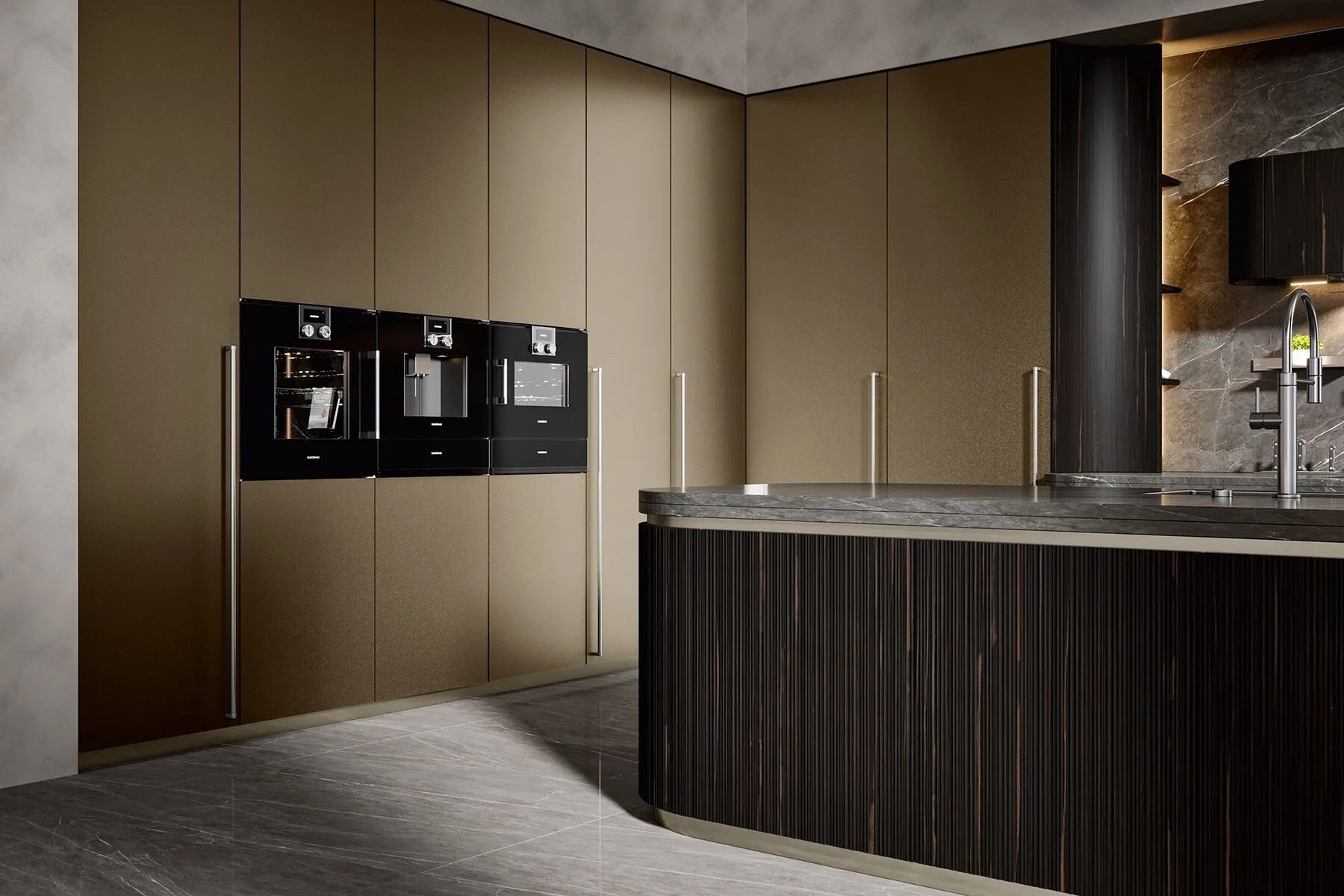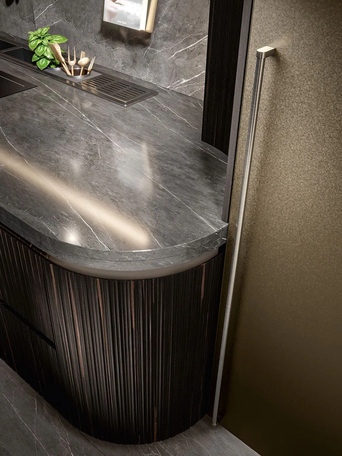 INCANTO 1.0, кухня модель Iris Ebony; модель Light алюминиевая альвеолярная бронзовая.