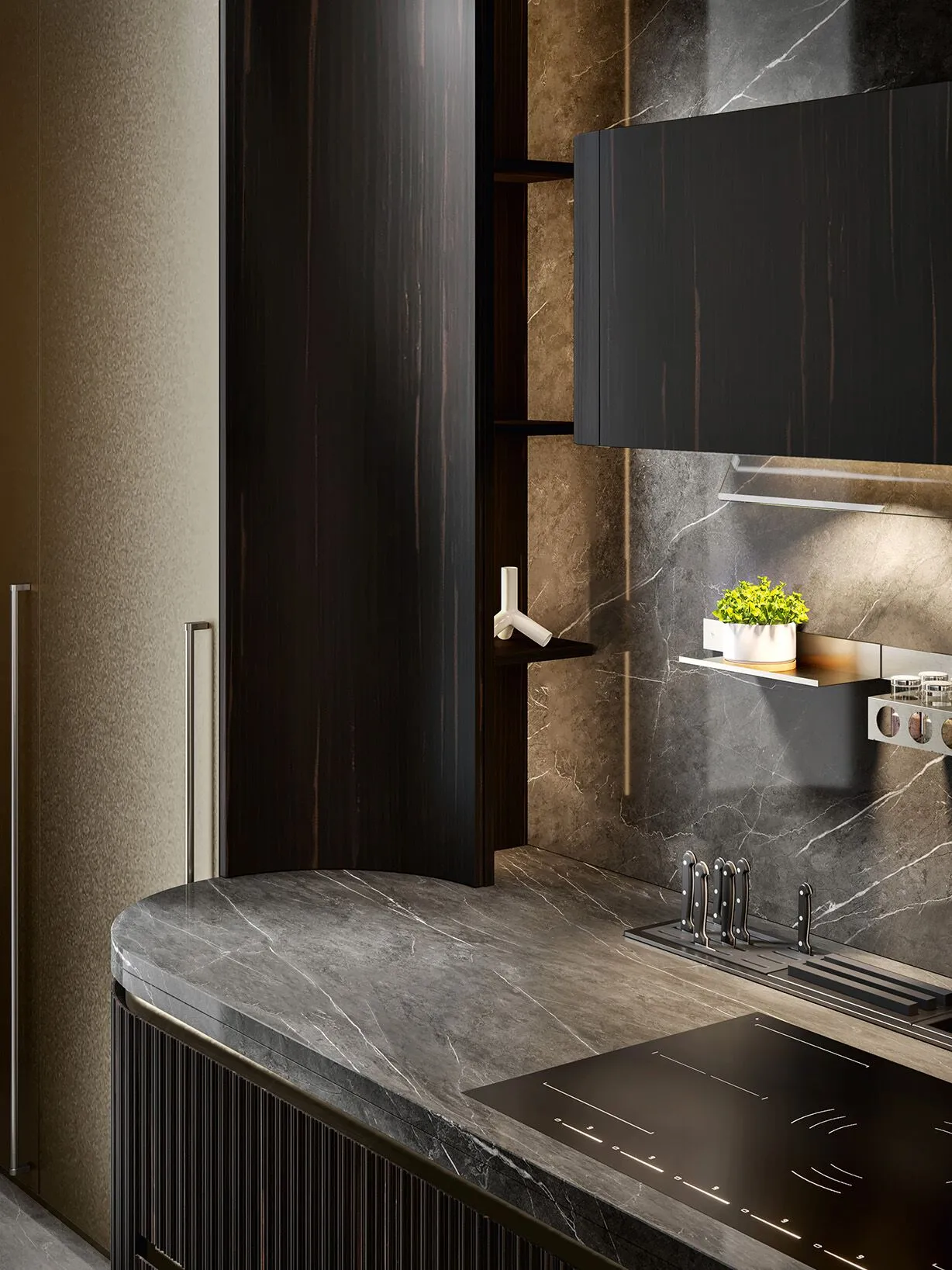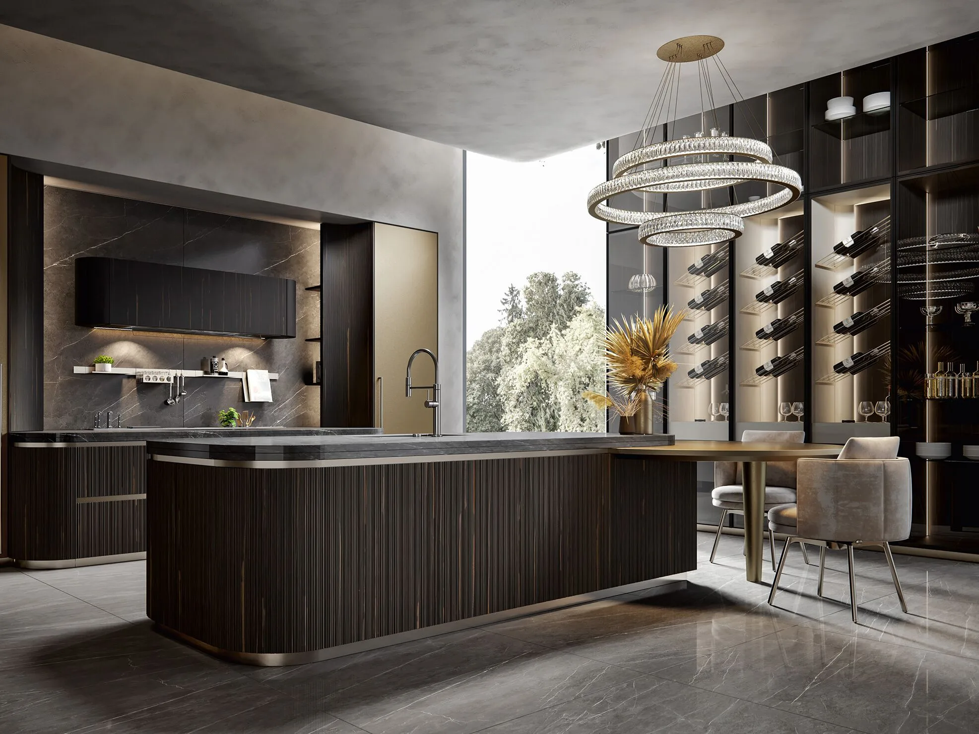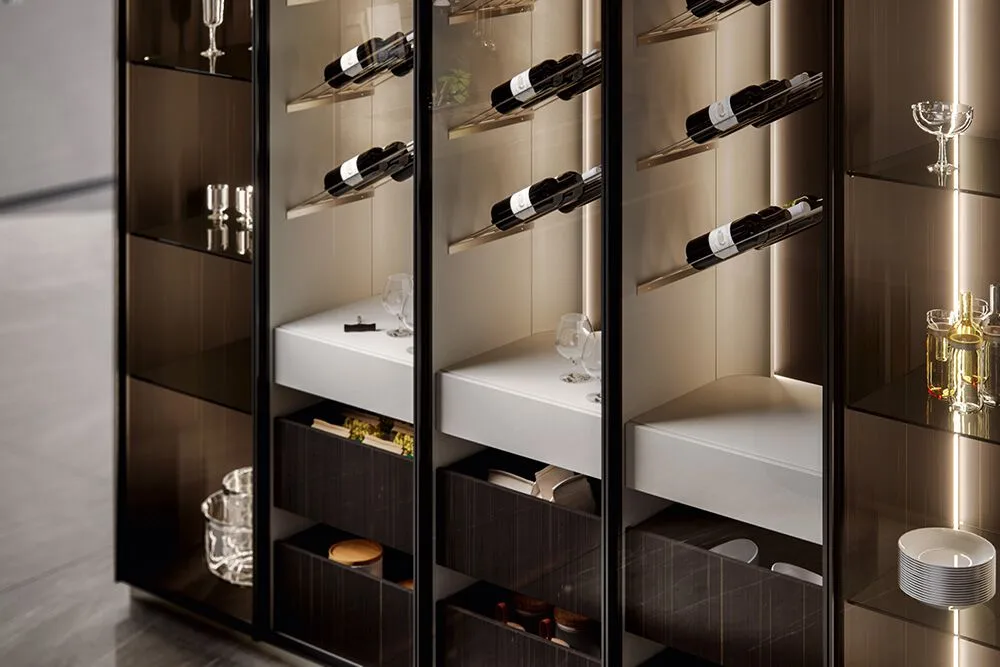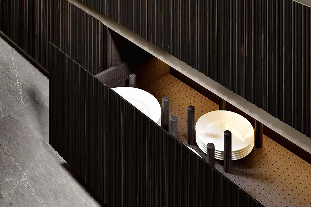 Incanto-это тщательно построенное выражение изысканной красоты, модель, сочетающая функциональность с настоящим архитектурным стилем. Очарование оставляет свой след, поражает и делает роскошь своей отличительной чертой. На этой кухне дерево и металл подвергаются современному перечитыванию, способному трансформировать объемы. Главный герой этой композиции-створка Iris, дверца из черного дерева с особым угловым фрезерованием, способная реализовать уникальную геометрию. Интересно сочетание различных геометрий, в дополнение к линейным фрезерованным дверям были созданы изогнутые элементы, способные придать тон и элегантность. Рациональность, исследования и эргономика акцентируют этот проект на ритме элегантности. Колонны в полный рост с инновационными альвеолярными алюминиевыми створками, прочными и легкими, касаются потолка, становясь неотъемлемой частью среда с высоким эстетическим воздействием. Витрина двойной высоты выполнена из темной эссенции, со стеклянными дверцами и центральным элементом в лакированной отделке росы, которая подчеркивает элегантные держатели для бутылок.