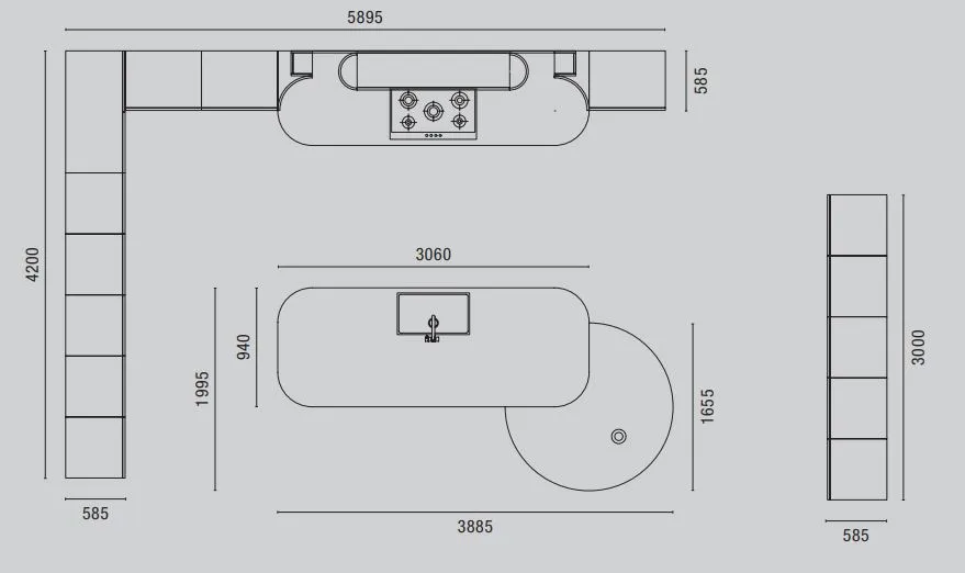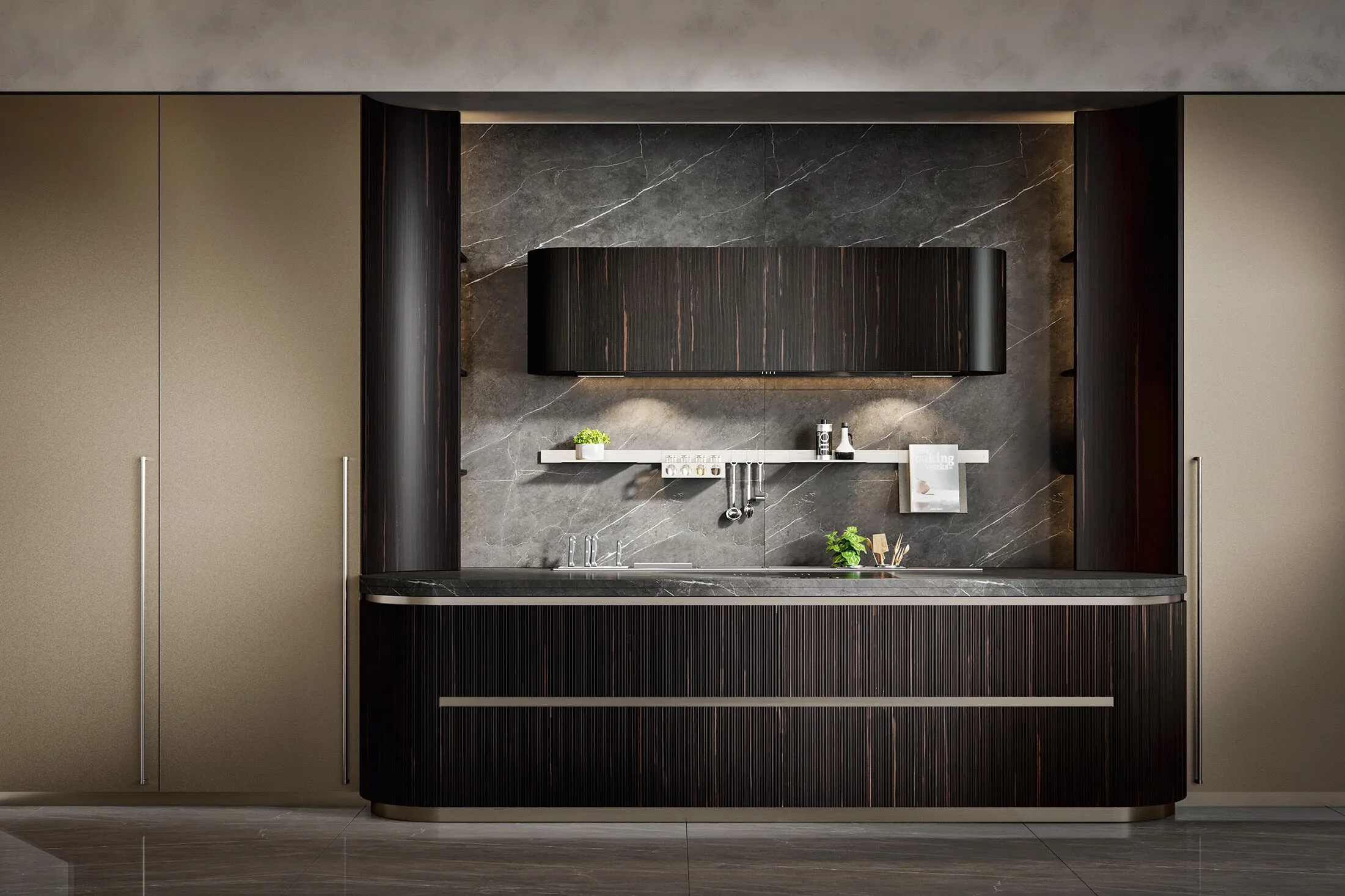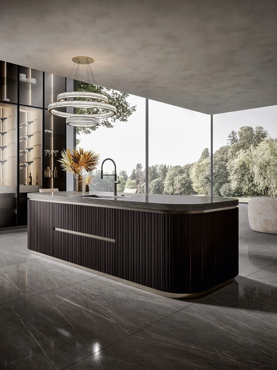 Incanto-это тщательно построенное выражение изысканной красоты, модель, сочетающая функциональность с настоящим архитектурным стилем. Очарование оставляет свой след, поражает и делает роскошь своей отличительной чертой. На этой кухне дерево и металл подвергаются современному перечитыванию, способному трансформировать объемы. Главный герой этой композиции-створка Iris, дверца из черного дерева с особым угловым фрезерованием, способная реализовать уникальную геометрию. Интересно сочетание различных геометрий, в дополнение к линейным фрезерованным дверям были созданы изогнутые элементы, способные придать тон и элегантность. Рациональность, исследования и эргономика акцентируют этот проект на ритме элегантности. Колонны в полный рост с инновационными альвеолярными алюминиевыми створками, прочными и легкими, касаются потолка, становясь неотъемлемой частью среда с высоким эстетическим воздействием. Витрина двойной высоты выполнена из темной эссенции, со стеклянными дверцами и центральным элементом в лакированной отделке росы, которая подчеркивает элегантные держатели для бутылок.