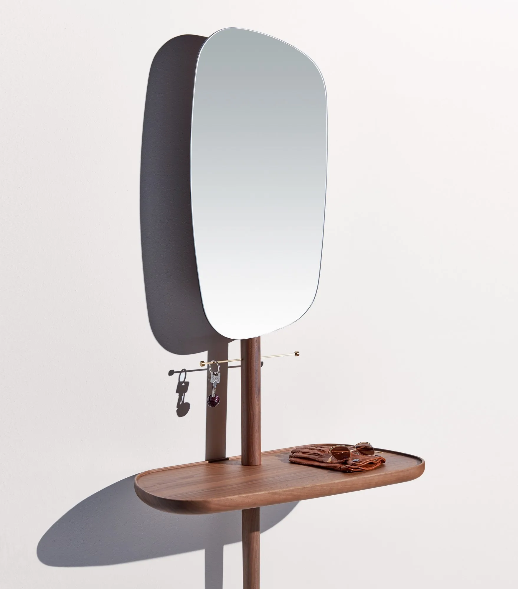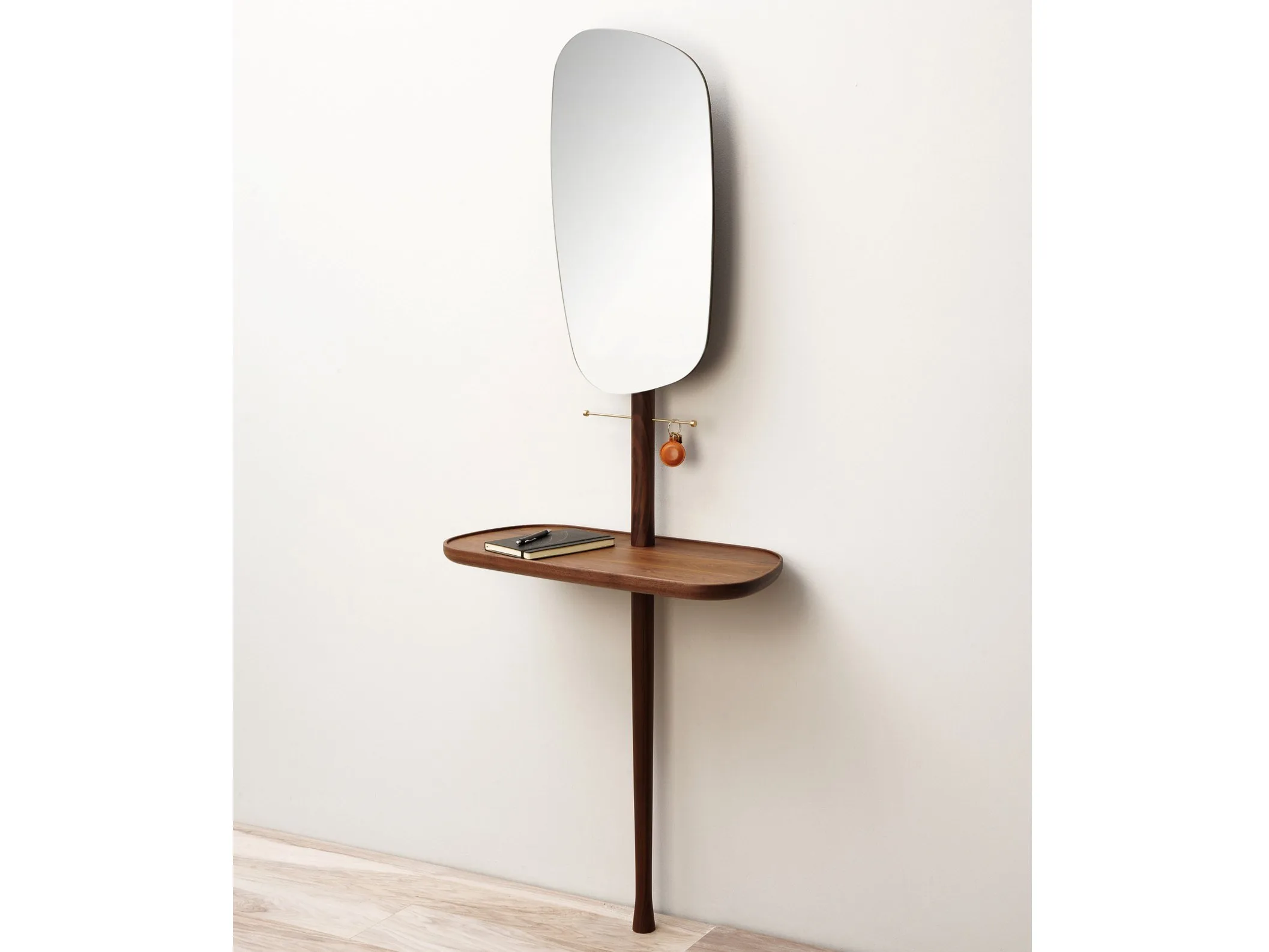 MOMENTS - это прихожая из орехового дерева, элегантная и уютная вещь, подходящая для дома или гостиничного номера. Органические формы зеркала и подноса определяют вспомогательный предмет мебели, который привносит индивидуальность в любую заниженную комнату. Включите металлический стержень, чтобы повесить ключи.