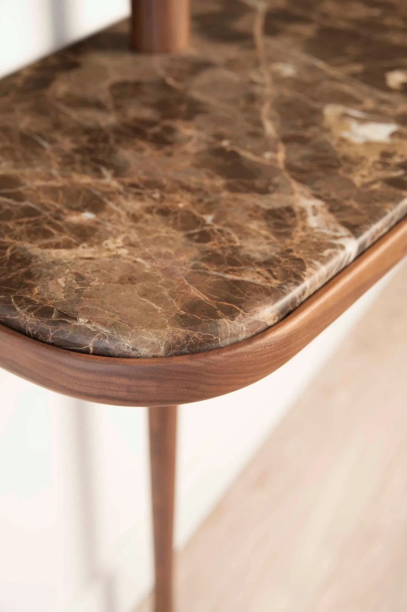 Moments - это прихожая из ореха и мрамора Emperador. Органические формы зеркала и подноса придают индивидуальность любой заниженной комнате. Включите металлический стержень, чтобы повесить ключи. также доступен в черном Ясене и мраморе Sahara Noir (COBMS).