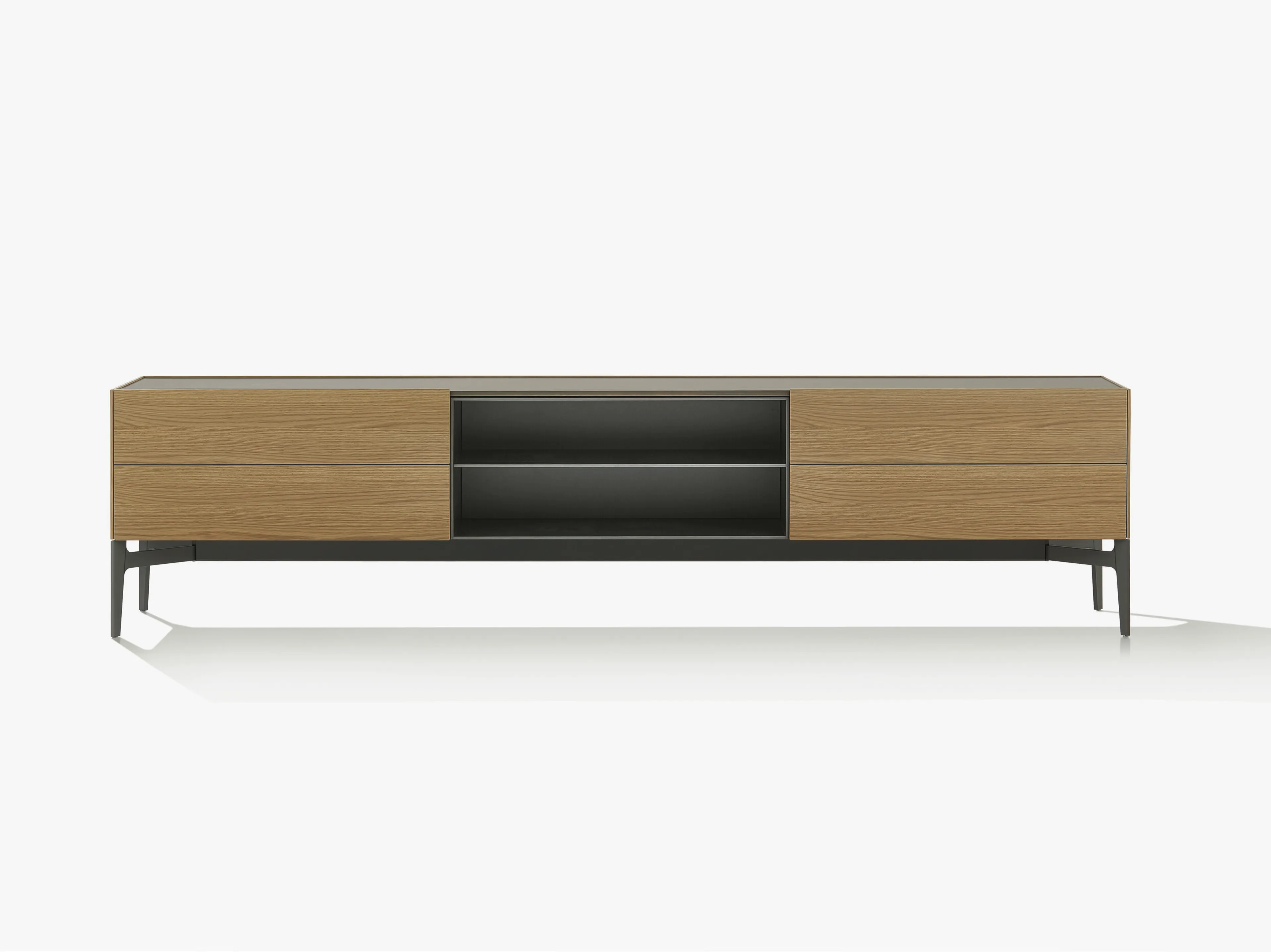 серия шкафов со стеклянными или деревянными распашными дверцами, откидными дверцами, выдвижными ящиками двух высот и открытыми отсеками.