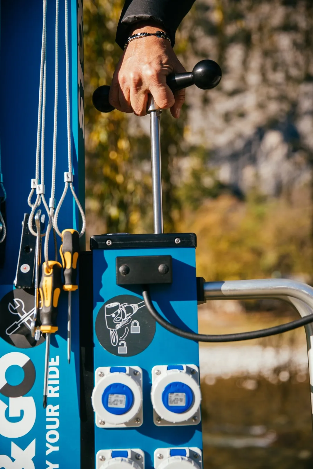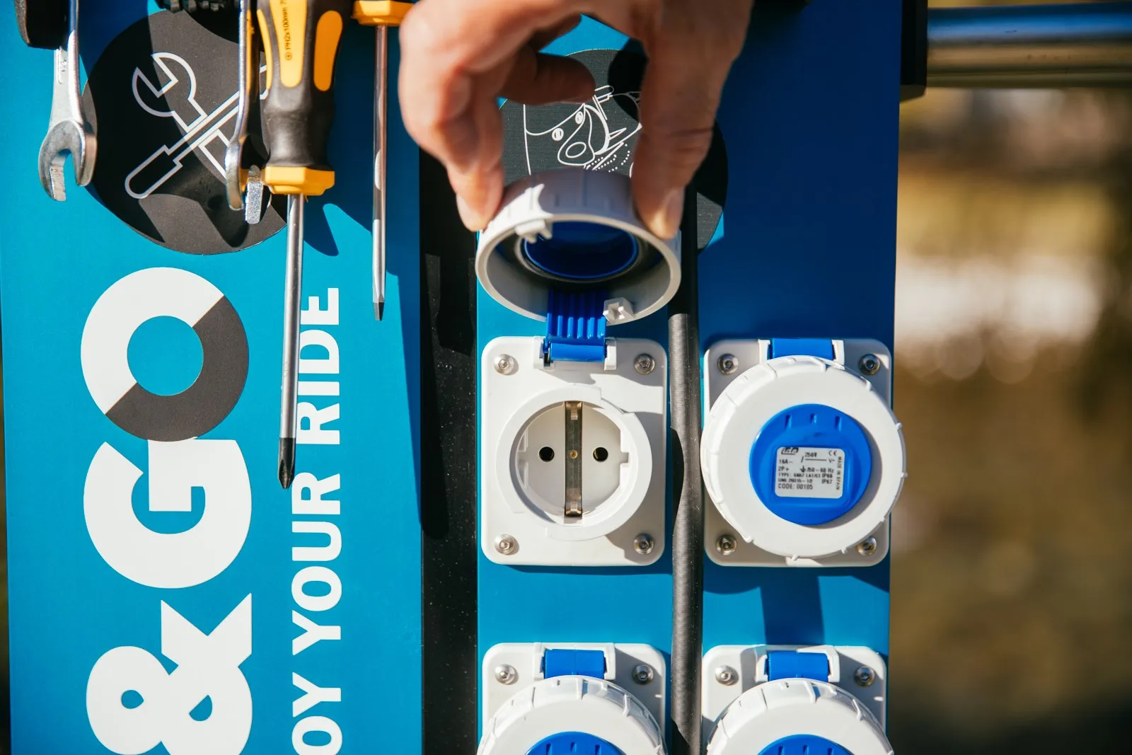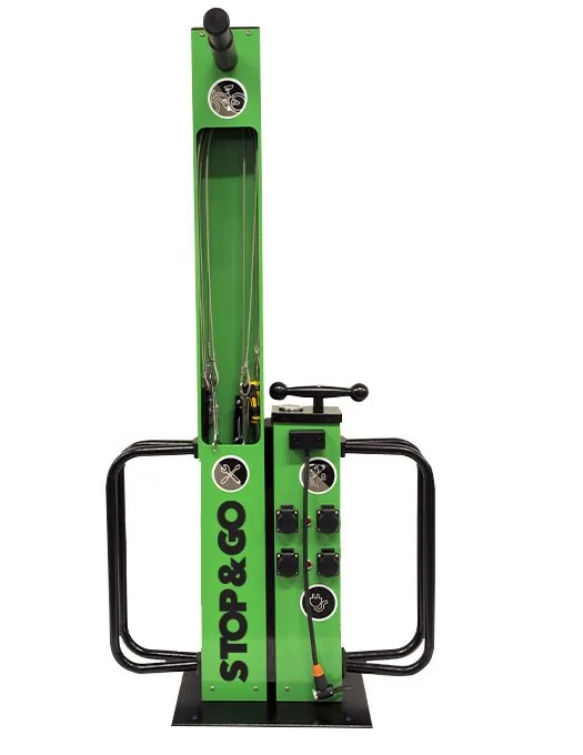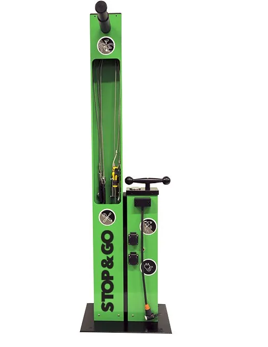 E-Stop&Go -это стойка для обслуживания велосипеда с 2 розетками Schuko для электронного велосипеда. Оснащен инструментами для технического обслуживания и универсальным насосом для накачивания шин.