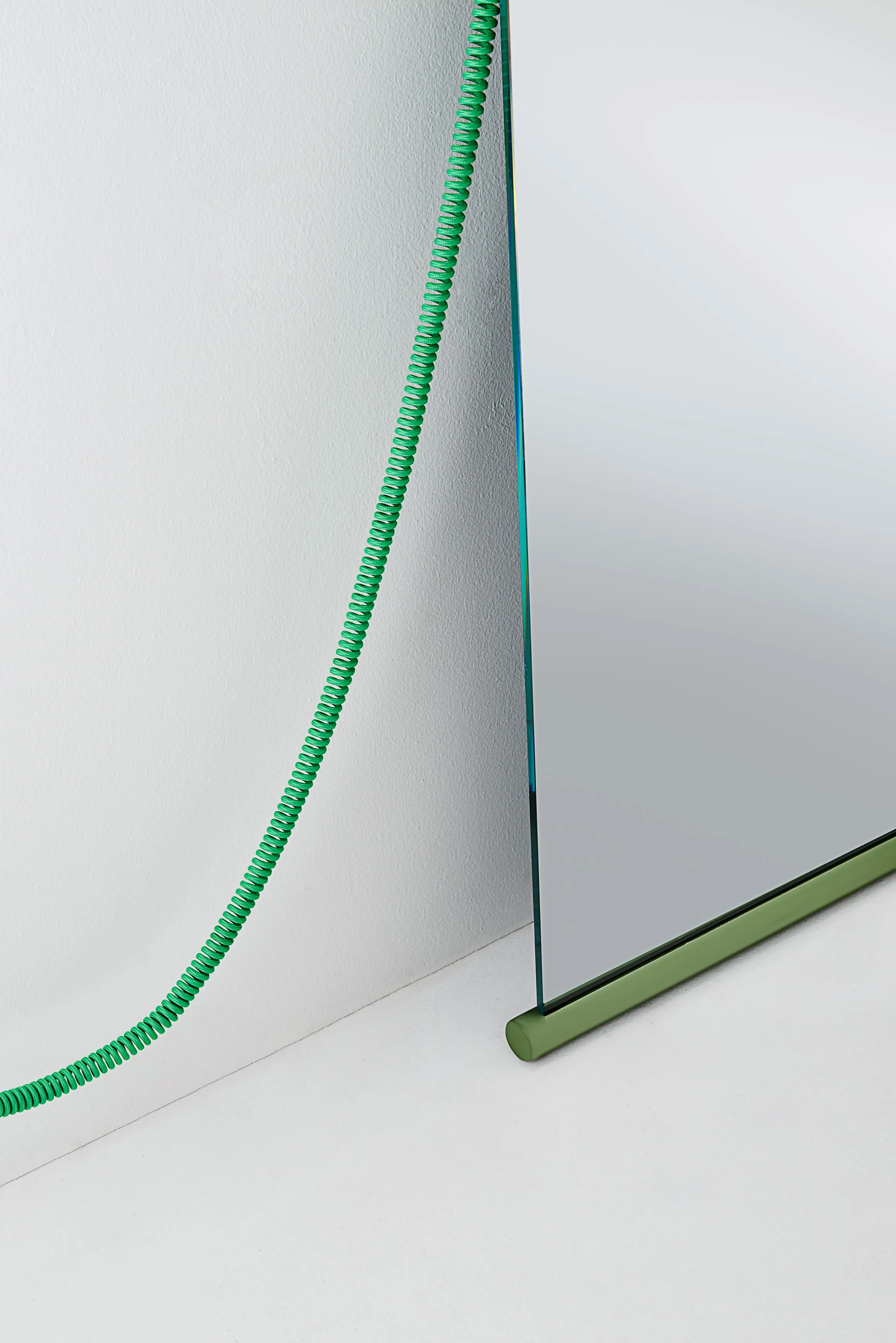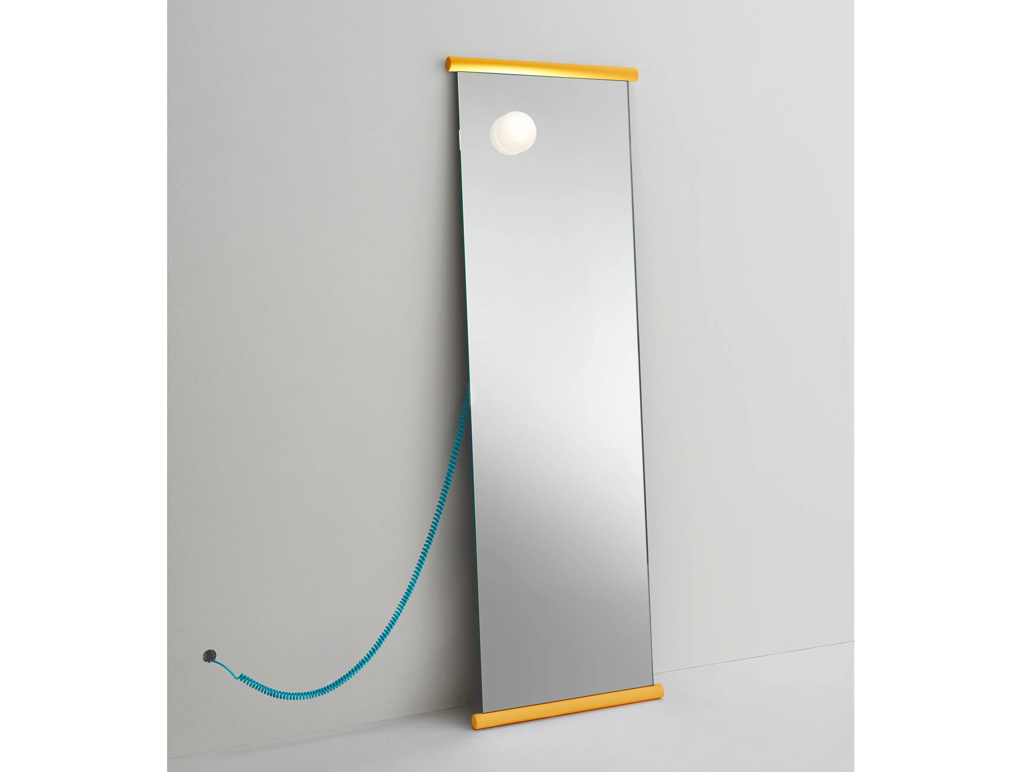 Ecco это напольное зеркало из хрусталя extralight mm 12, отделанное на верхнем и Нижнем концах двумя цилиндрическими стержнями из резины желтого, зеленого или черного цвета или из полированного хромированного металла.