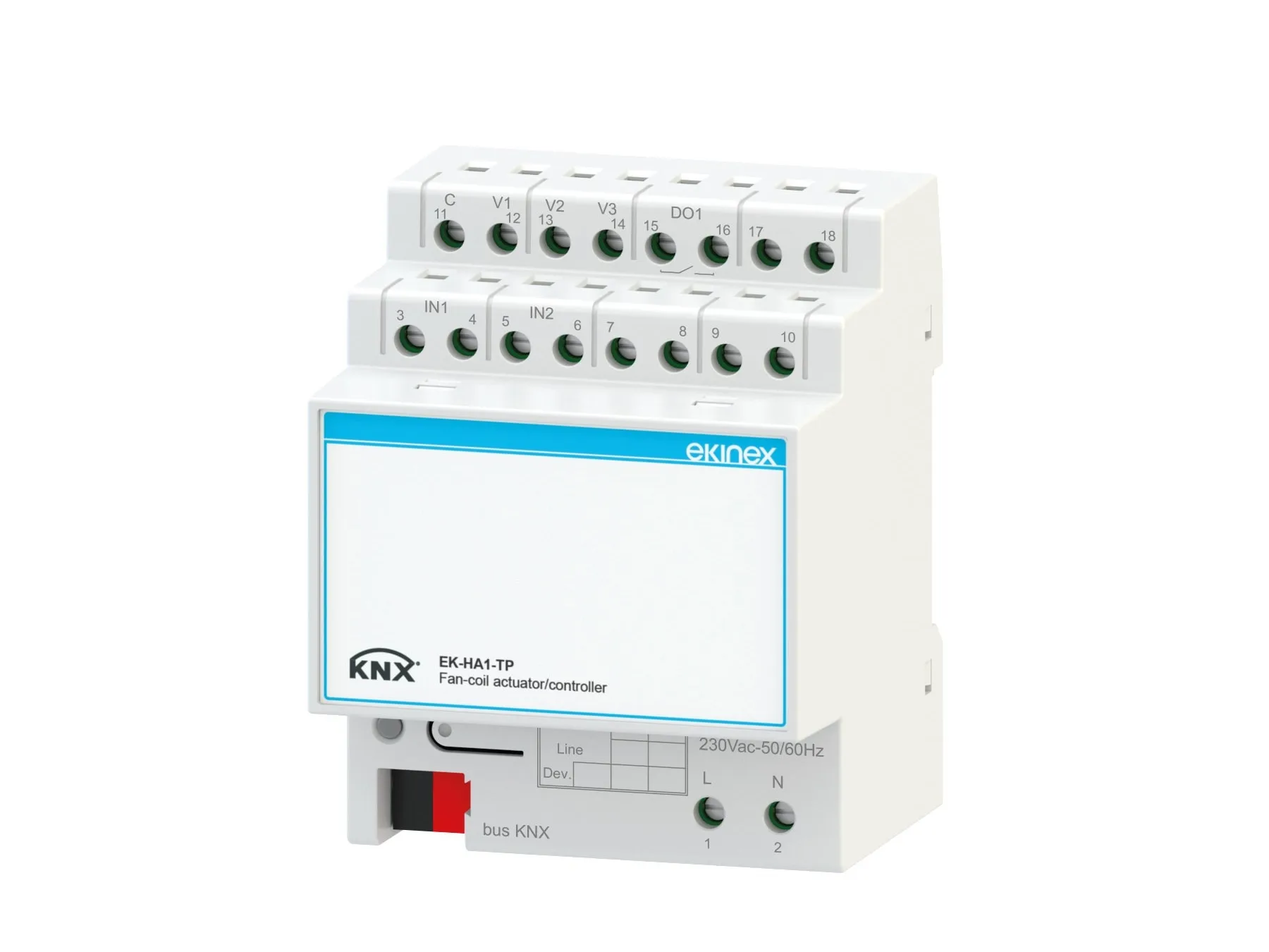 привод/контроллер Ekinex®EK-HA1-TP позволяет управлять блоком вентилятора для кондиционирования воздуха в помещении. Устройство может выполнять функцию простого привода в сочетании с комнатным термостатом KNX или регулятором / приводом с получением значения температуры от окружающего зонда KNX или датчика, подключенного к аналоговому входу.