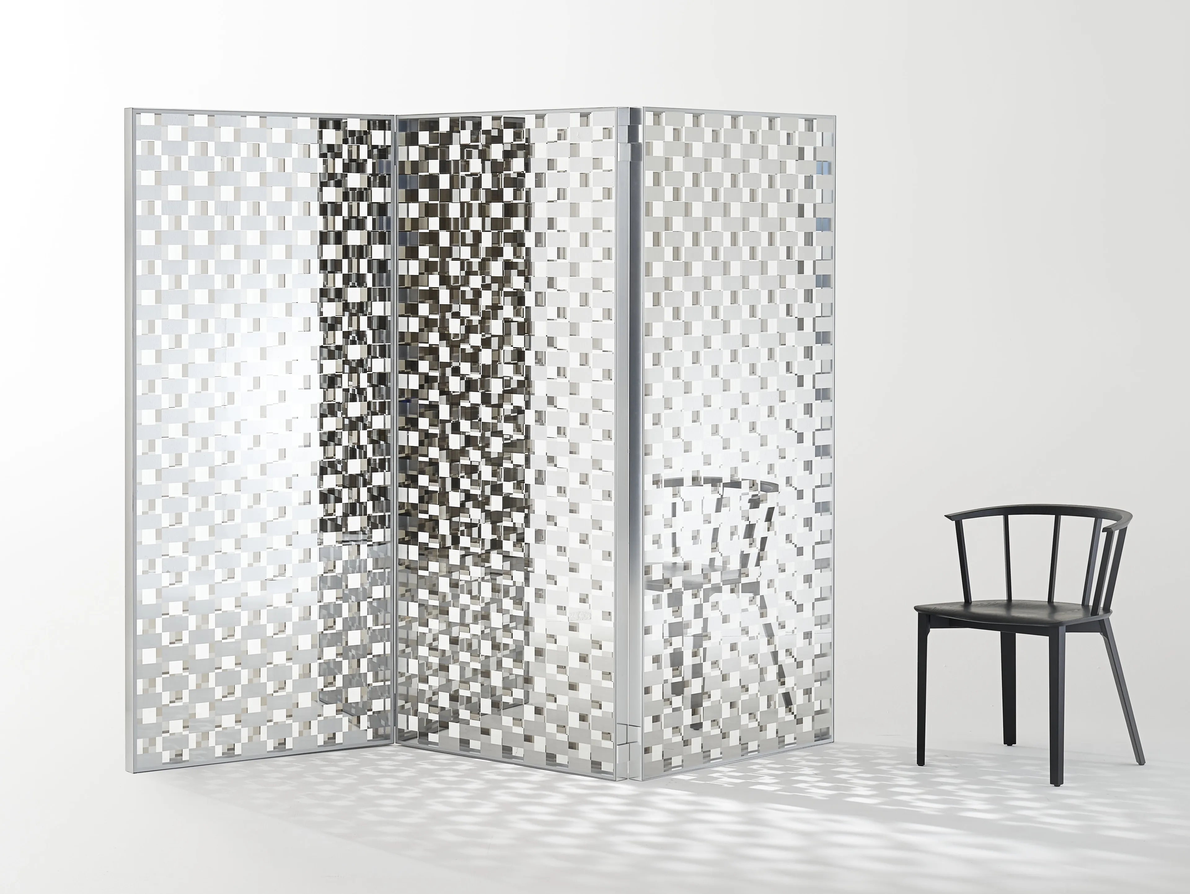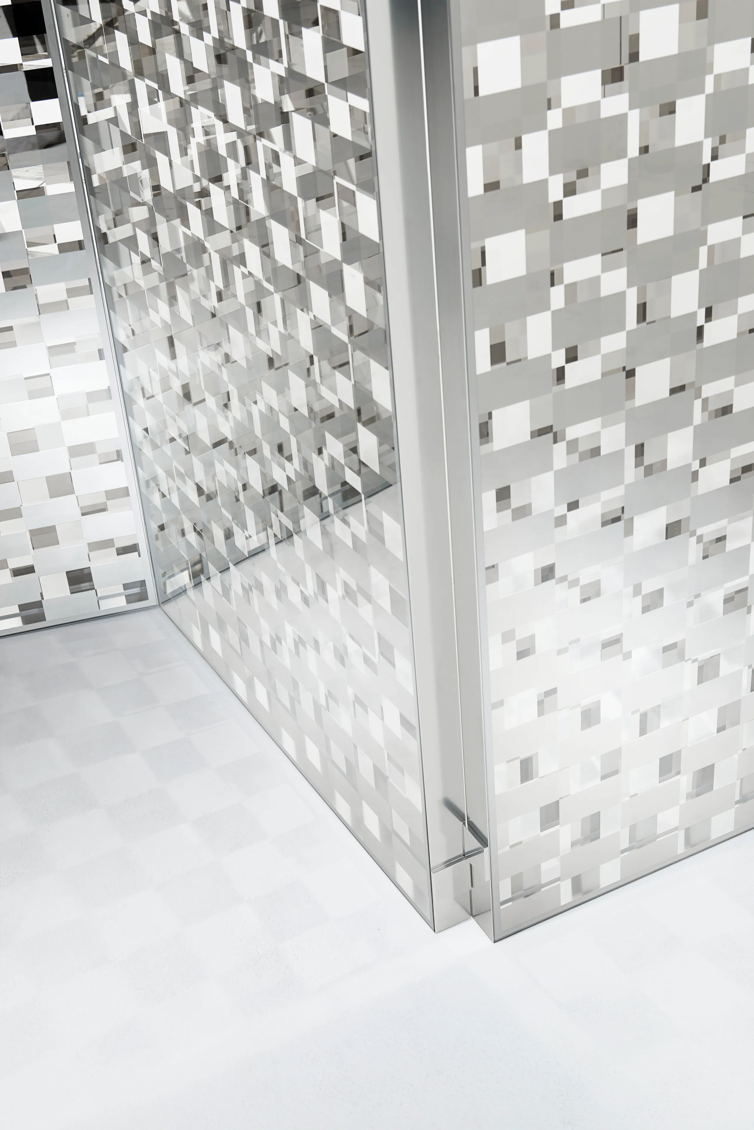 Fragment представляет собой коллекцию высоких столов, низкого стола и прозрачного прозрачного прозрачного прозрачного стекла с особым прямоугольным клетчатым декором в двухстороннем зеркале. Два кристалла с перпендикулярно ориентированными шахматными досками нанесены на две стороны рамки из алюминия, блестящего серебром, оставаясь разделенными промежутком в несколько сантиметров. Таким образом, создается игра зеркал, покрытий и прозрачностей, которые обманывают наблюдателя, маскируя и путать отраженные об...