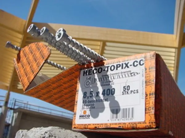 Heco-TOPIX-CC CombiConnect 489a это винт с двойной резьбой для структурных соединений дерево – дерево, а также для армирования деревянных балок и опор.