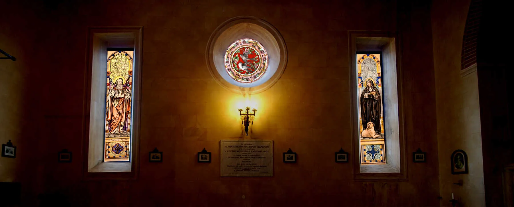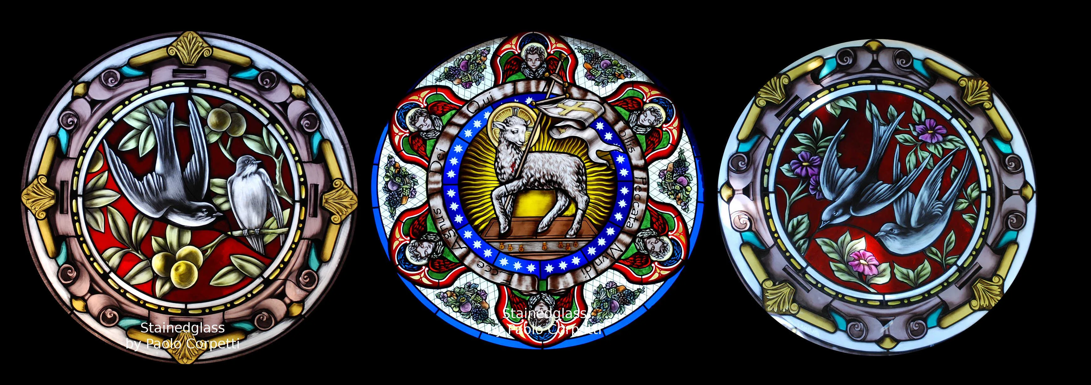 был сделан витраж для окна-окна (Agnus Dei), монофонические окна (Sant'Antonio Abate, San Pietro, Santa Marta и Sante Caterina), два небольших иллюминатора с изображением ласточек и цветов. В последнем-витражи апсиды с лентами и цветами.