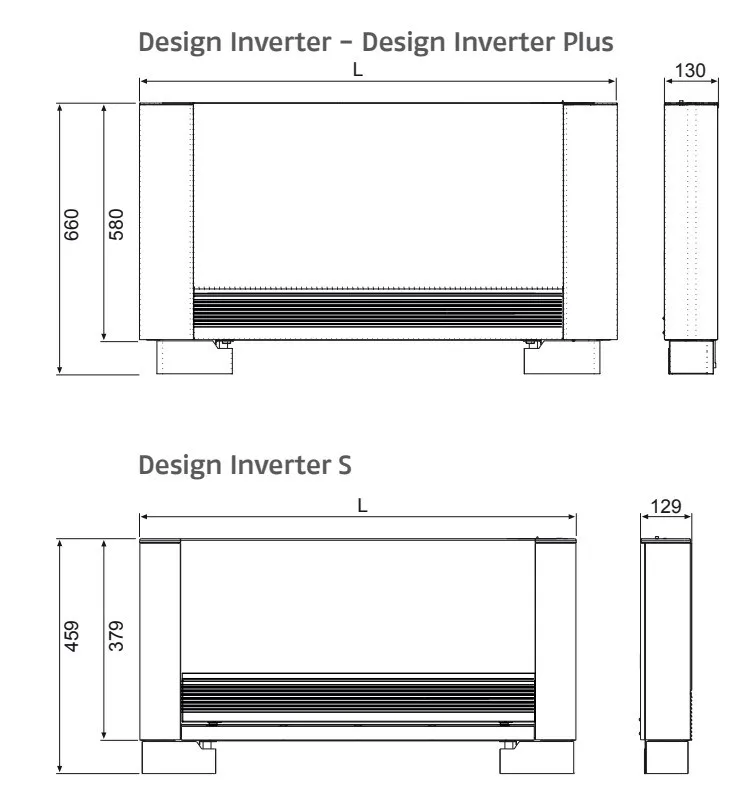 iконструкция инвертора - это инверторные вентиляторы Riello с бесщеточными двигателями постоянного тока, обеспечивающие плавное изменение расхода воздуха от 0 до 100% и, следовательно, тепловой и холодильной мощности. Они быстро нагревают и охлаждают любую среду, вы можете выбрать между двумя специальными схемами: производительность для коммерческих помещений, требующих высокой отдачи и высокой эффективности, и комфорт, чтобы всегда поддерживать максимальную тишину в жилых помещениях. Благодаря использованию бесщеточных двигателей постоянного тока инверторные конструкции экономят до 50% электроэнергии по сравнению с фанкойлами с традиционными двигателями (тип включения / выключения). Как и все семейство HELIOTERM, серия Design Inverter отличается чрезвычайно тонкой эстетикой с глубиной всего 13 см. Диапазон доступен в 5 моделях с мощностью охлаждения от 830 Вт до 4560 Вт и нагрева от 1090 Вт до 4860 Вт. touch, поддерживают широкий спектр применения. Все версии могут быть установлены как вертикально, так и горизонтально (через специальный аксессуар), с креплениями слева. Конструкция изготовлена из оцинкованного листового металла с боковыми частями ABS, передняя решетка подачи выполнена из алюминия.