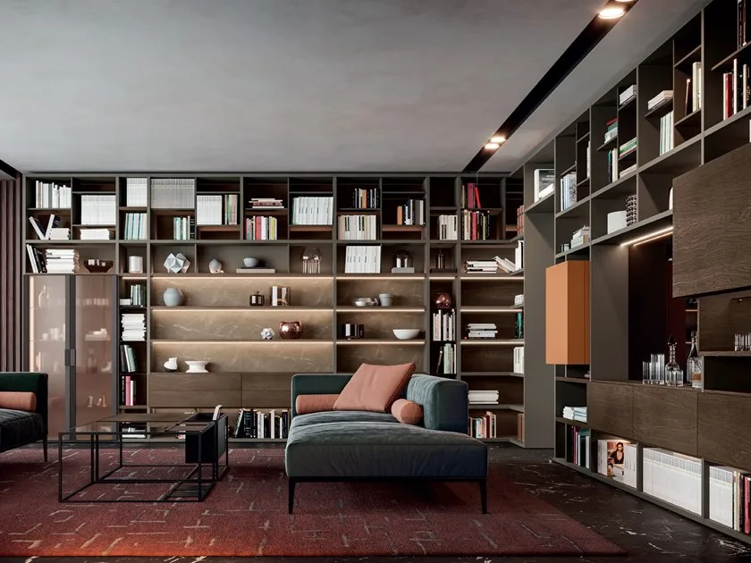 “свободная " библиотека Ш.01/02: теплая и изысканная элегантность, обеспечиваемая играми света и особыми элементами, такими как мобильный бар “Barriere” и створка поднимайтесь и спускайтесь “Ascensio”.