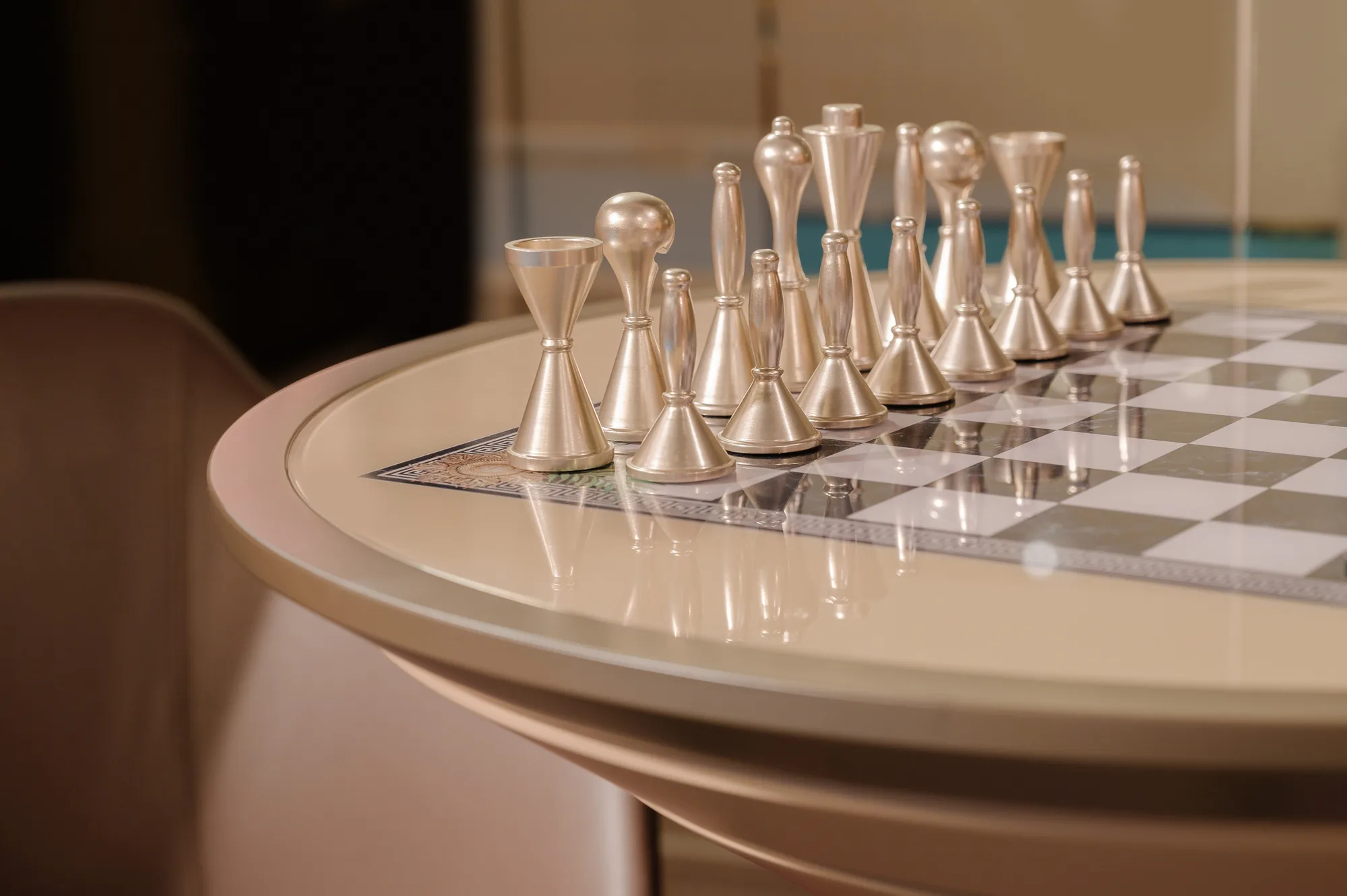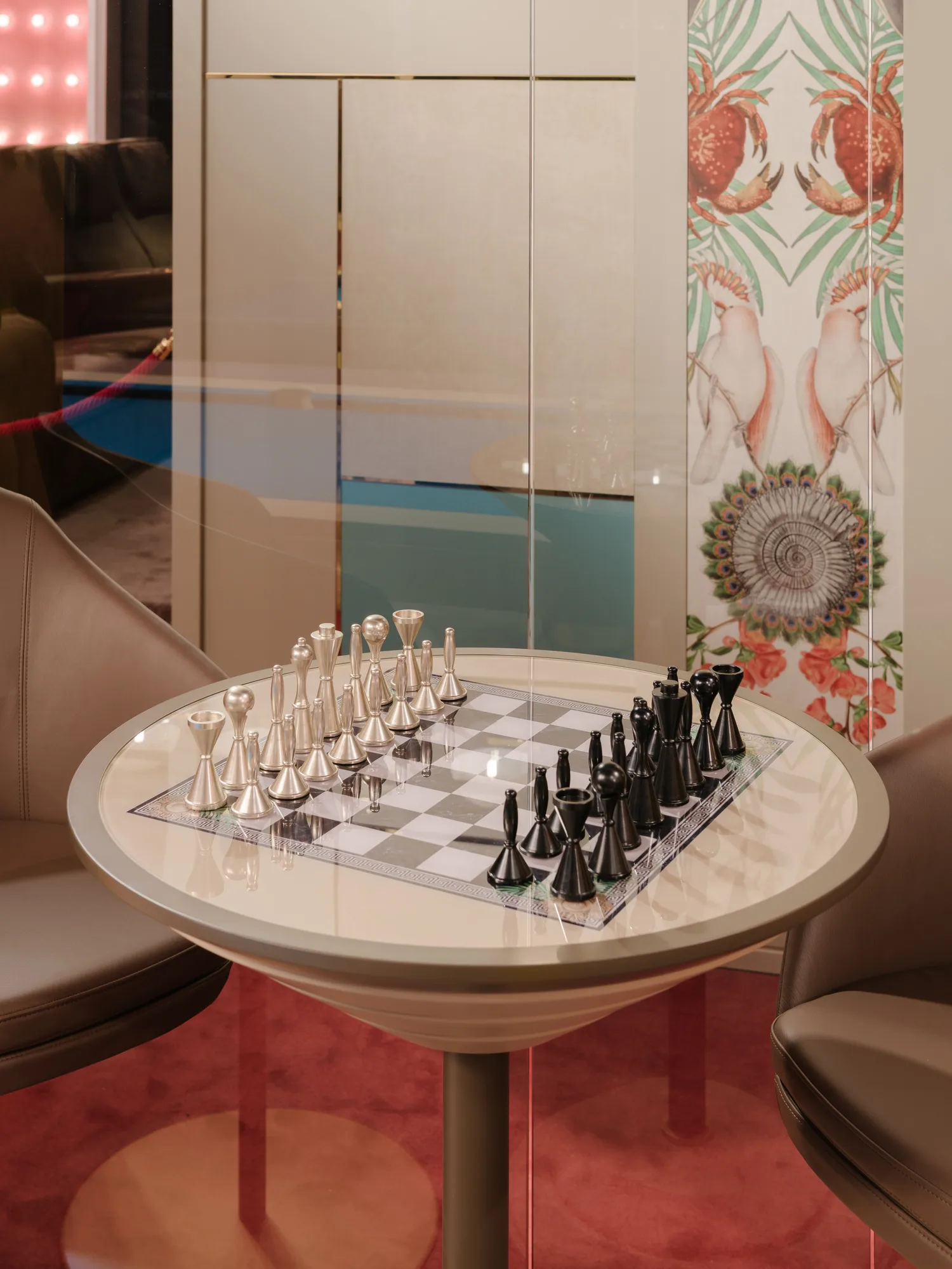Goemon-это многофункциональный стол, который можно использовать как барный стол, шахматный стол или стол для нардов. Его особенностью является аэрографический стеклянный верх с декоративными мотивами цирка, экстравагантное издание с сюрреалистическими элементами, нарисованное от руки. Будучи высоким журнальным столиком, он идеально подходит для обогащения баров. Табуреты также доступны для завершения набора. материалы: лакированное дерево, нержавеющая сталь, аэрографическое стекло.