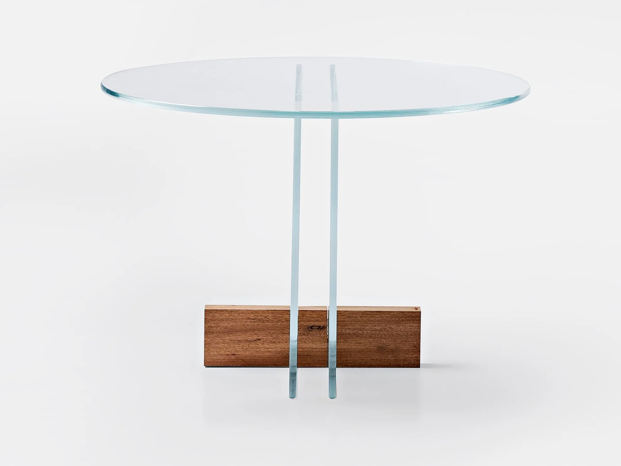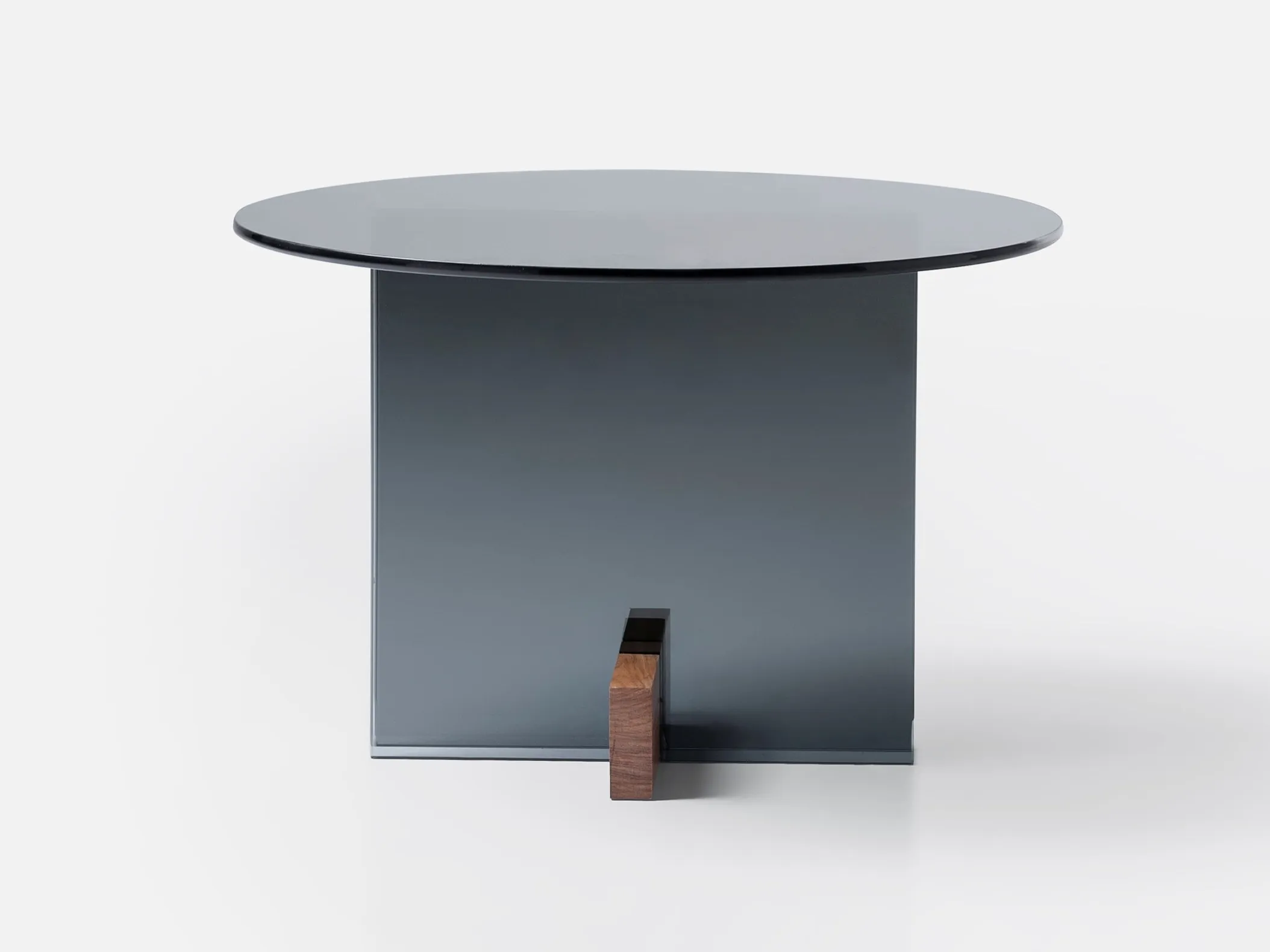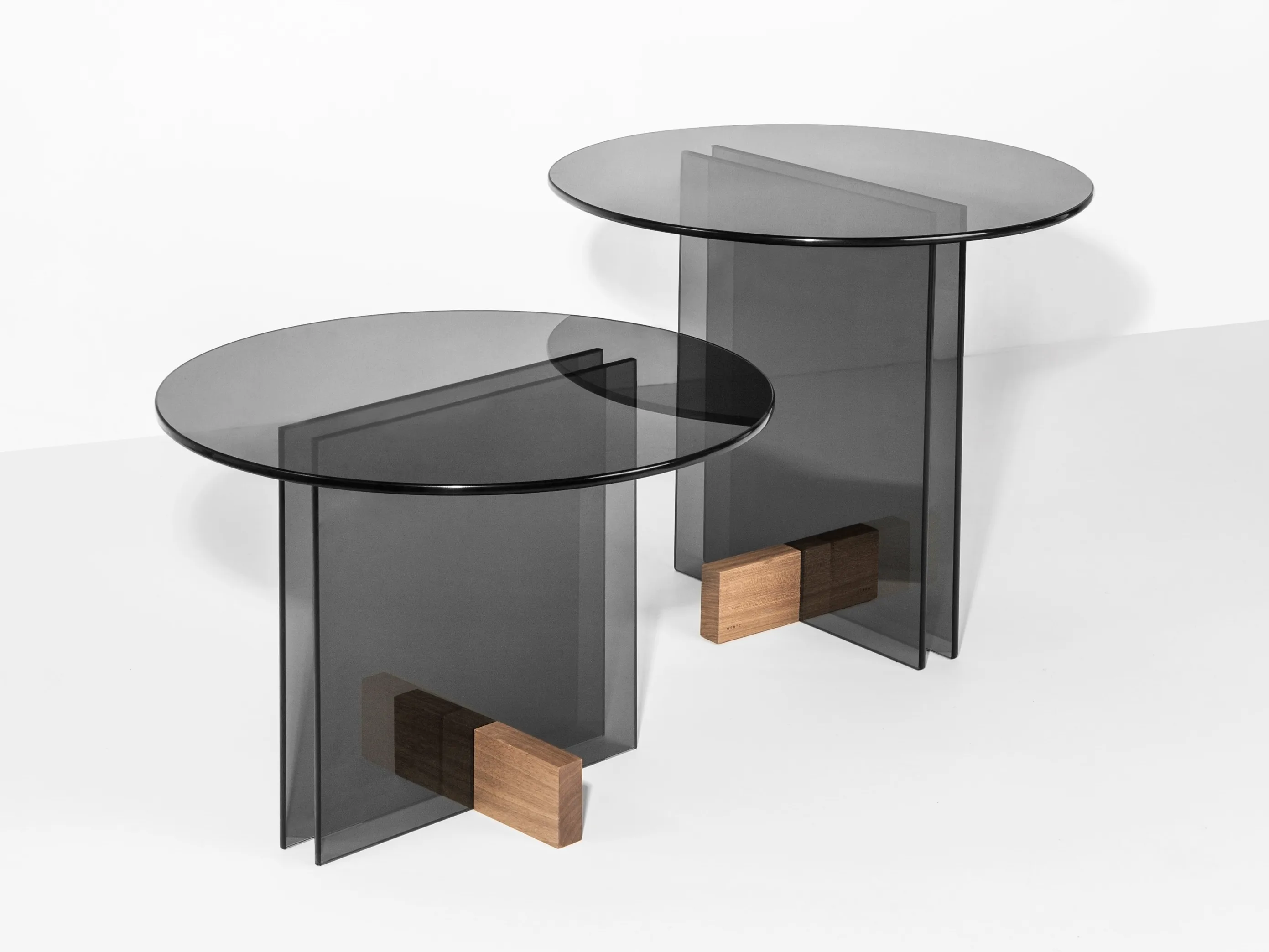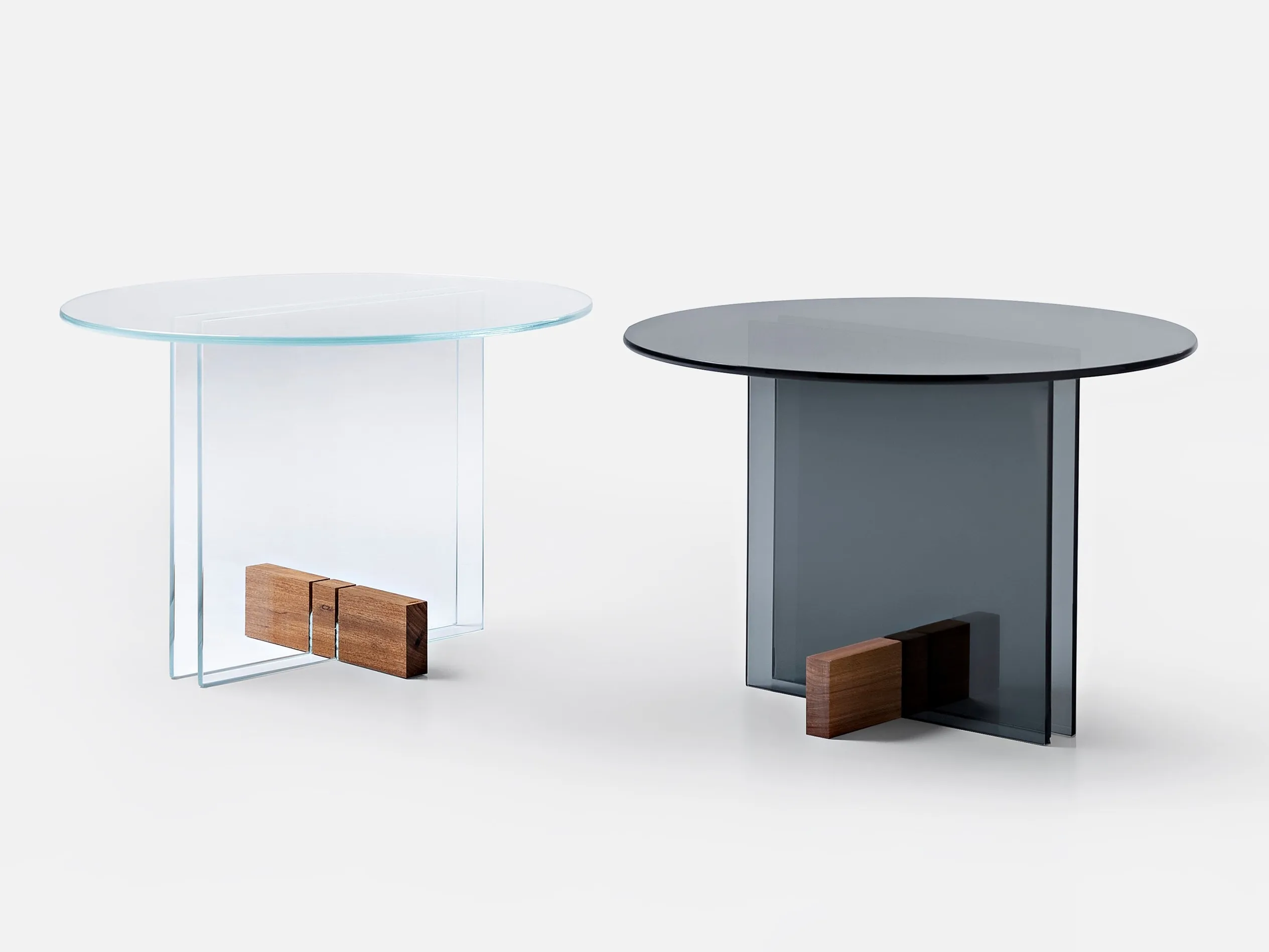журнальный столик из стеклянной пластины. Основание из массива дерева Freijó с натуральной отделкой (прозрачная и дымчатая версии) или выдержанный эвкалипт (синяя версия).