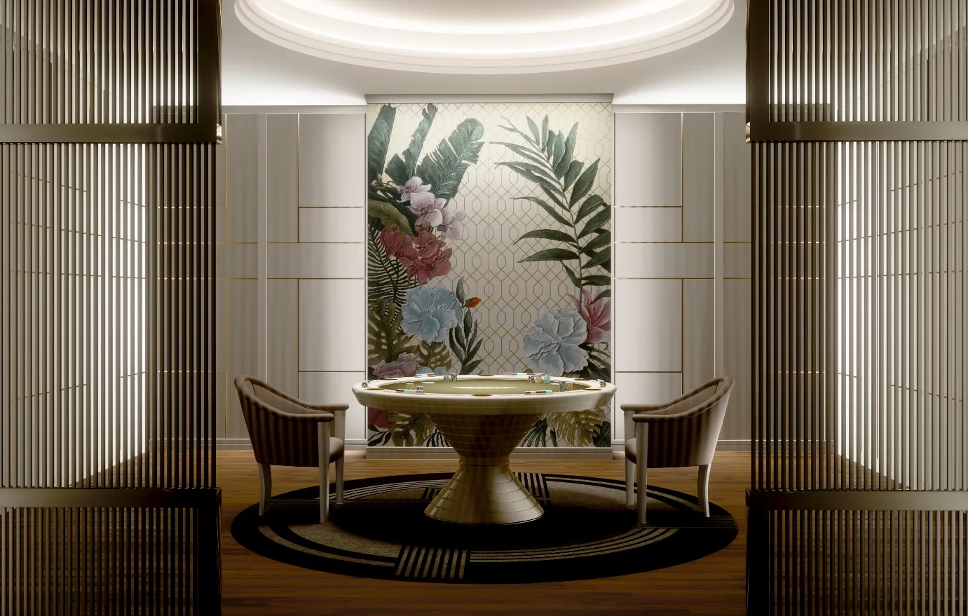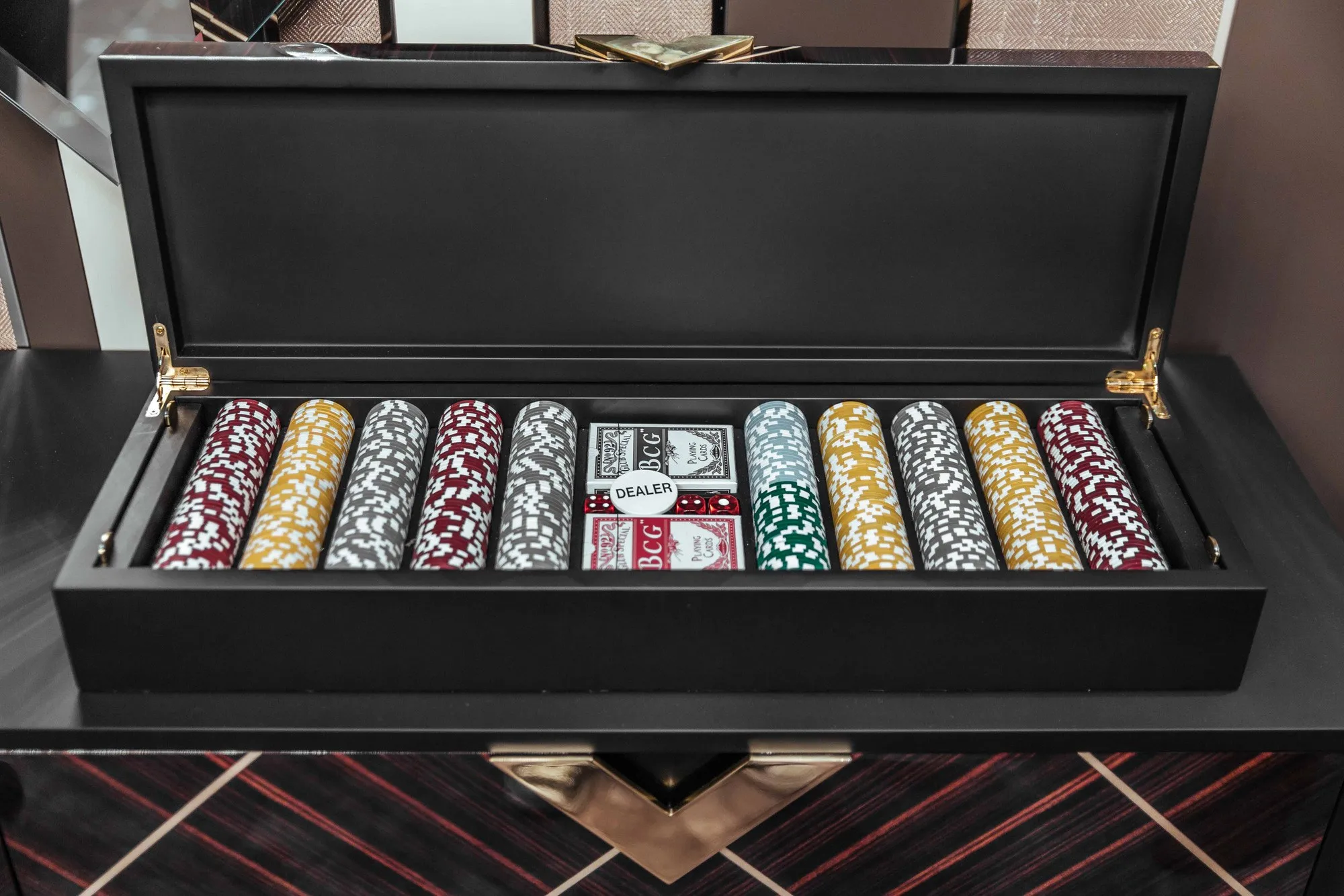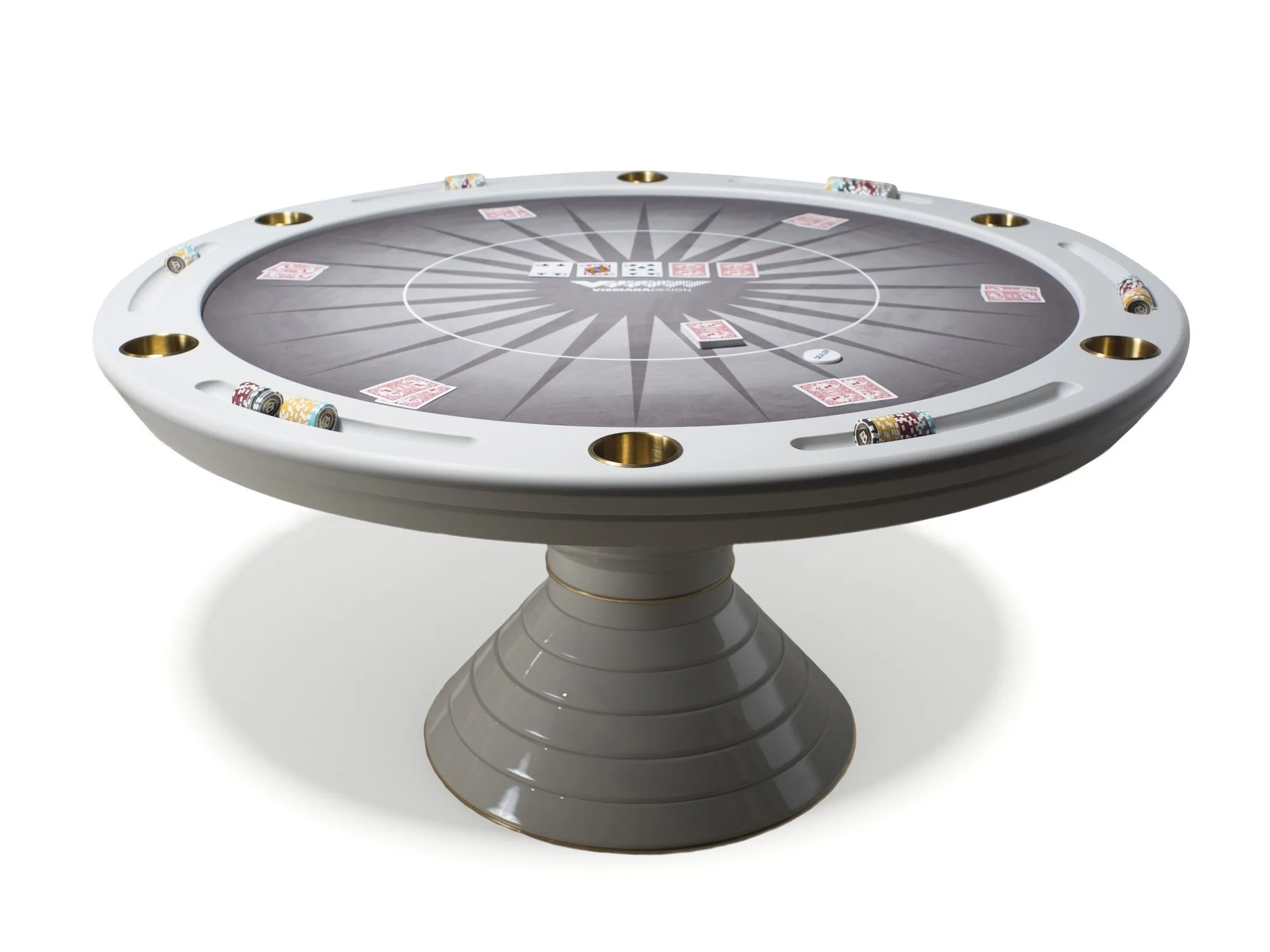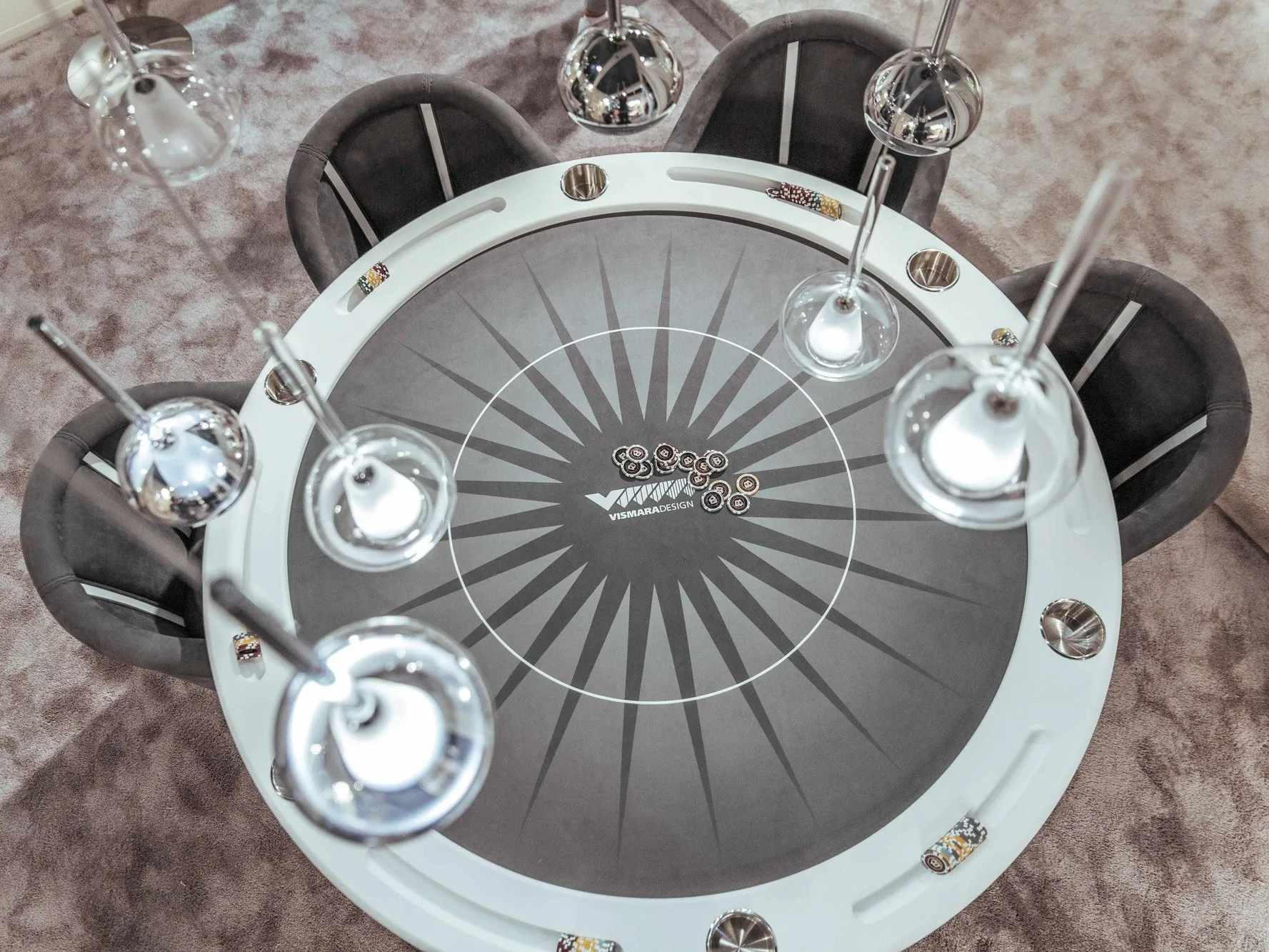 покерный стол-это продукт, который воплощает в себе видение частных развлечений, согласно Vismara. Элегантность, сильная индивидуальность и аутентичность-это характеристики, которые можно найти в дизайне всего продукта; основа выполнена из дерева и профилей из нержавеющей стали, края стола оснащены держателем для фишек и держателем для напитков. Игровая поверхность слегка мягкая и покрыта ковриком, настраиваемым как по дизайну, так и по цвету Pantone. В качестве опции Vismara предоставляет ценный контейнер для 500 фишек из черного дерева makassar, инкрустированный кленовым деревом, и настольная подставка для фишек для дилера. Все элементы гармонично сочетаются, чтобы создать стол, который станет идеальным местом для незабываемых моментов.