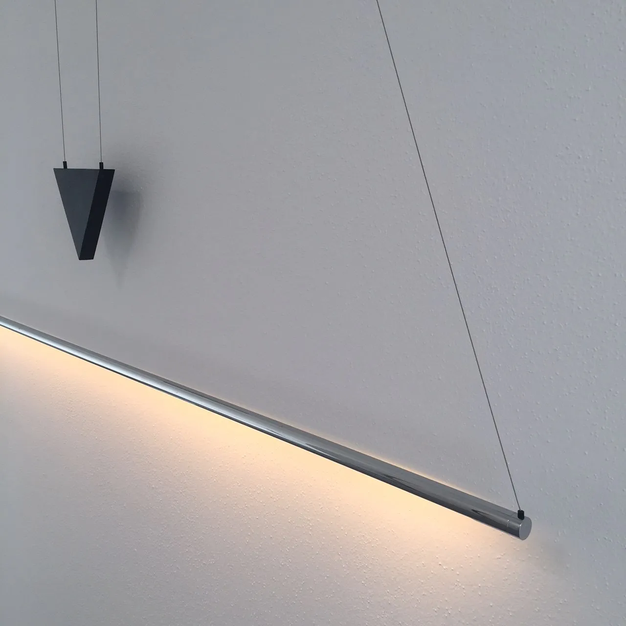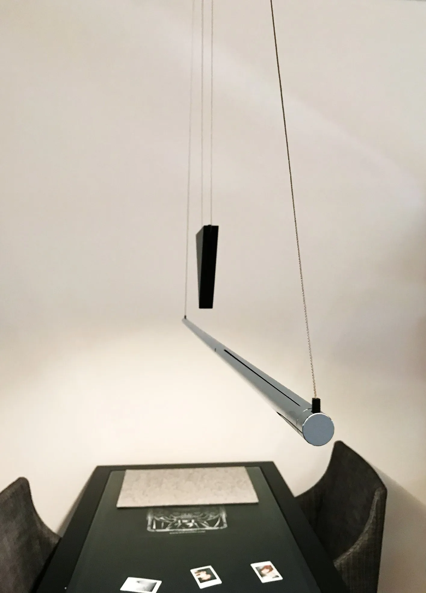 регулируемая по высоте подвесная лампа с сенсорным диммером. 360° поворотный свет трубки для целенаправленного освещения. Трубчатая лампа изготовлена из латуни, а затем отполирована хромом. И геометрический противовес изготовлен из черного пластика.