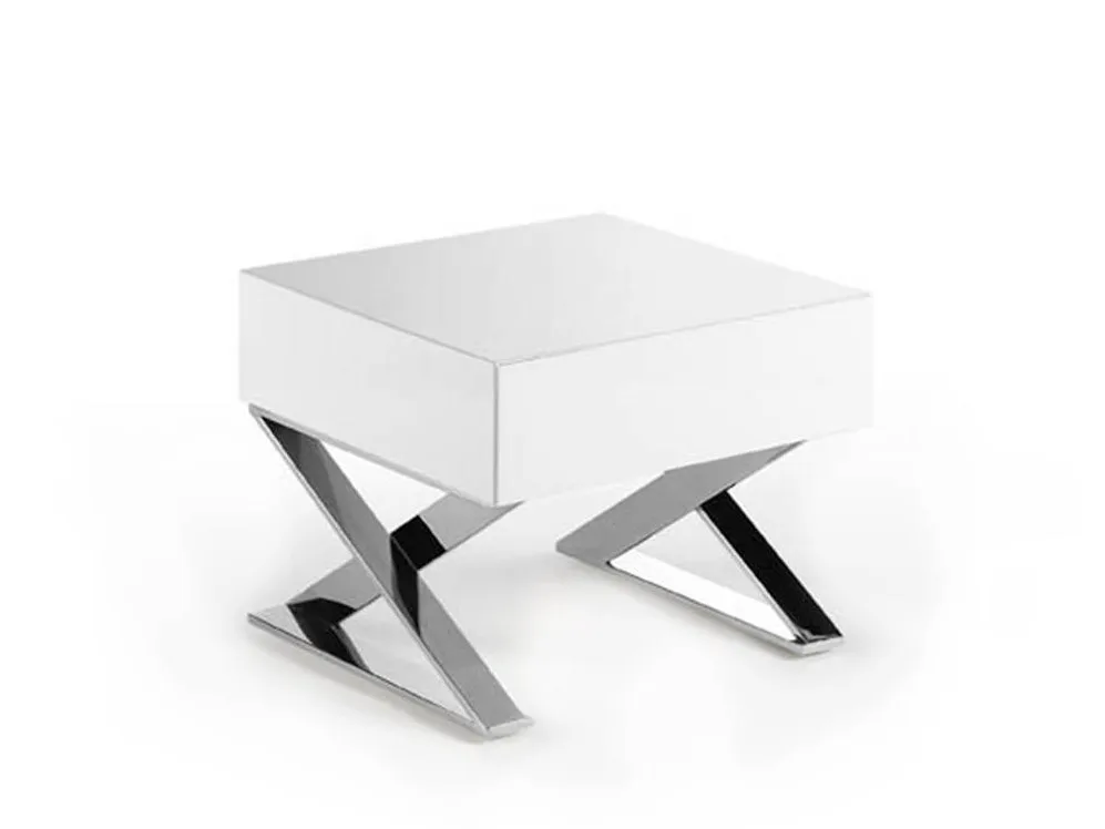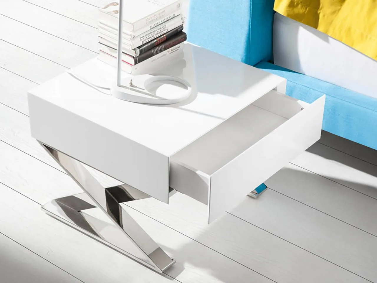 прикроватная тумбочка современного дизайна с оригинальной конструкцией ножек, выполненных в виде лезвия из хромированной нержавеющей стали 22 мкм, и комод из МДФ, лакированный в полированном белом цвете Moderna RAL9003. Прикроватная тумбочка в элегантном и изысканном стиле идеально подходит для придания авангардного стиля и стиля, который вы ищете в своей спальне, а также для поддержания порядка благодаря отсеку для хранения с двойным ящиком с системой замедленное закрытие.