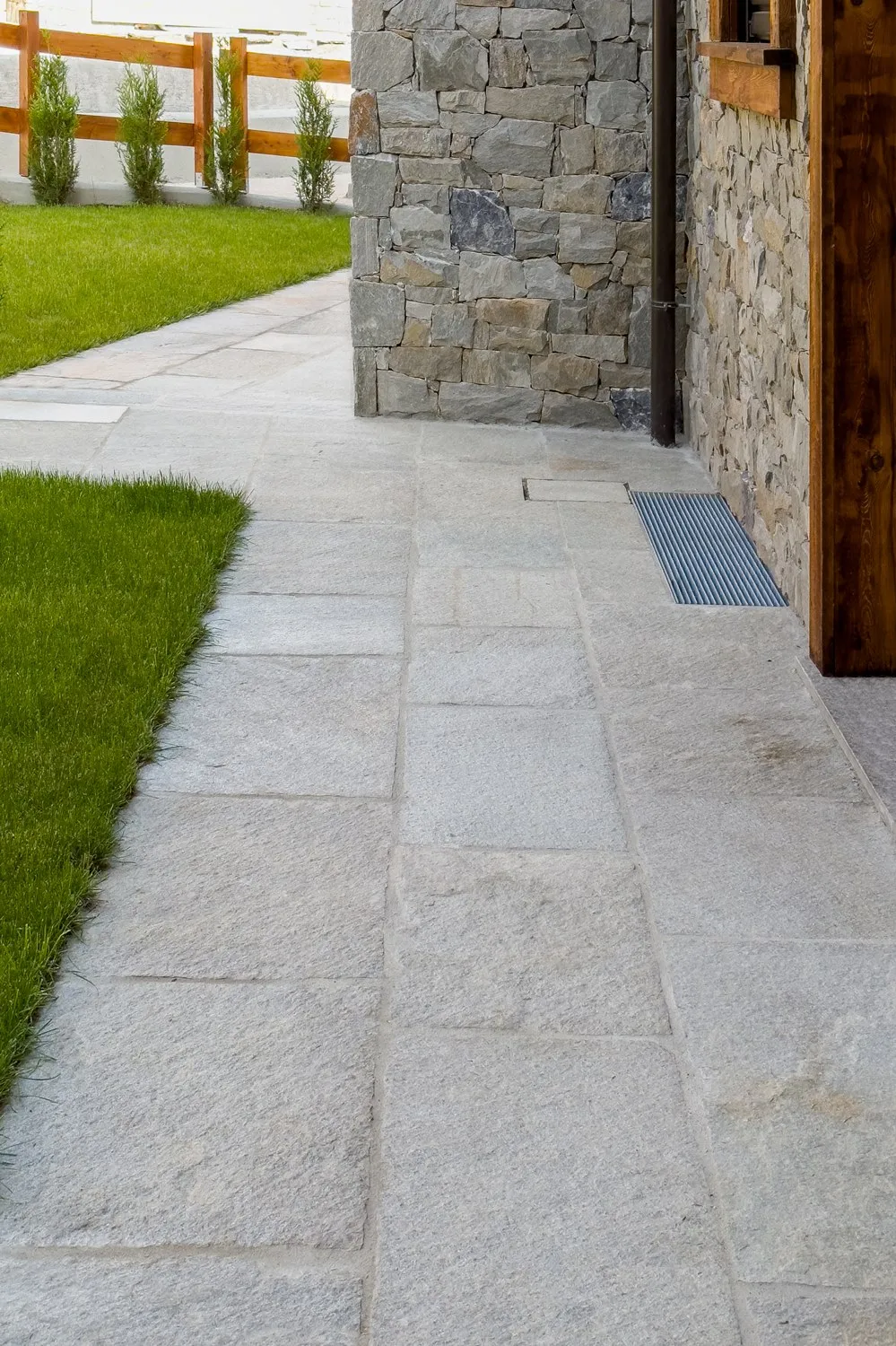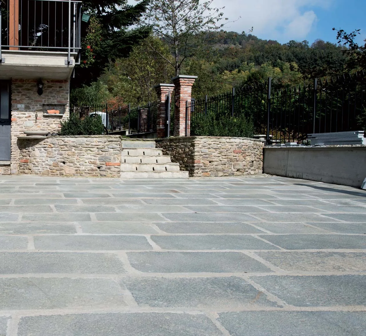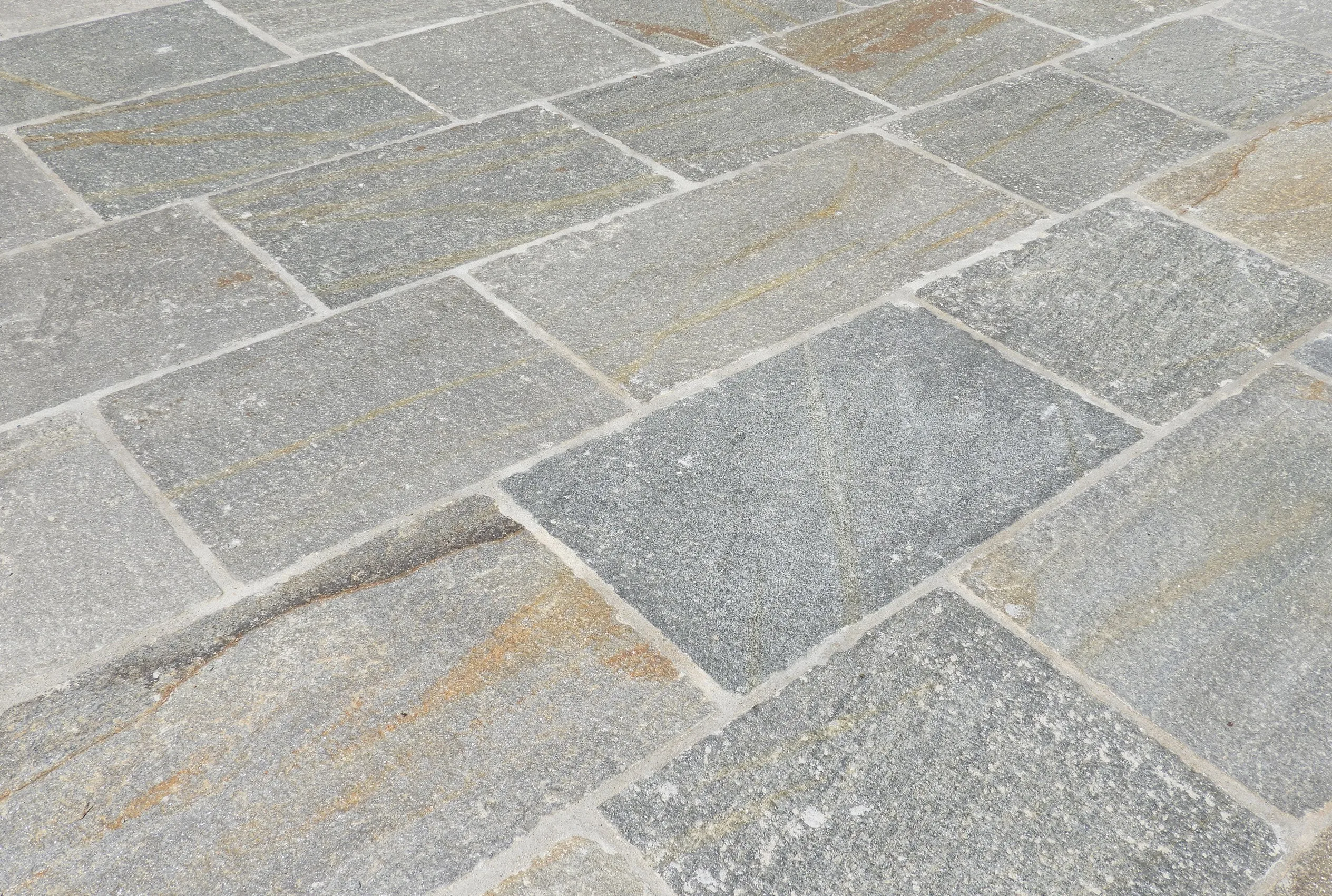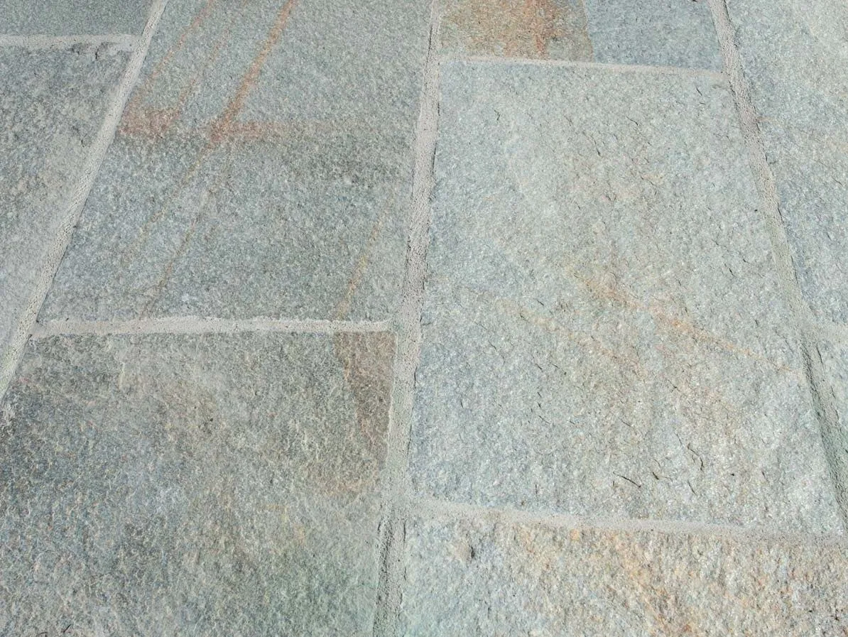 камень гнейс для брусчатки толщиной от 2 до 4 см, с естественной плоской поверхностью и забитыми краями, которые придают изделию античный вид.