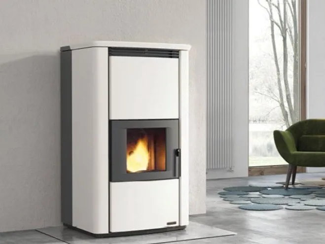 Thermo пеллетная печь модель P189 TH с возможностью подачи горячего воздуха в окружающую среду. Окрашенная стальная обшивка и верхняя часть из фаянса. Доступен в Белом, бордовом, полированном, сером цветах. Даже для больших помещений. Доступна версия с системой ACS для подачи горячей воды в санитарный контур. Может устанавливаться на стенку/угол, класс энергоэффективности a+
