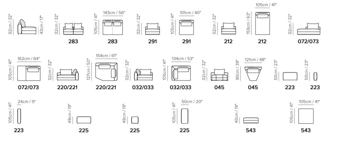 • модульная система, позволяющая использовать несколько угловых и линейных конфигураций с шезлонгом или без него.
