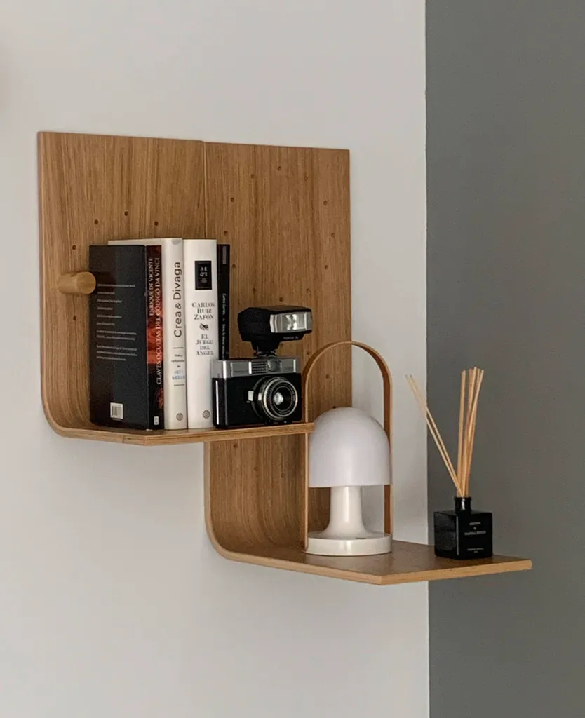 это настоящие произведения искусства на стенах: спроектированные студией Banzai Turba, изогнутые полки JfK (полка J for Kaimok), представляют собой 2 модуля из изогнутой фанеры. Эти деревянные полки, которые можно использовать по отдельности или вместе, могут быть размещены в двух разных положениях и, сочетая 2 размера, обеспечивают различные формы в зависимости от пространства. Несколько полок можно собрать вместе, чтобы создать геометрические узоры на стене. Произведенный в Испании, этот функциональный модульная система стеллажей может использоваться в качестве настенной велосипедной стойки. Имеющиеся отверстия позволяют выбрать наиболее подходящее место для деревянных крючков, превращая JfK в книжную полку, вешалку или велосипедную стойку. Полка, доступная в 3 вариантах отделки: орех, дуб и белый, предназначена для того, чтобы помочь пользователям стильно и практично хранить свои вещи, книги или велосипед.
