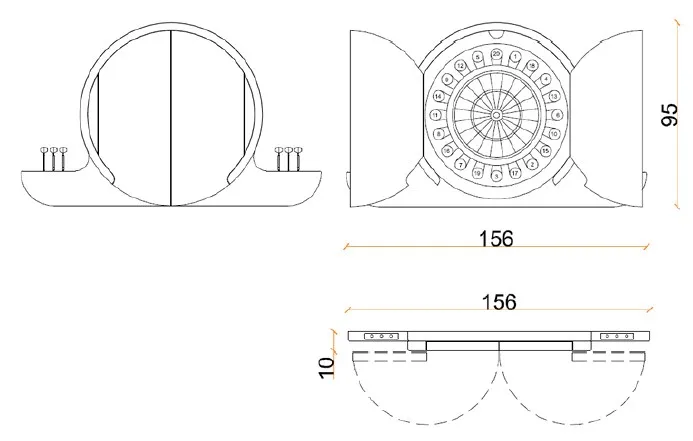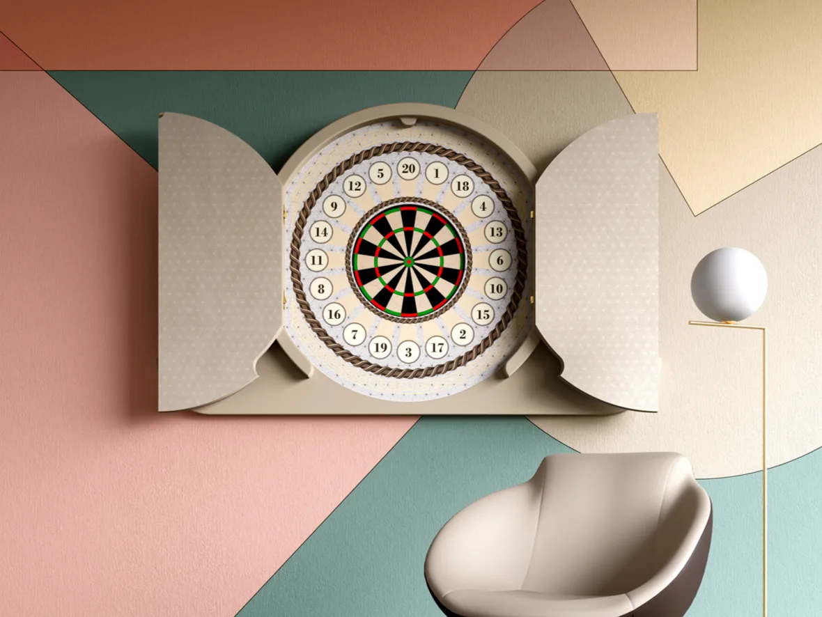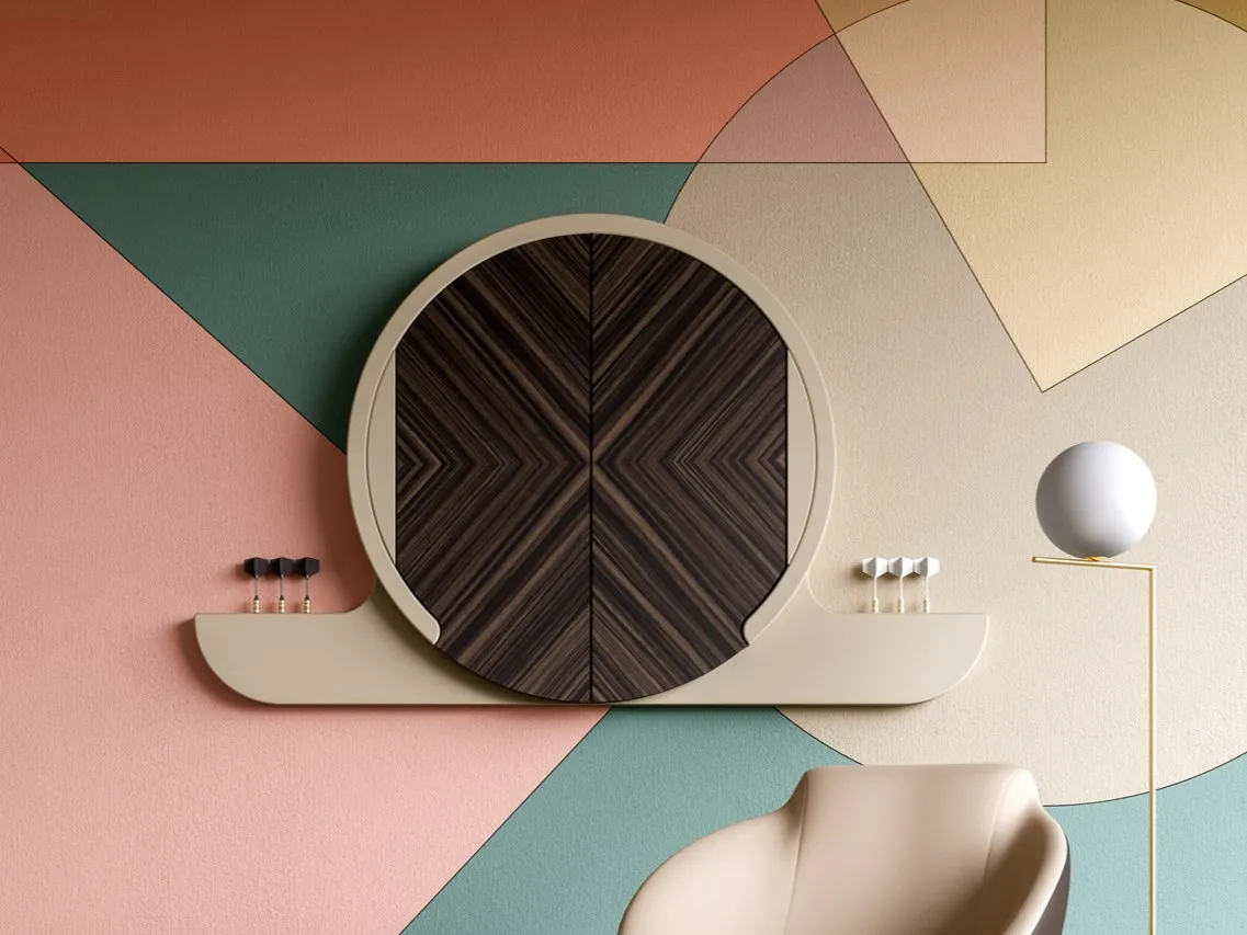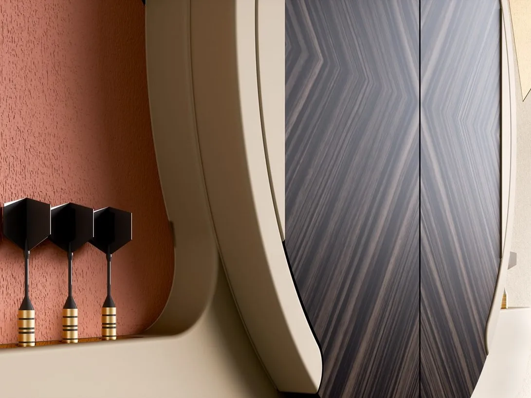издание 2020 года ARGO представляет собой сдержанный и элегантный элемент декора. Двери обиты эбеновым деревом Макассар с рыбьей костью, что придает мебели очень современный вид. Интерьер остается неизменным: цель-Африканский сизаль, натуральное волокно, которое не позволяет создавать отверстия. Штампованная резина с геометрическим рисунком, размещенная вокруг цели и внутри створок, защищает предмет мебели от неудачных бросков.