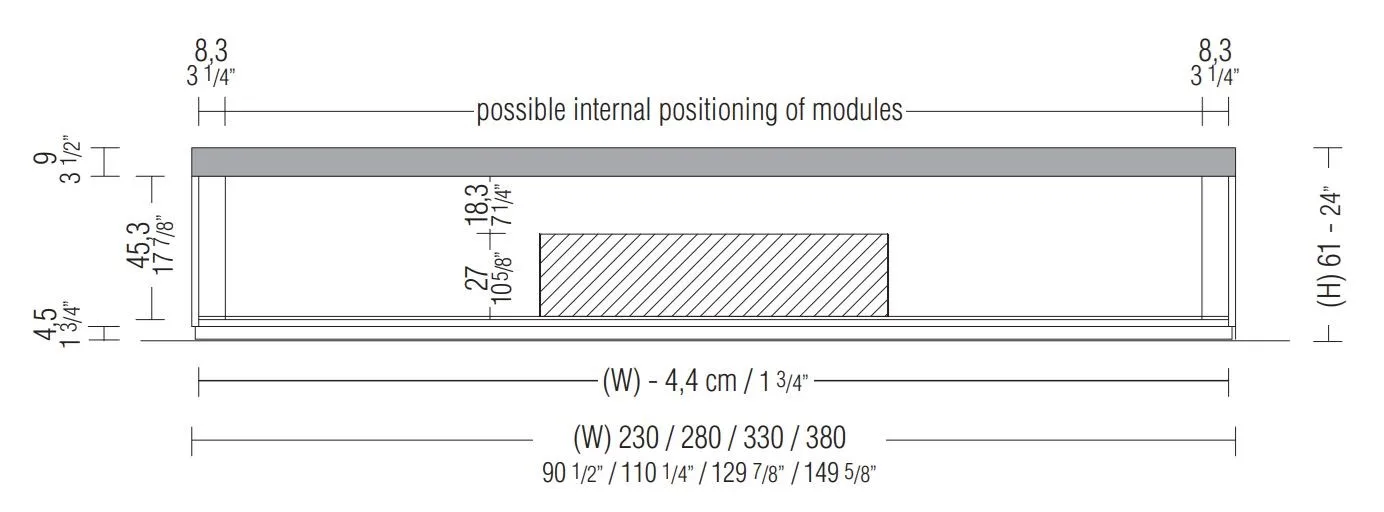 светодиодный свет тускло освещает его. Пространство интерьер полностью свободен и не имеет острых углов благодаря специальным изогнутым угловым крышкам. Созданное таким образом пространство доступно для размещения любого объекта, который вы хотите разместить и показать. Если это сценическое решение привело к нефункциональному внешнему виду, вы можете добавить один или несколько комодов с отделкой iris и оловянной отделкой или эссенцией, от трезвого и элегантного дизайна, которые заполняют свободное пространство, скрывая то, что полезно, но вы предпочитаете не раскрывать.
