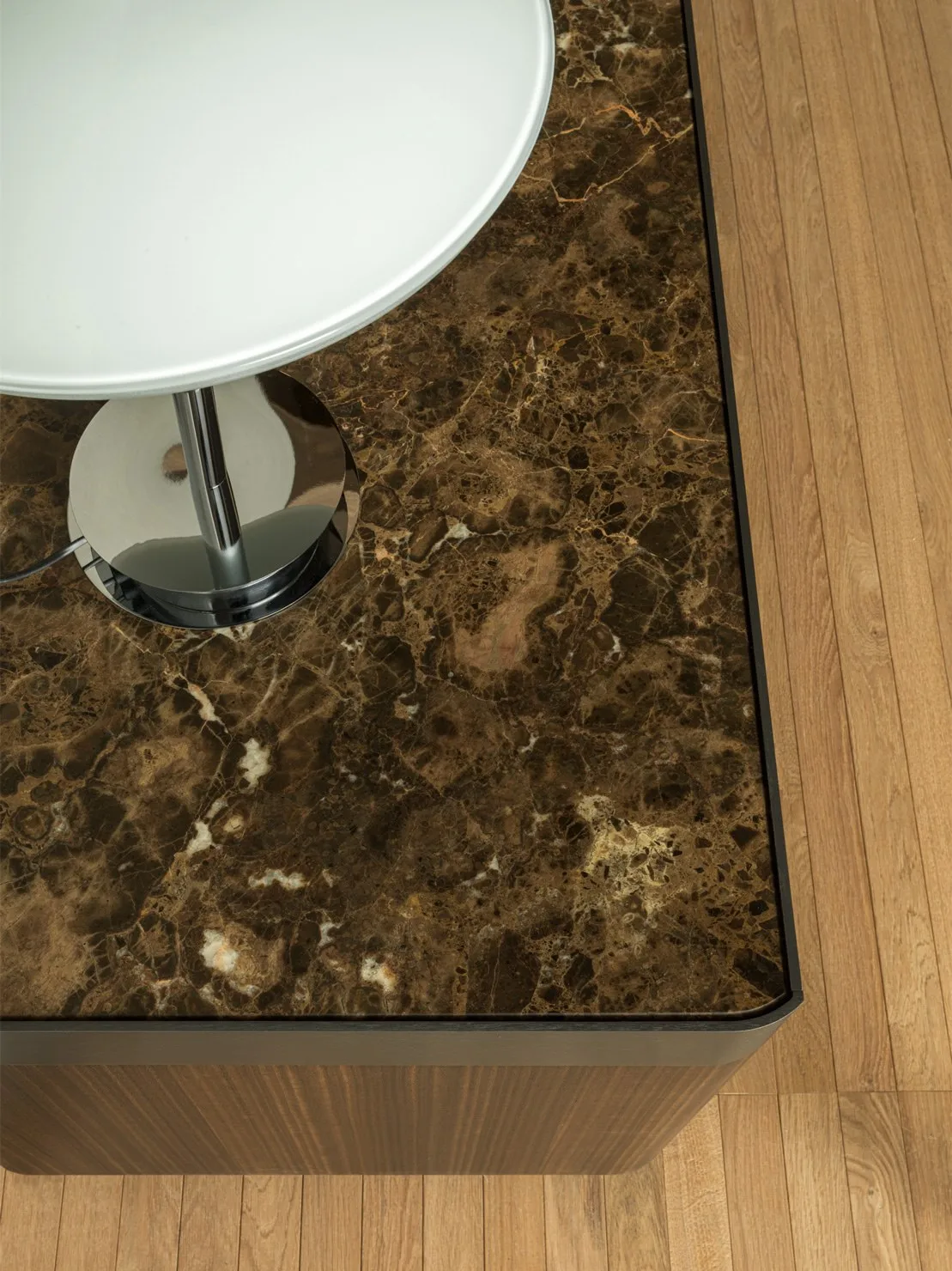 Living Box-это прямоугольный, низкий, большой контейнер (230, 280, 330, 380) без створок, в котором внешний и внутренний элементы контрастируют с использованием различных материалов. Внешний вид характеризуется большой опорной поверхностью, где мрамор и эссенции используются для украшения пола с помощью специальных геометрических схем используемых материалов. Все заключено в рамку, в ирис и олово, на вид нитевидный, если смотреть сверху, но вид спереди превращается в настоящий профиль с сильной толщиной, который окружает внутреннее отделение.