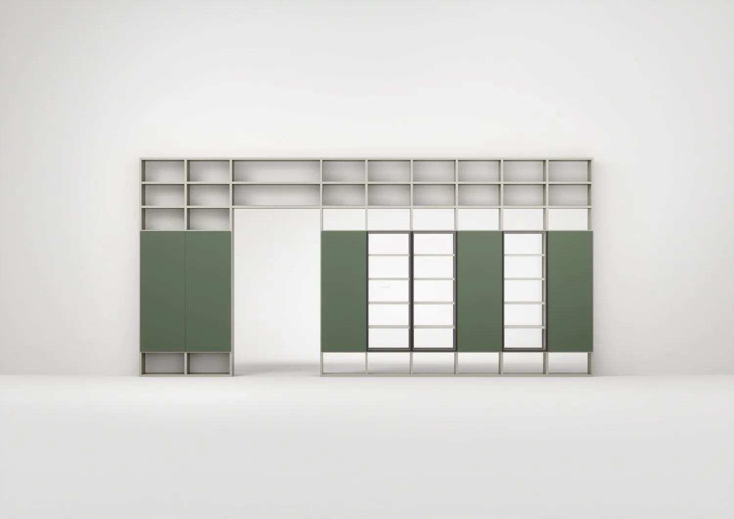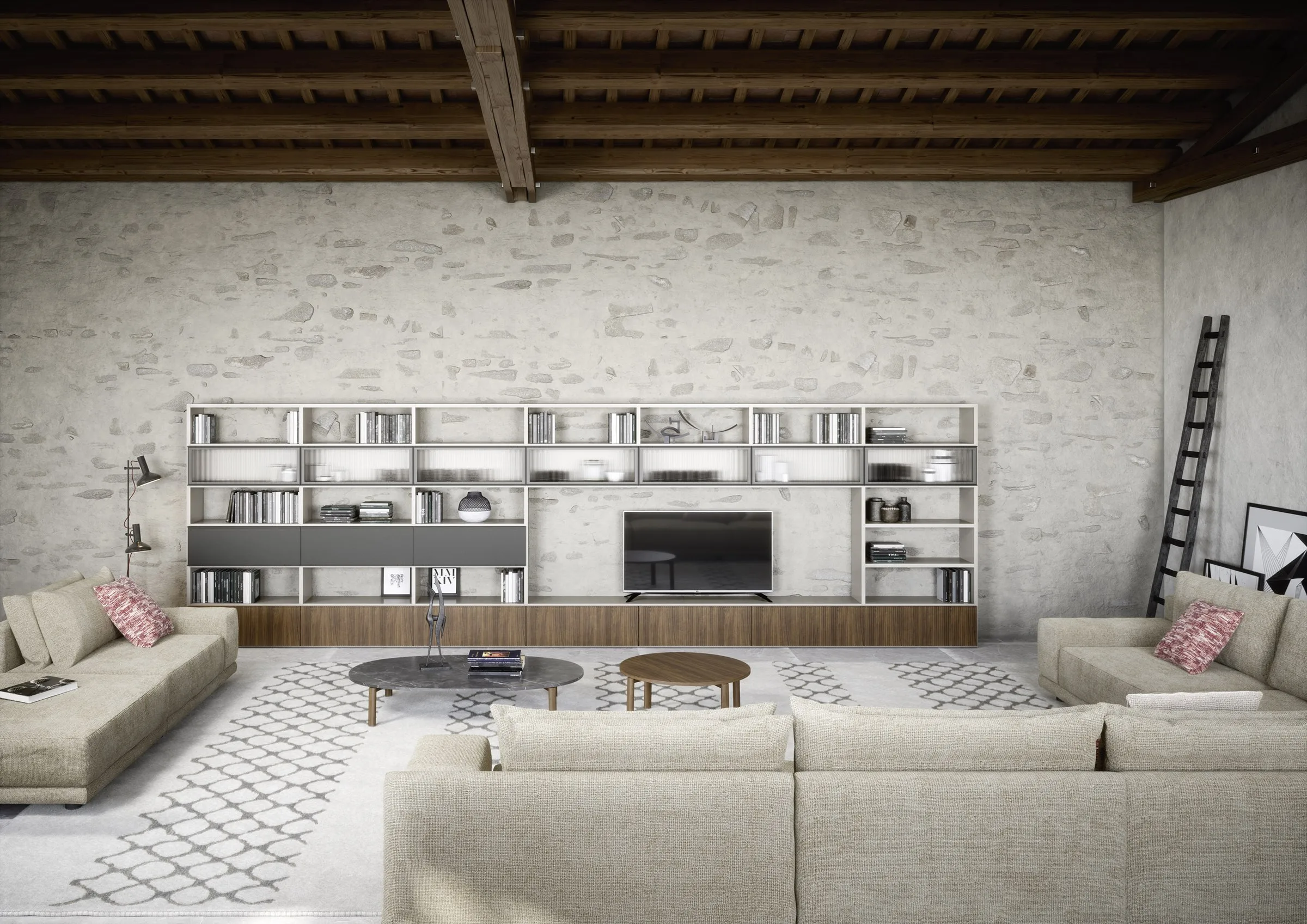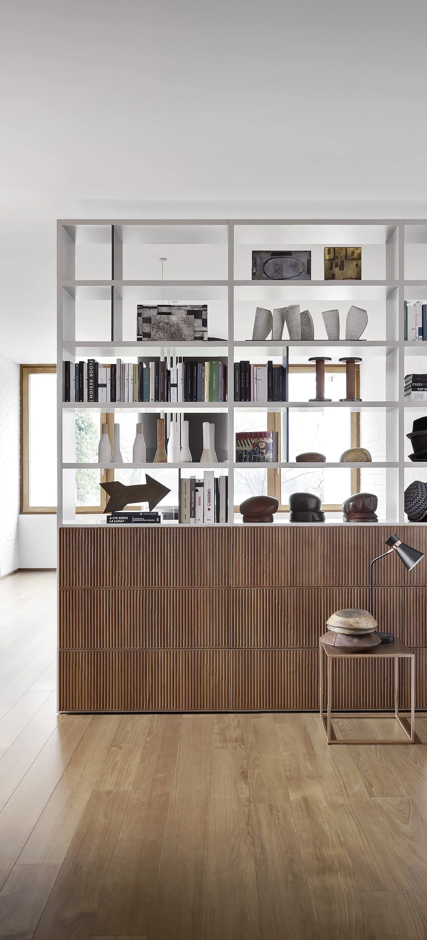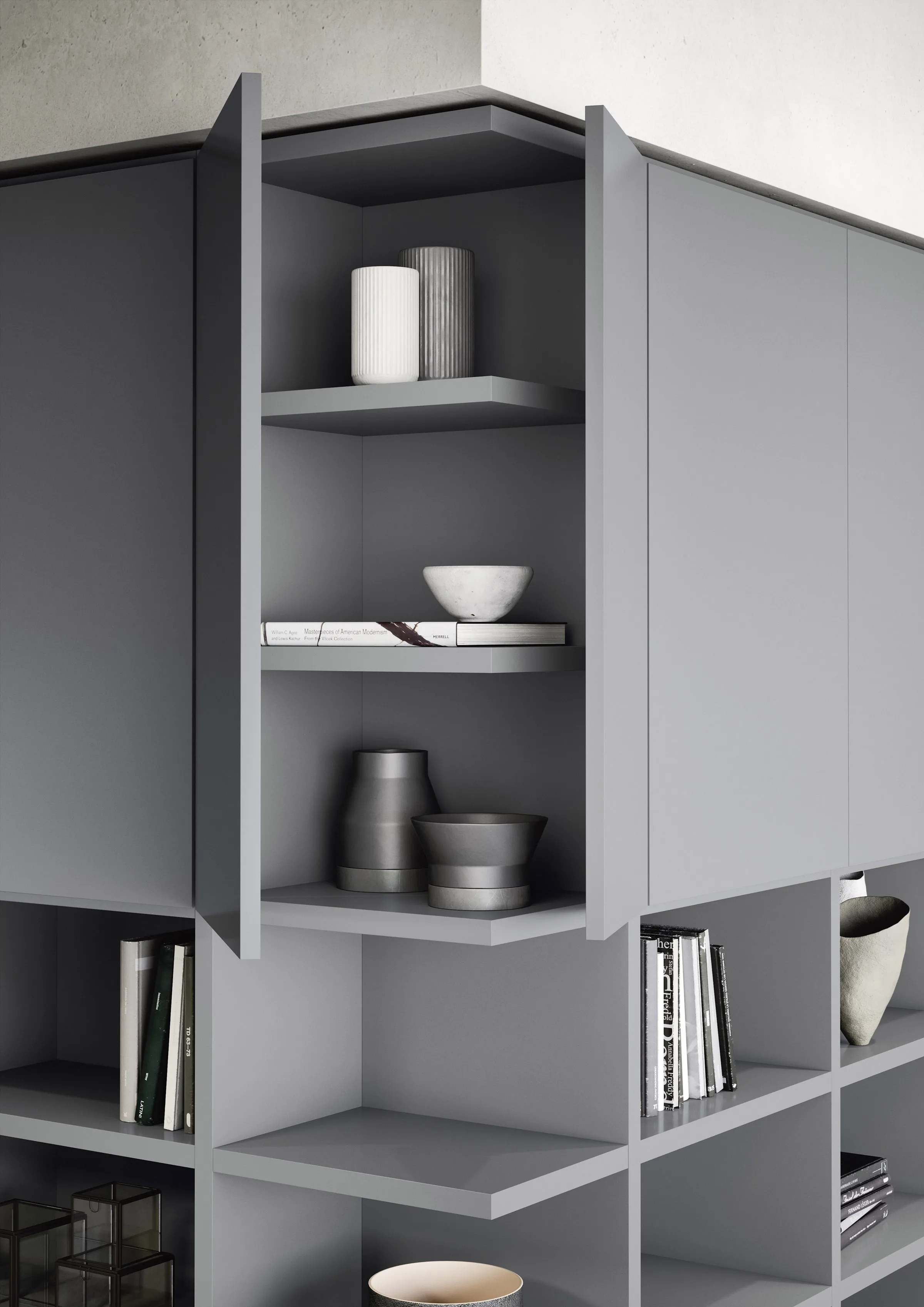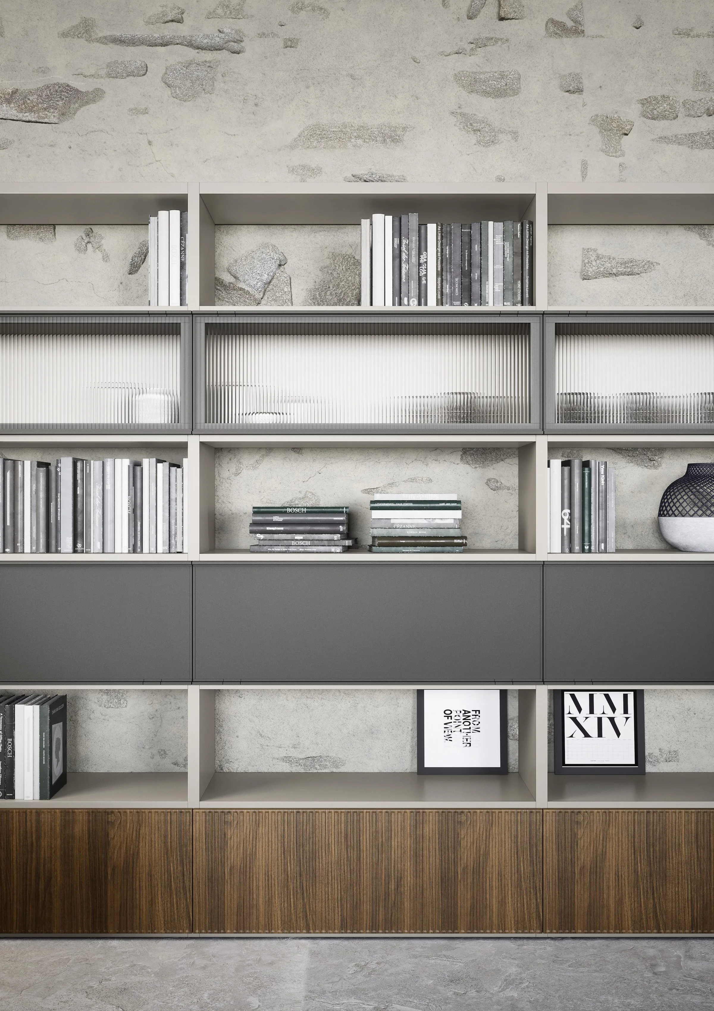 полки книжного шкафа Wall 30 (толщиной 3 см, как и боковые стороны) добавляют нотку прочности: они доступны в различных отделках (ЭКО-дерево, супер-матовый, матовый и окисленный лак, и совершенно новый шпон), а также могут быть подсвечены. С другой стороны, если вы предпочитаете более легкий вид, вы можете выбрать стеклянные полки, которые поставляются с металлической рамой толщиной 3 см в бронзовой отделке, со светодиодной подсветкой или в версии толщиной 0,8 см без освещения. Ассортимент открывающихся систем также делает конфигурацию очень универсальной: обычные и увеличенные ящики могут сочетаться с откидными дверцами, подъемные, распашные или раздвижные, все доступны в различных вариантах отделки.