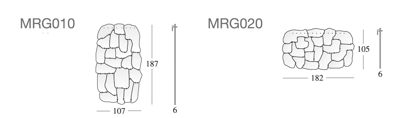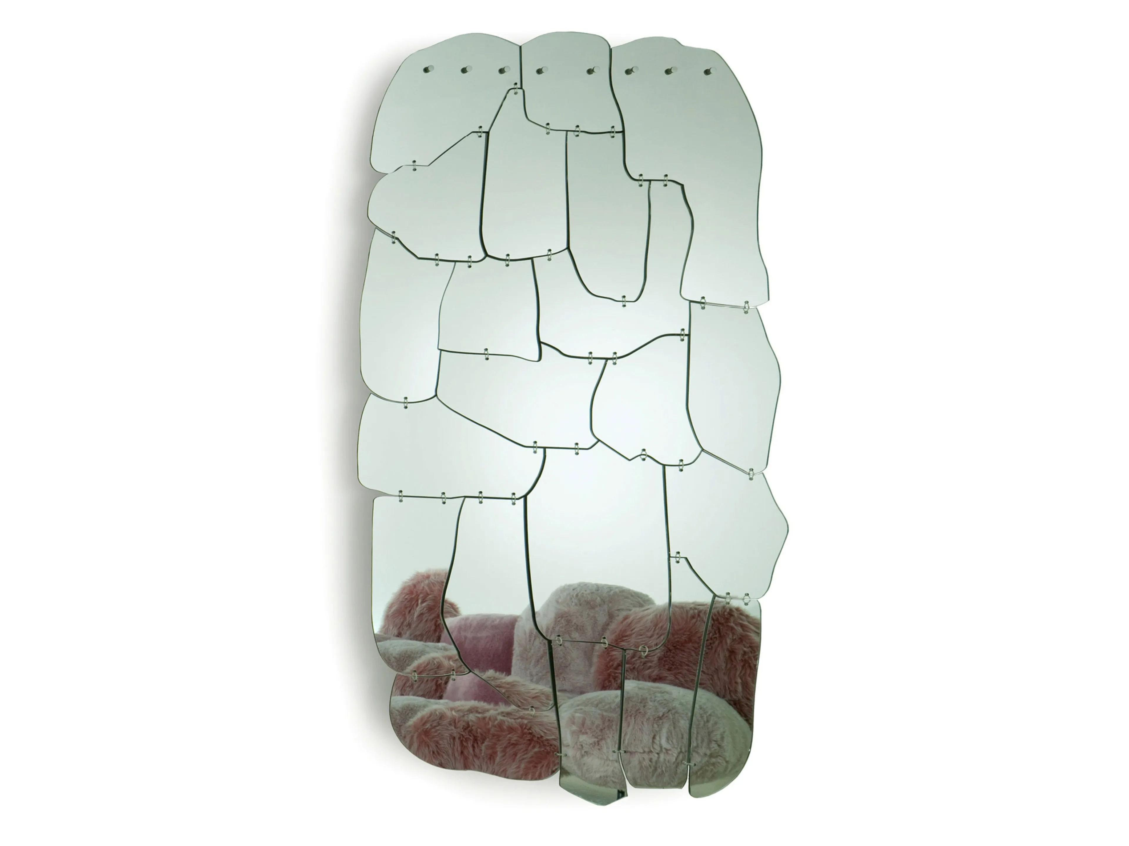 Miraggio это настенное зеркало, образованное ручной сборкой силуэтов различных форм из цветного зеркального метакрилата, вырезанных лазером, вручную обработанных по краям и Соединенных нейлоновыми стяжками. Кронштейн алюминиевого профиля дистанцирует его от стены.