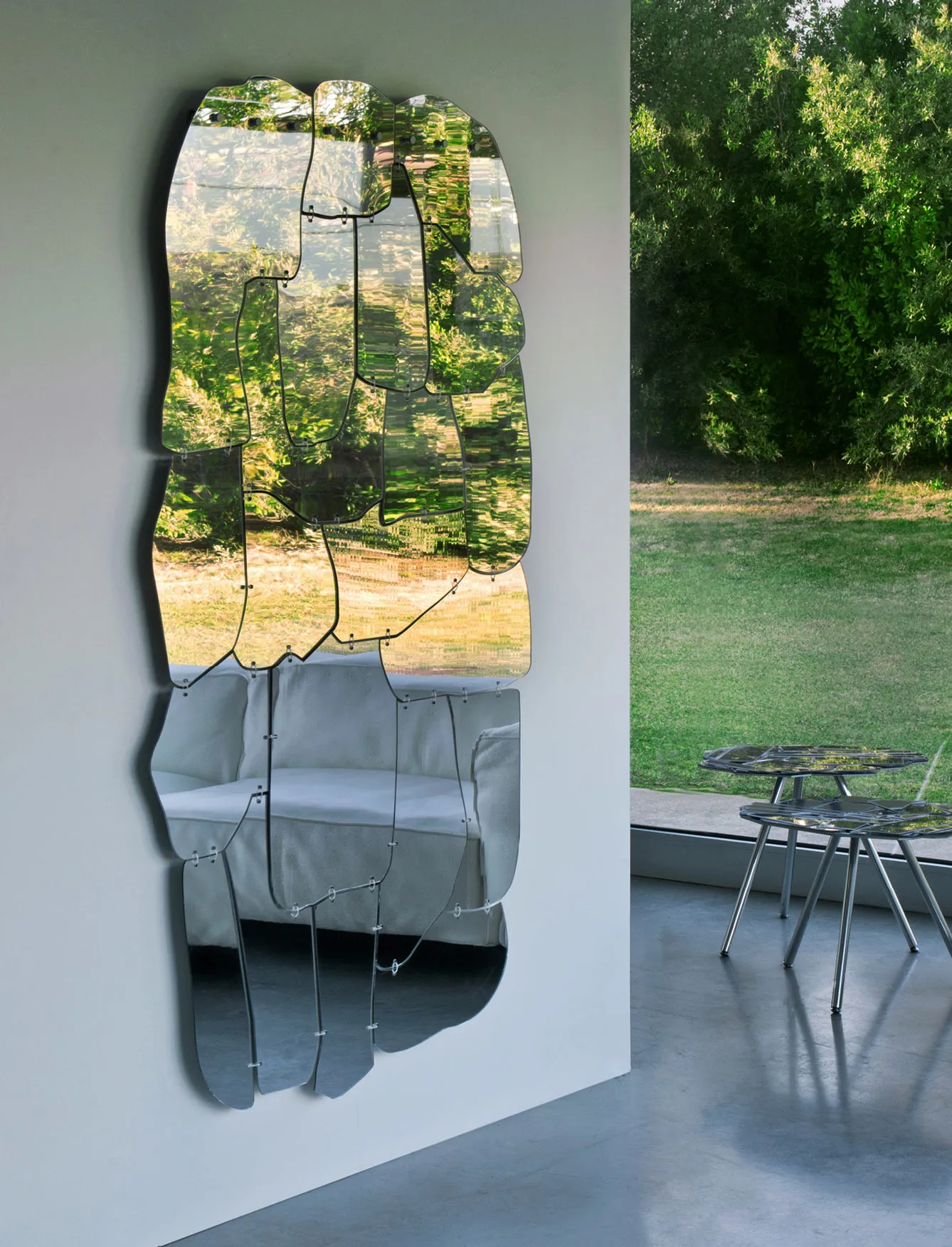 Miraggio это настенное зеркало, образованное ручной сборкой силуэтов различных форм из цветного зеркального метакрилата, вырезанных лазером, вручную обработанных по краям и Соединенных нейлоновыми стяжками. Кронштейн алюминиевого профиля дистанцирует его от стены. доступны в 2 размерах, для портретной или альбомной ориентации, со специальной опорой на стену из алюминиевого профиля. Зеркальные пластины из метакрилата Coloreflex, в цветах образца, вырезанные лазер, соединенный с помощью нейлоновых стяжек. ...