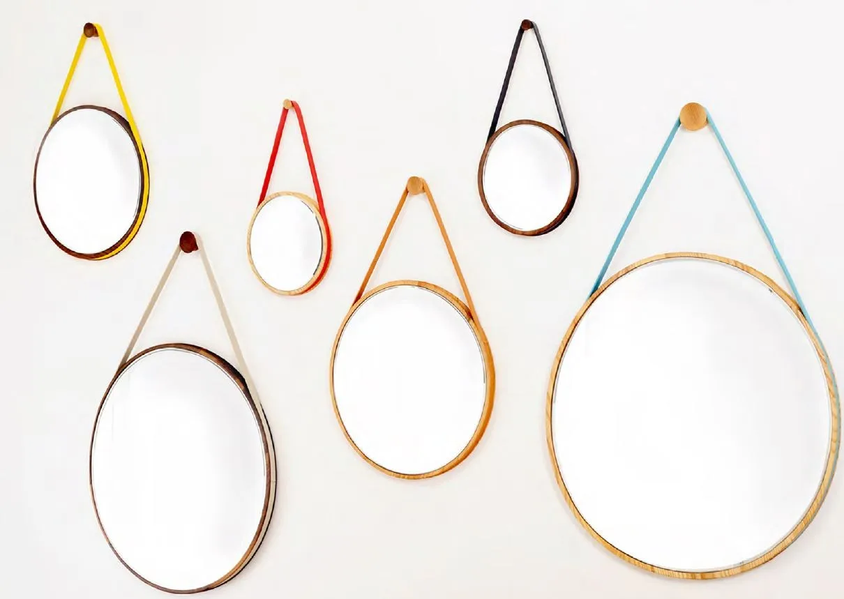 Loop представляет собой круглое зеркало, подвешенное на кожаном ремешке, прикрепленном к колышку для крепления к стене. Колышек легко крепится к стене любого типа, а кожаный ремешок плотно прилегает к раме зеркала. Простые линии, цветная кожа, которая контрастирует с маслом натурального дерева. Возможность сочетать структуру ореха или ясеня с сильными цветами кожи.
