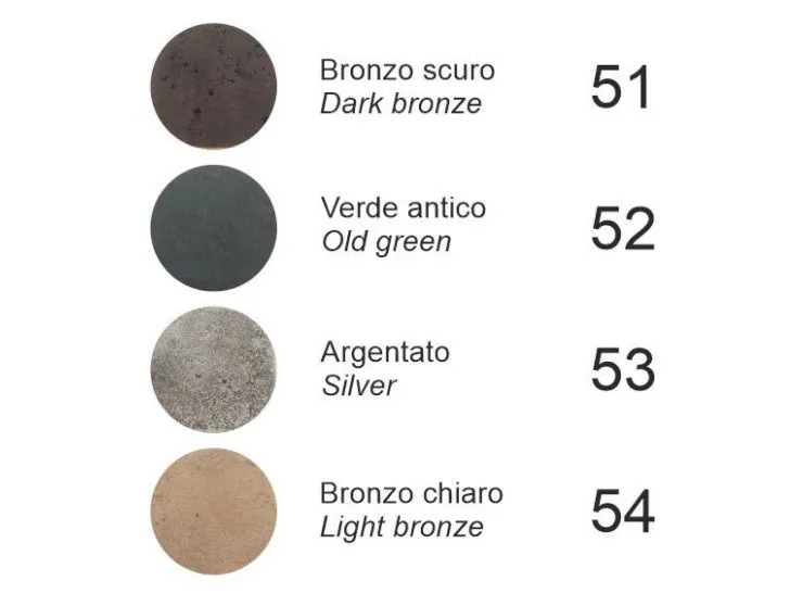 * 54 - Light Bronze, это очень светлая отделка, демонстрирующая естественный цвет бронзы, которая со временем темнеет. Не используются краски, а только натуральный защитный воск.<бром/>• 52 - Old Green, который воссоздает окисленный эффект путем ручного нанесения натуральной патины.