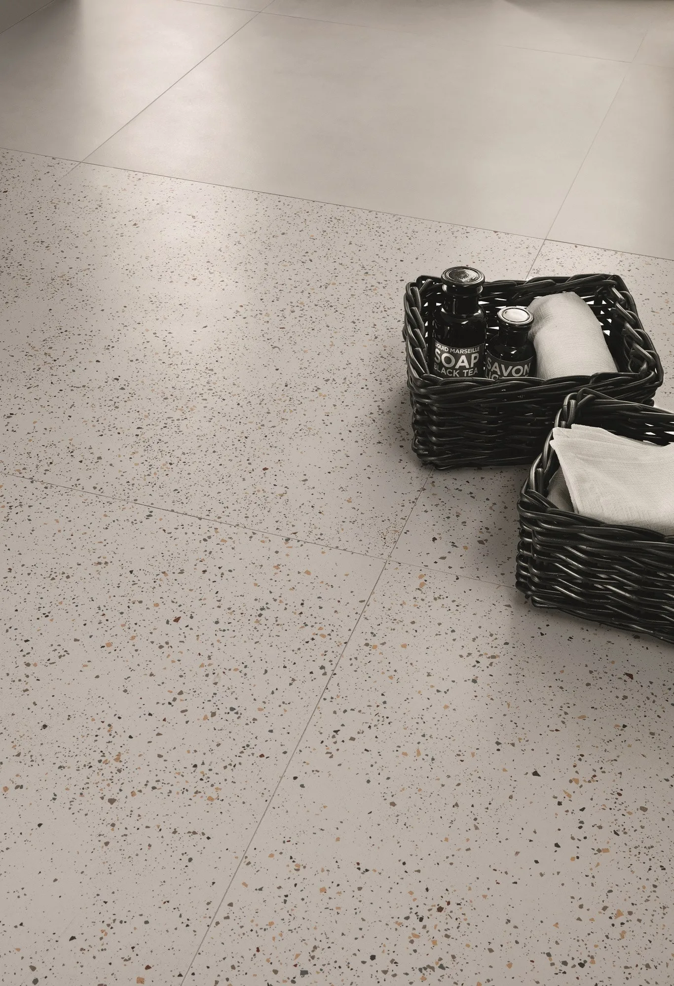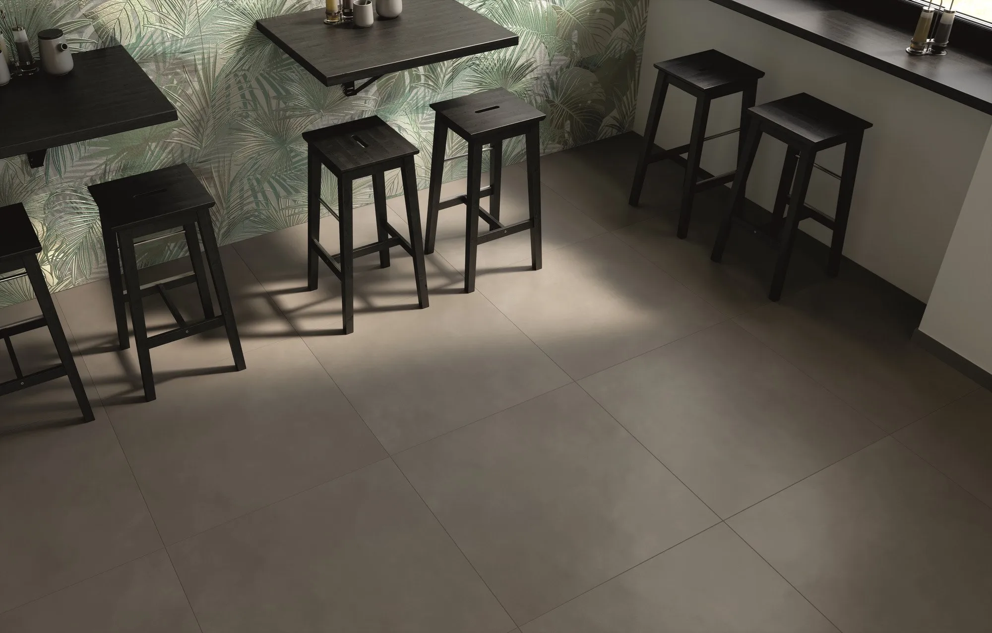 полы из керамогранита Milano Mood они предлагаются в палитре тонов от чистого белого - ледяного-до двух оттенков серого – тумана и цемента - и двух бежевых-песка и печенья, до интенсивной антрацитовой отделки в 3 различных типах поверхностей: satin, R9 и R10.