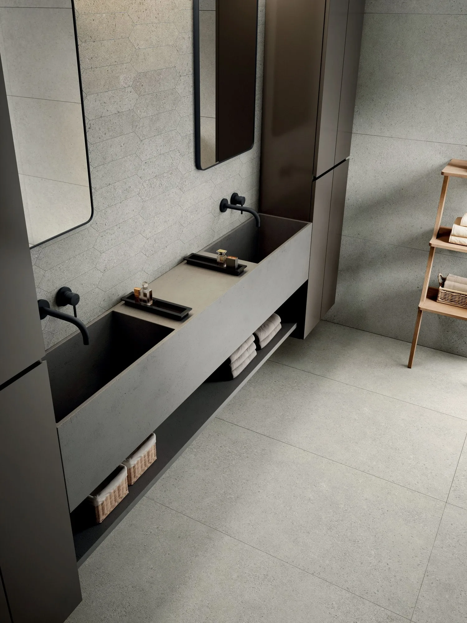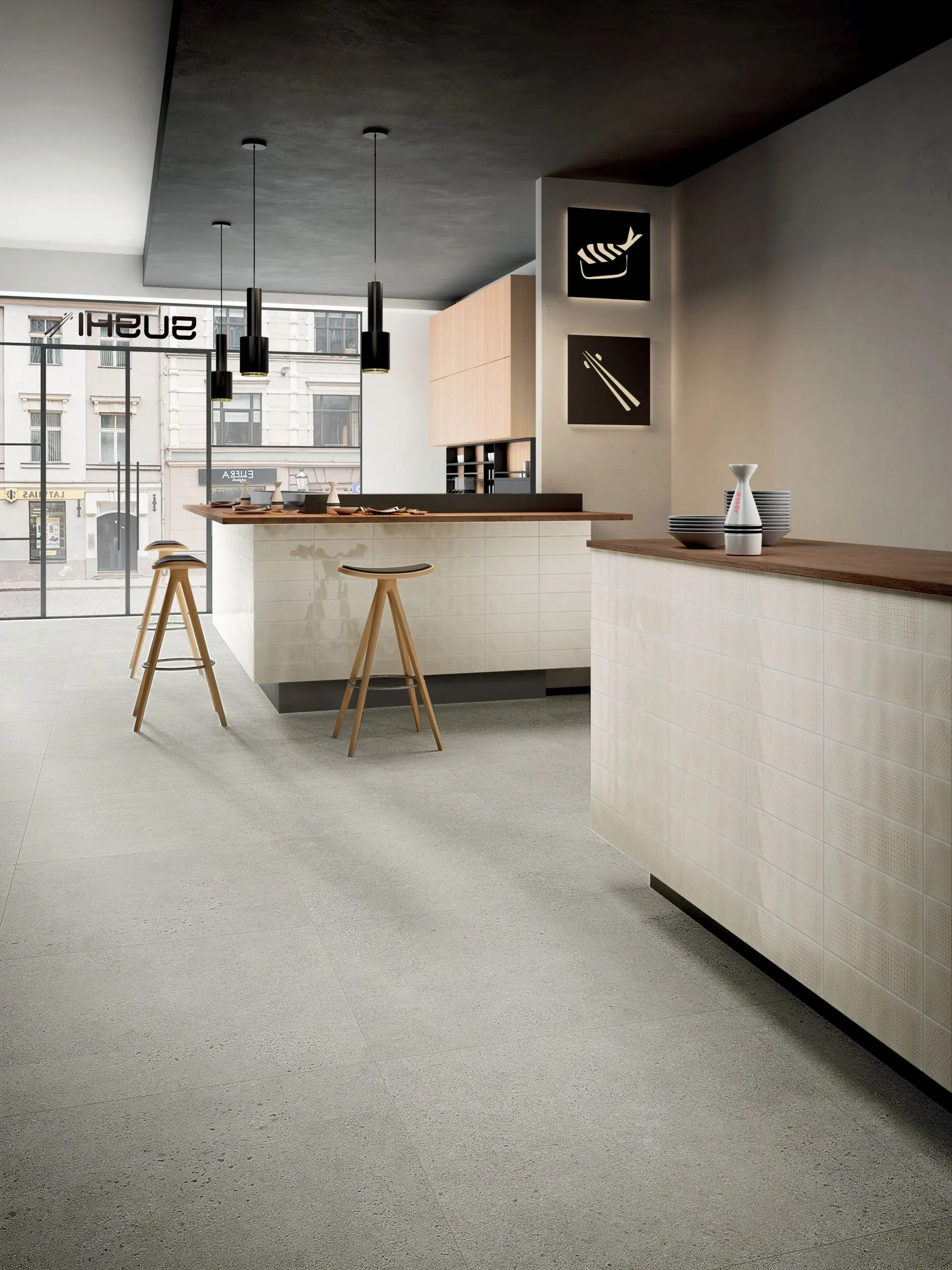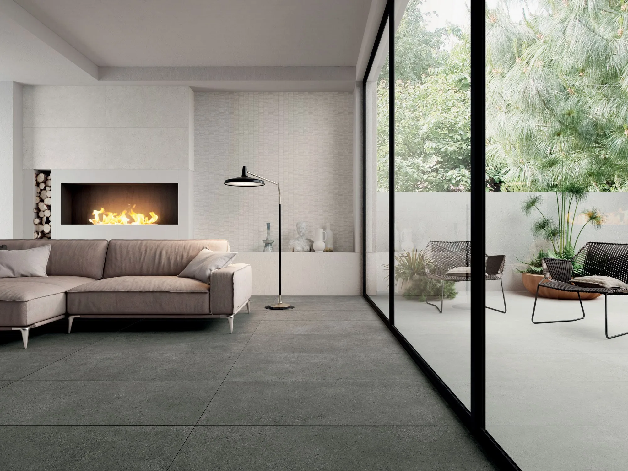 с напольным/ напольным покрытием Deep вставки с каменным эффектом сливаются с бетоном, создавая современную материю, наполненную естественными ссылками. Доступно в различных форматах и цветах