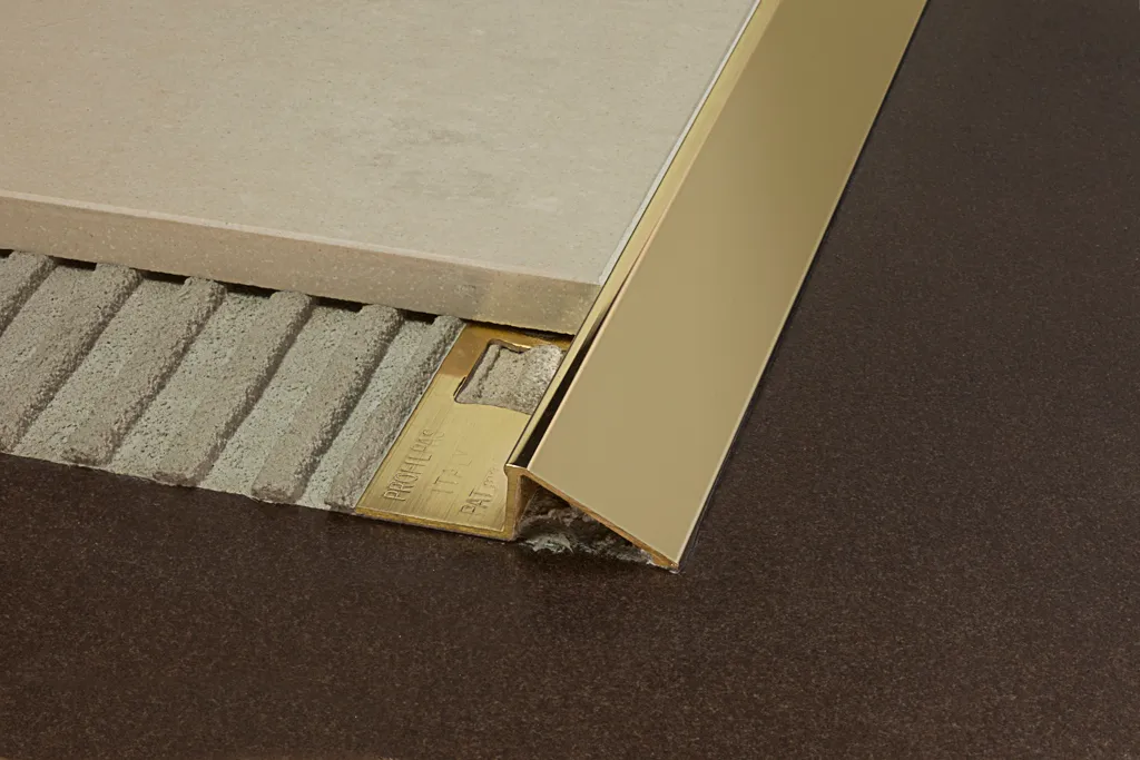 PRONIVEL-это линия торцевых профилей, изготовленных из различных материалов, наклонное сечение которых позволяет соединять различия в уровне при укладке между половами одинакового или различного пола, что позволяет устранить ступень, вызванную различнымтолщиной пола.