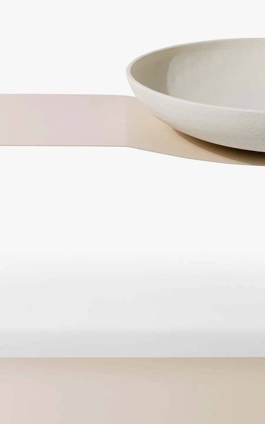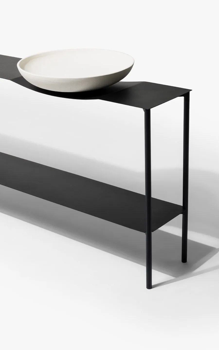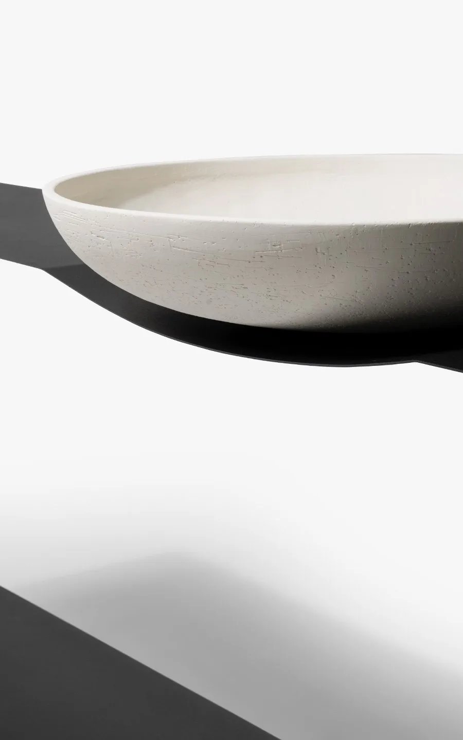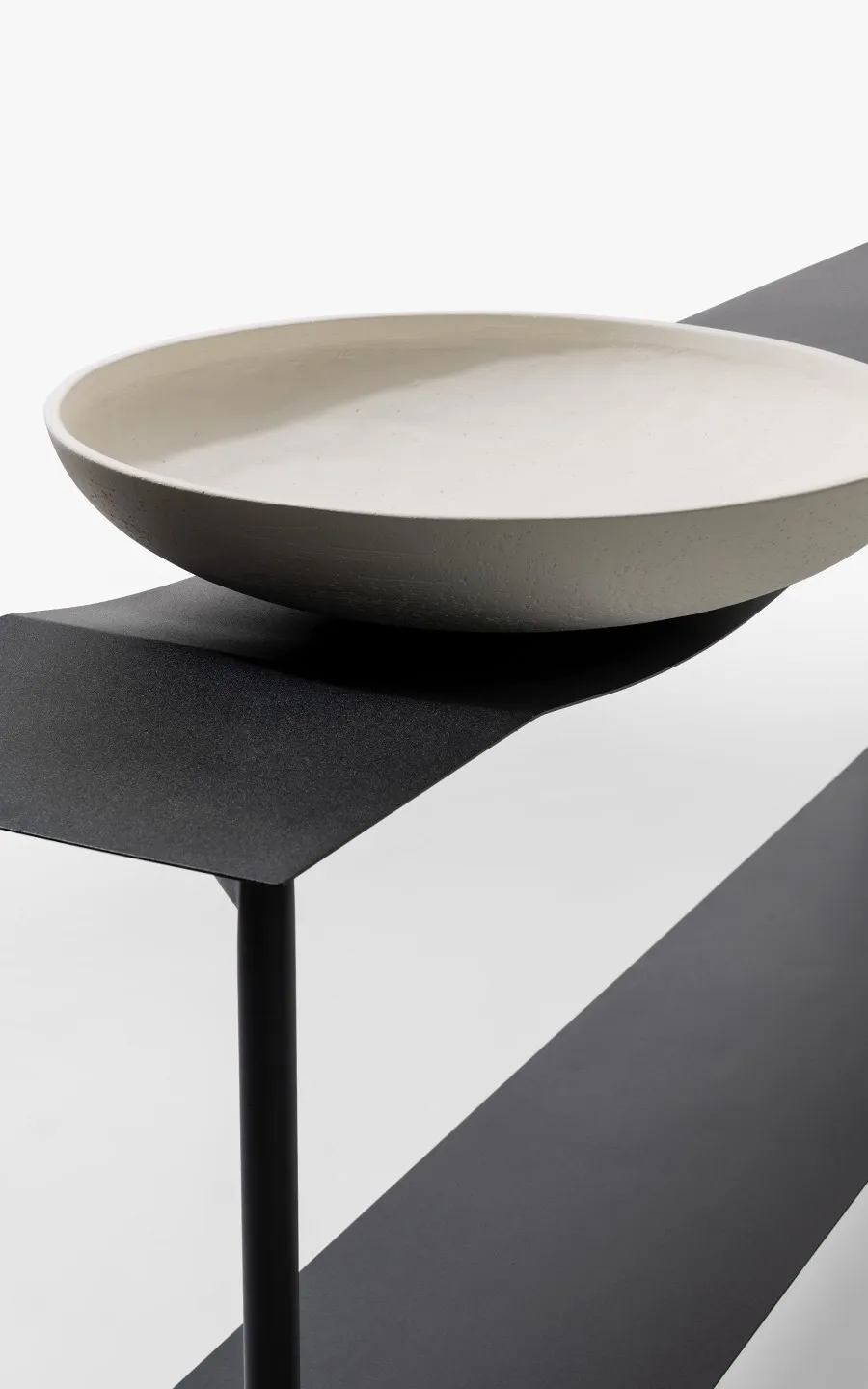 консоль Bowl исследует ощущение движения в статическом объекте. Керамическая чаша, кажется, действует на тонкую металлическую столешницу, которая изогнута, как будто гравитация является частью дизайна. Мало того, что форма сводится к основному, она предлагает среду с большим количеством свободного пространства, так как верх имеет минимальную глубину, необходимую для поддержки повседневных предметов, таких как стаканы, тарелки и книги — а керамическая чаша предлагает простое решение для предметов которые часто разбросаны по столикам, оставляя окружающую среду еще более чистой и легкой.