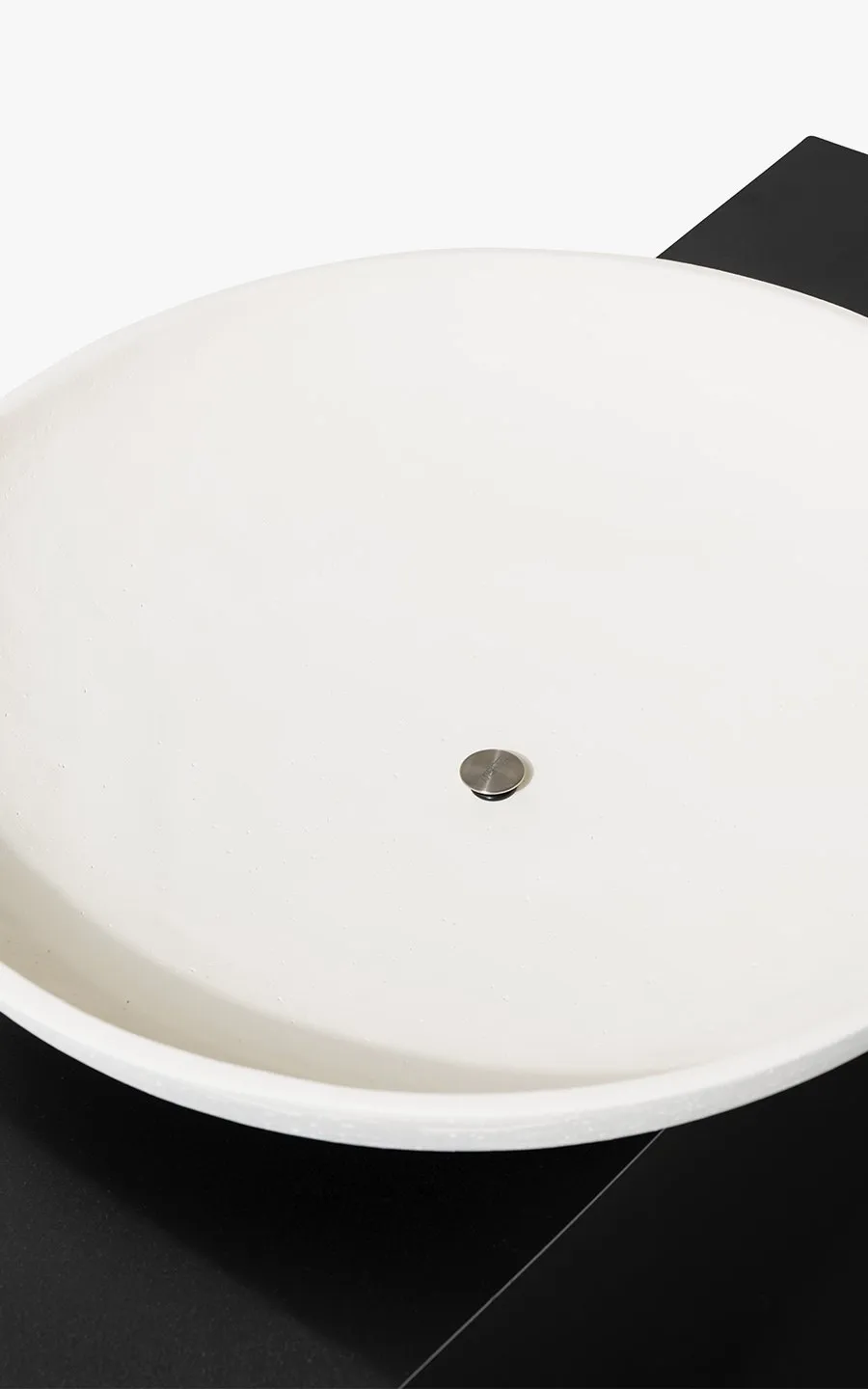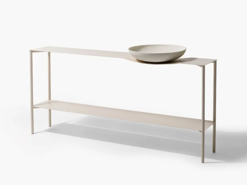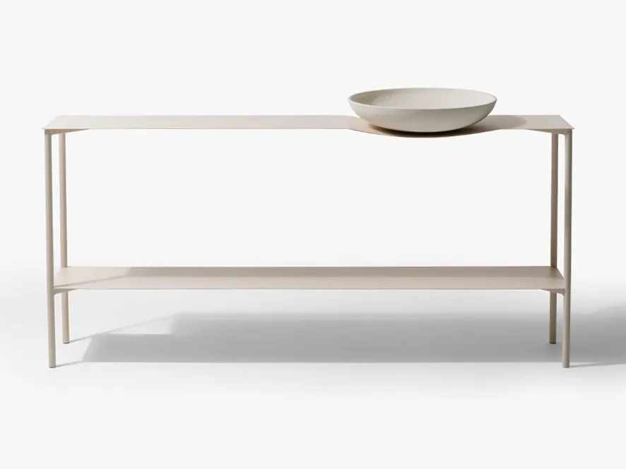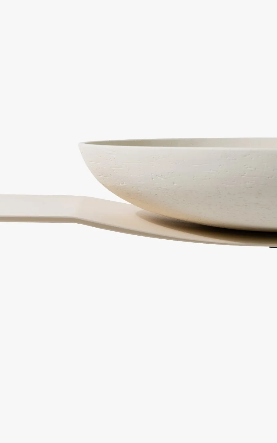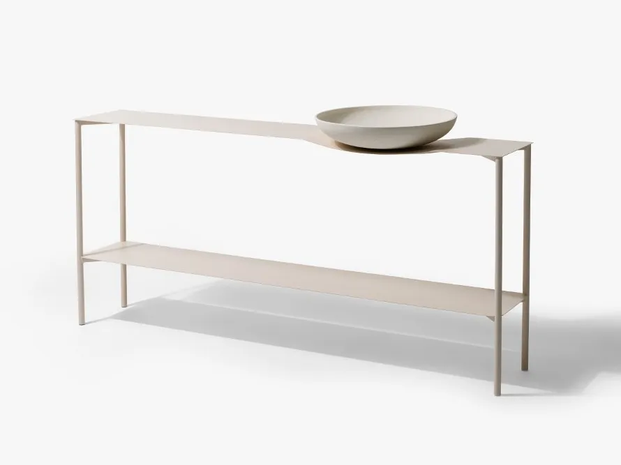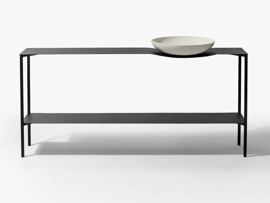 консоль Bowl исследует ощущение движения в статическом объекте. Керамическая чаша, кажется, действует на тонкую металлическую столешницу, которая изогнута, как будто гравитация является частью дизайна. Мало того, что форма сводится к основному, она предлагает среду с большим количеством свободного пространства, так как верх имеет минимальную глубину, необходимую для поддержки повседневных предметов, таких как стаканы, тарелки и книги — а керамическая чаша предлагает простое решение для предметов которые часто разбросаны по столикам, оставляя окружающую среду еще более чистой и легкой.