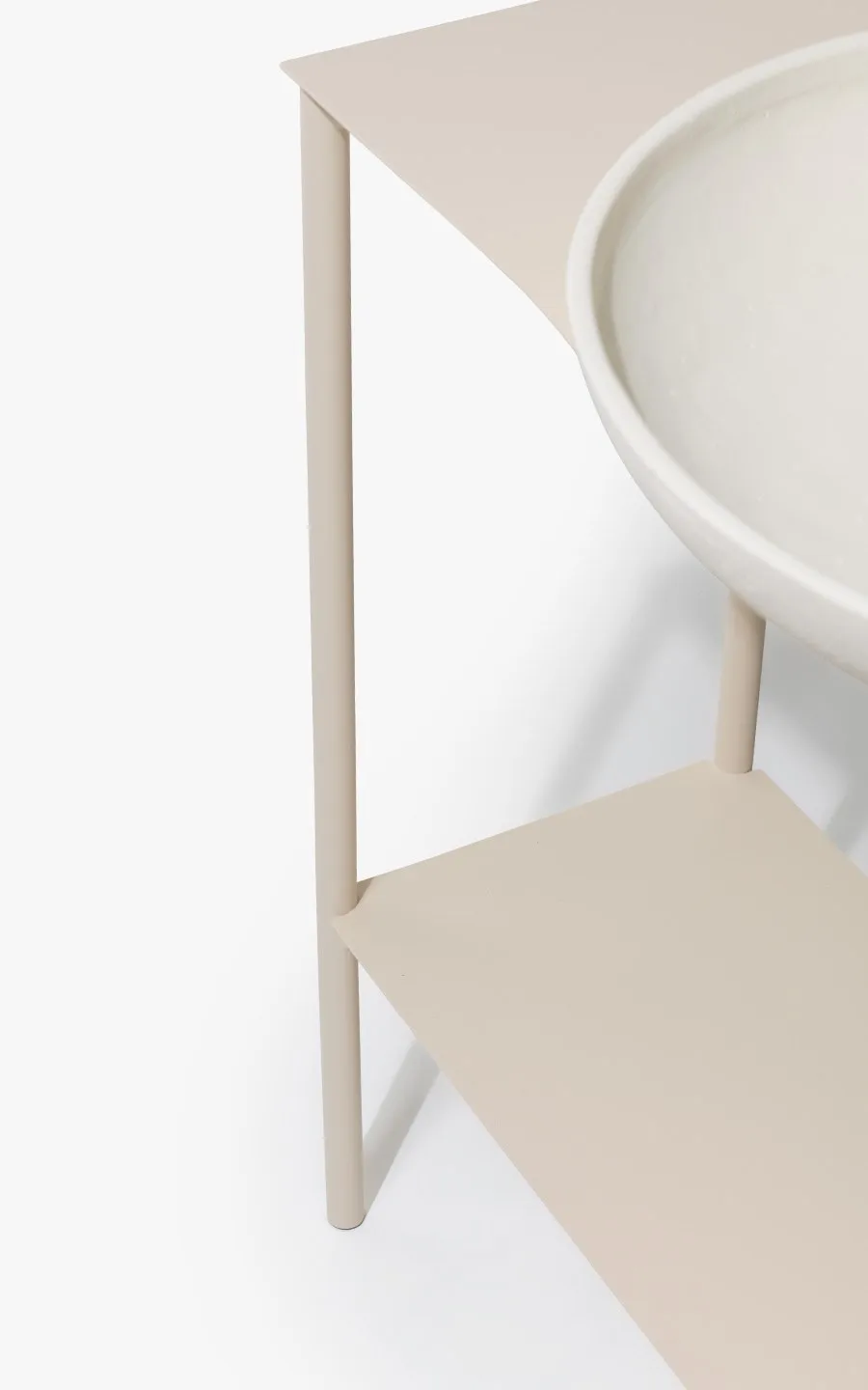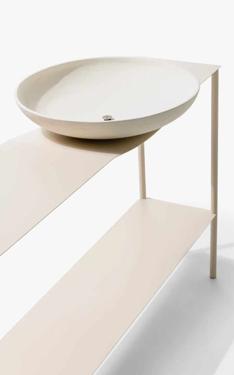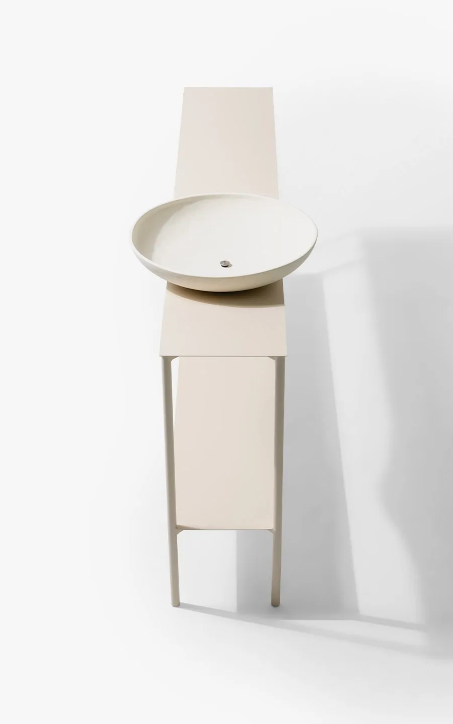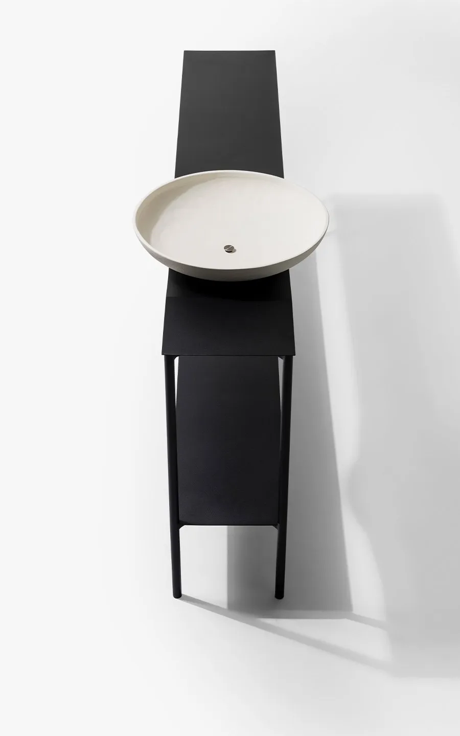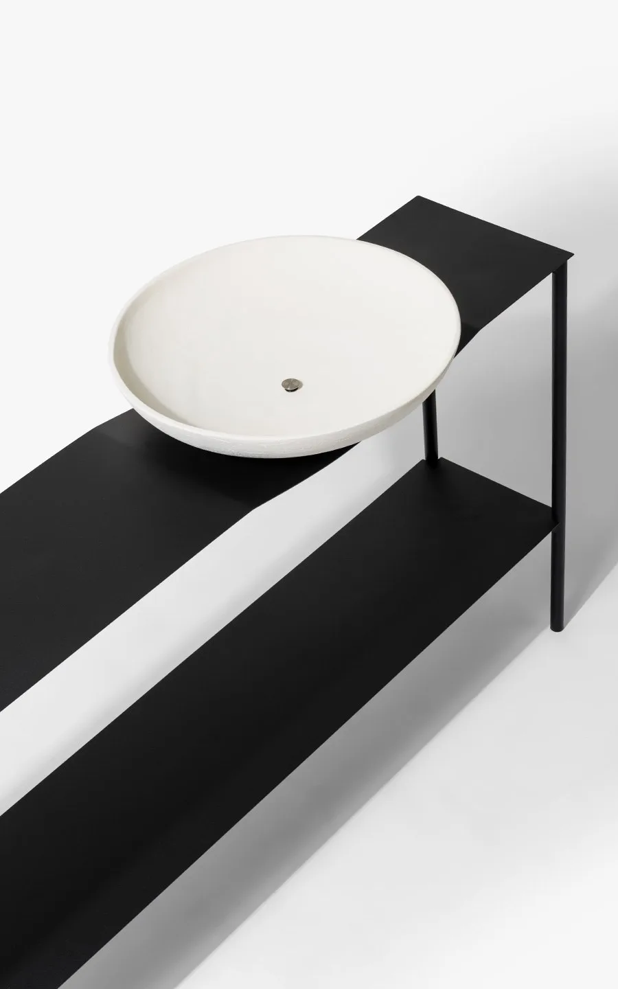 консоль с многофункциональной ванной. Текстурированная стальная структура и столешница с порошковым покрытием. Керамическая чаша ручной работы.