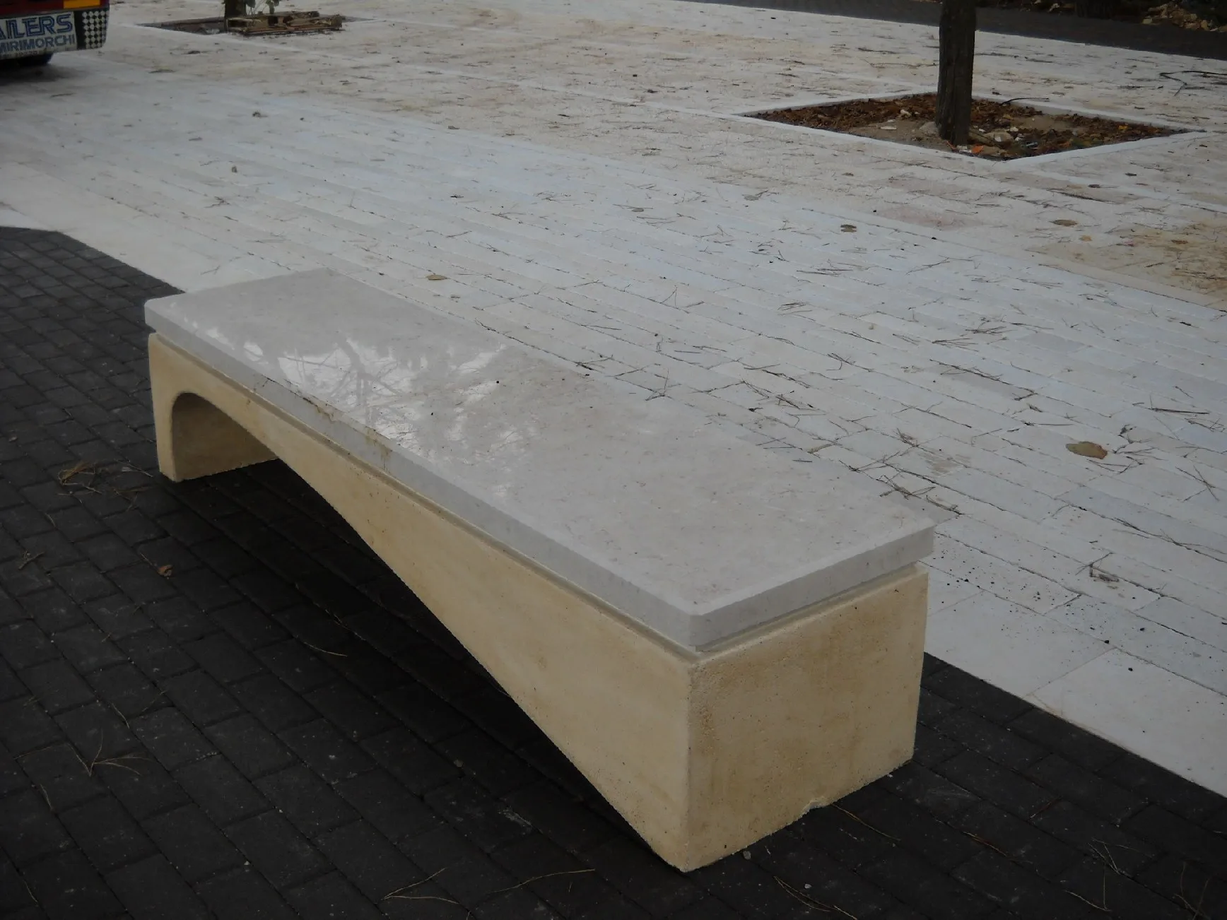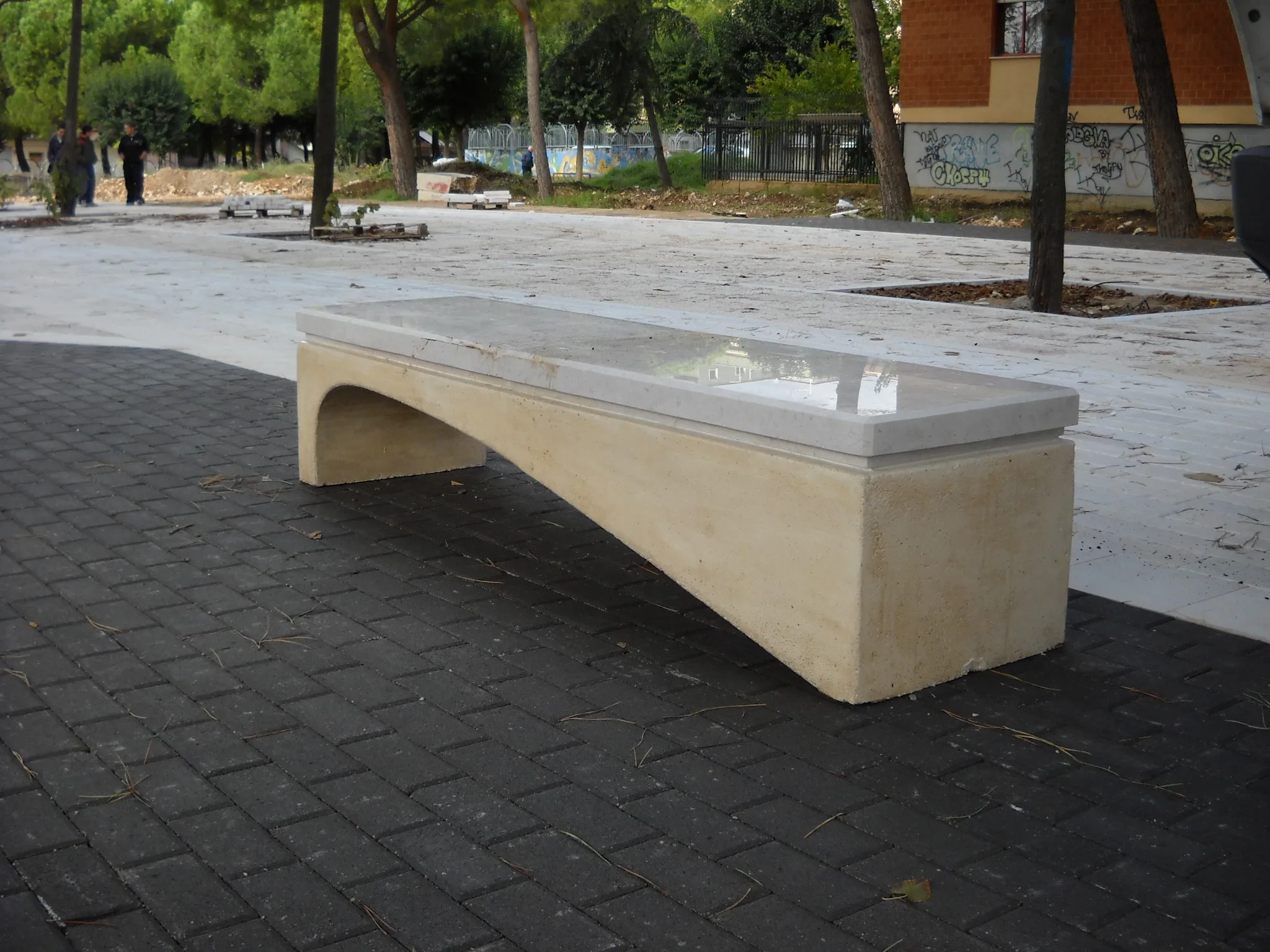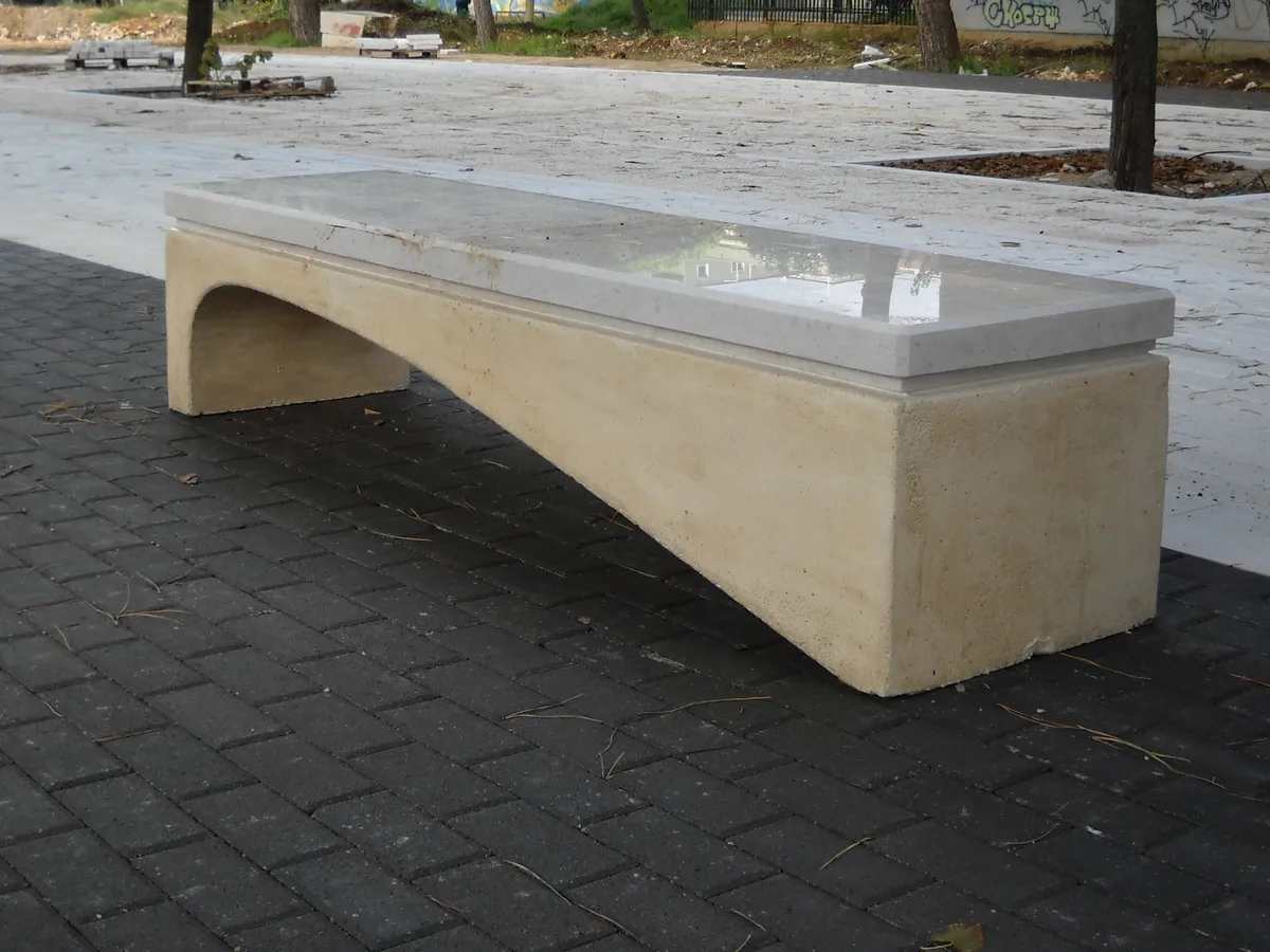 волна изготовлена из восстановленных каменных опор, окрашенных в массе неорганическими пигментами Bayferrox компании Bayer. Отделка достигается путем промывки изделия с последующим нанесением водоотталкивающих красок. Верх сиденья выполнен из камня Apricena с полированной отделкой.