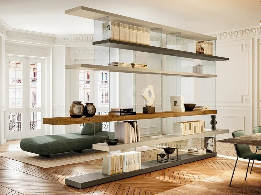 перечитывание пространства, которое изменяет соотношение полного и пустого. Книжный шкаф Air, подвешенный на стеклянных опорах, кажется, плавает в воздухе, позволяя свету фильтровать и придавая ощущение чрезвычайной легкости окружающей среде. В прозрачности стекла рождаются толстые полки и функциональные контейнеры, поддерживаемые скрытой системой крепления, которая гарантирует стабильность и безопасность конструкции. Свободный от ограничений по размеру и размещаемый в центре комнаты, книжный шкаф становится архитектурным мимезисом, который разделяет пространства, поднимаясь до потолка.
