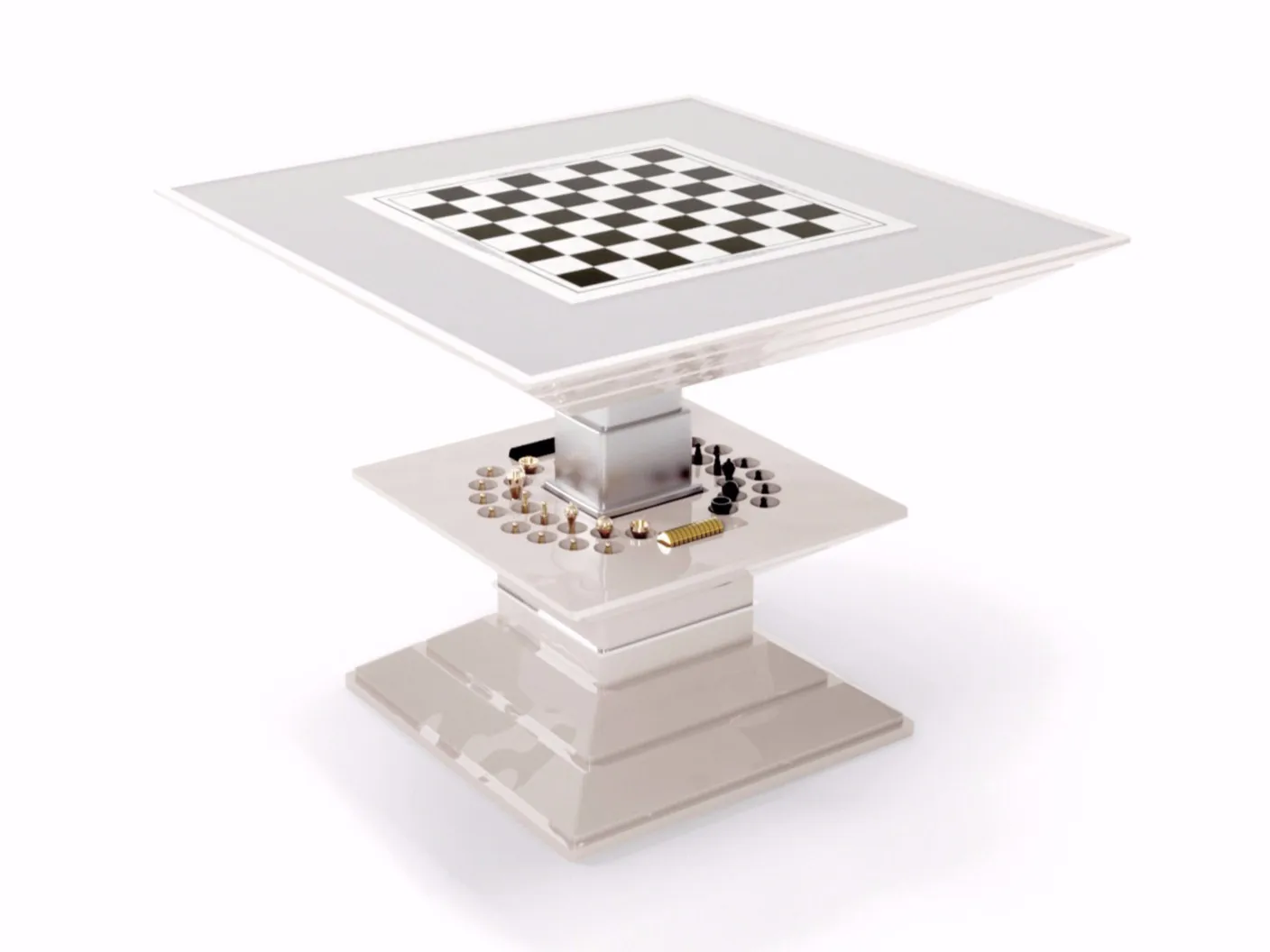 современный стиль и соблазнительная сила-вот характеристики, отраженные в каждой детали шахматного стола Vismara. Этот журнальный столик-это настоящее произведение искусства, которое можно использовать в различных режимах. Механизм подъема усиливается перезаряжаемой литиевой батареей непосредственно от домашнего тока; движение управляется с помощью кнопки, расположенной сбоку, или с помощью дополнительного пульта дистанционного управления. Внутри находятся шахматы, шашки для шашки и нарды. Шахматная доска элегантно инкрустирована черным и перламутровым деревом и покрыта закаленным стеклом. Все шахматные шашки, выкованные из анодированного алюминия, были разработаны исключительно Vismara, в результате чего были созданы уникальные и неповторимые фигуры. Кроме того, вы можете иметь сложный и функциональный лоток, разработанный и инкрустированный в качестве пианино для игры в нарды. Уникальность этого роскошного предмета заключается в его универсальности, что позволяет использовать его как простой журнальный столик или как профессиональный игровой стол.